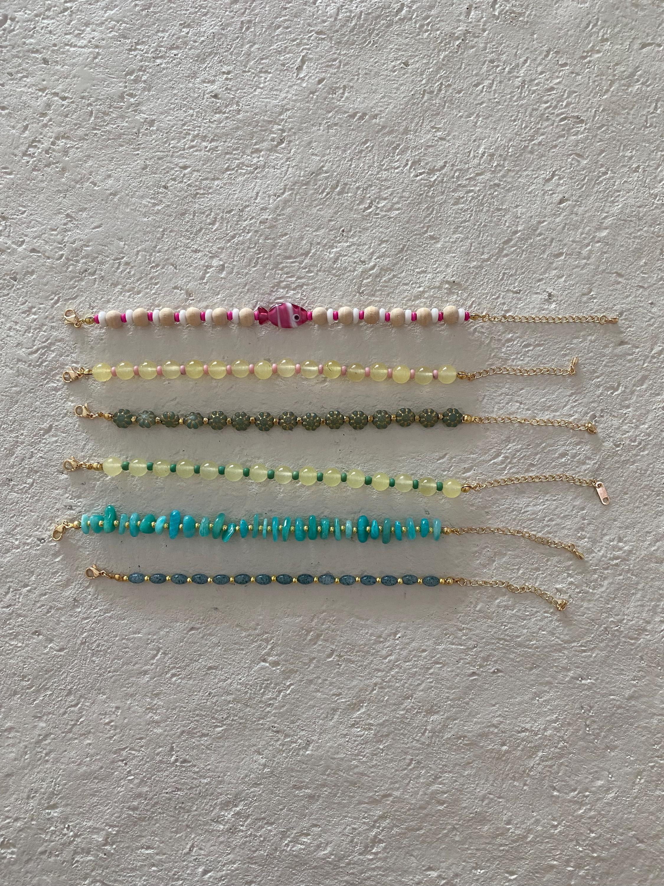 Our jewelry is handcrafted using glass beads, natural stones, wood, and 14k gold plated or stainless steel components. Every piece is made with quality and durability in mind.