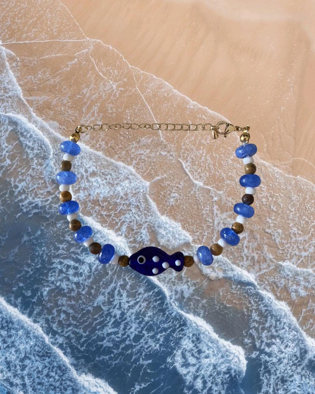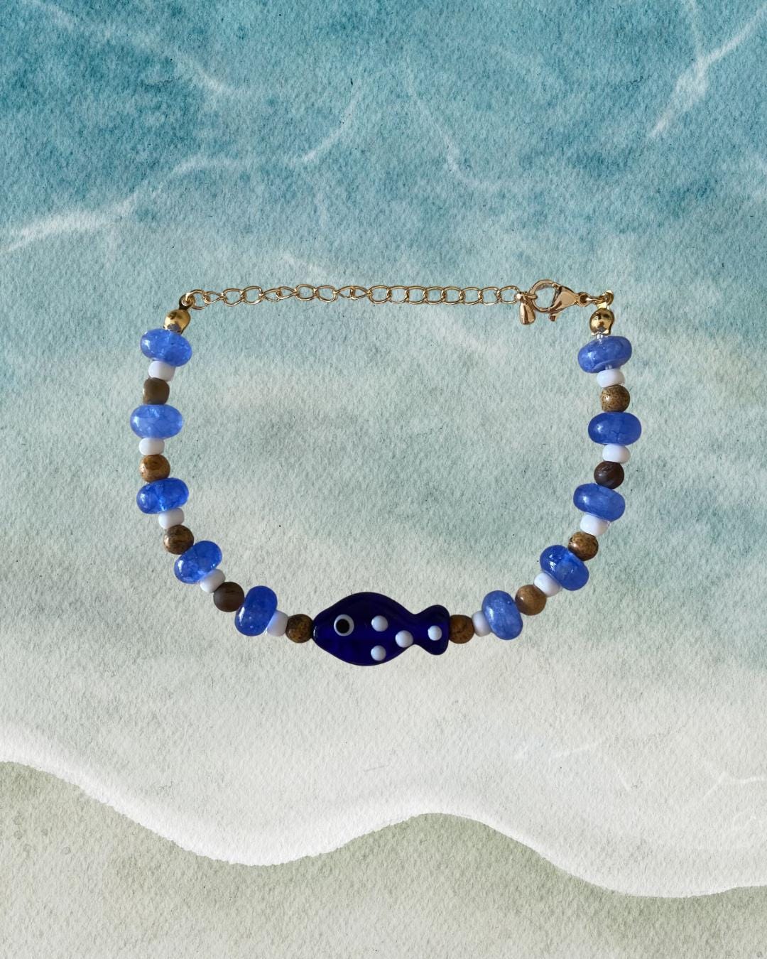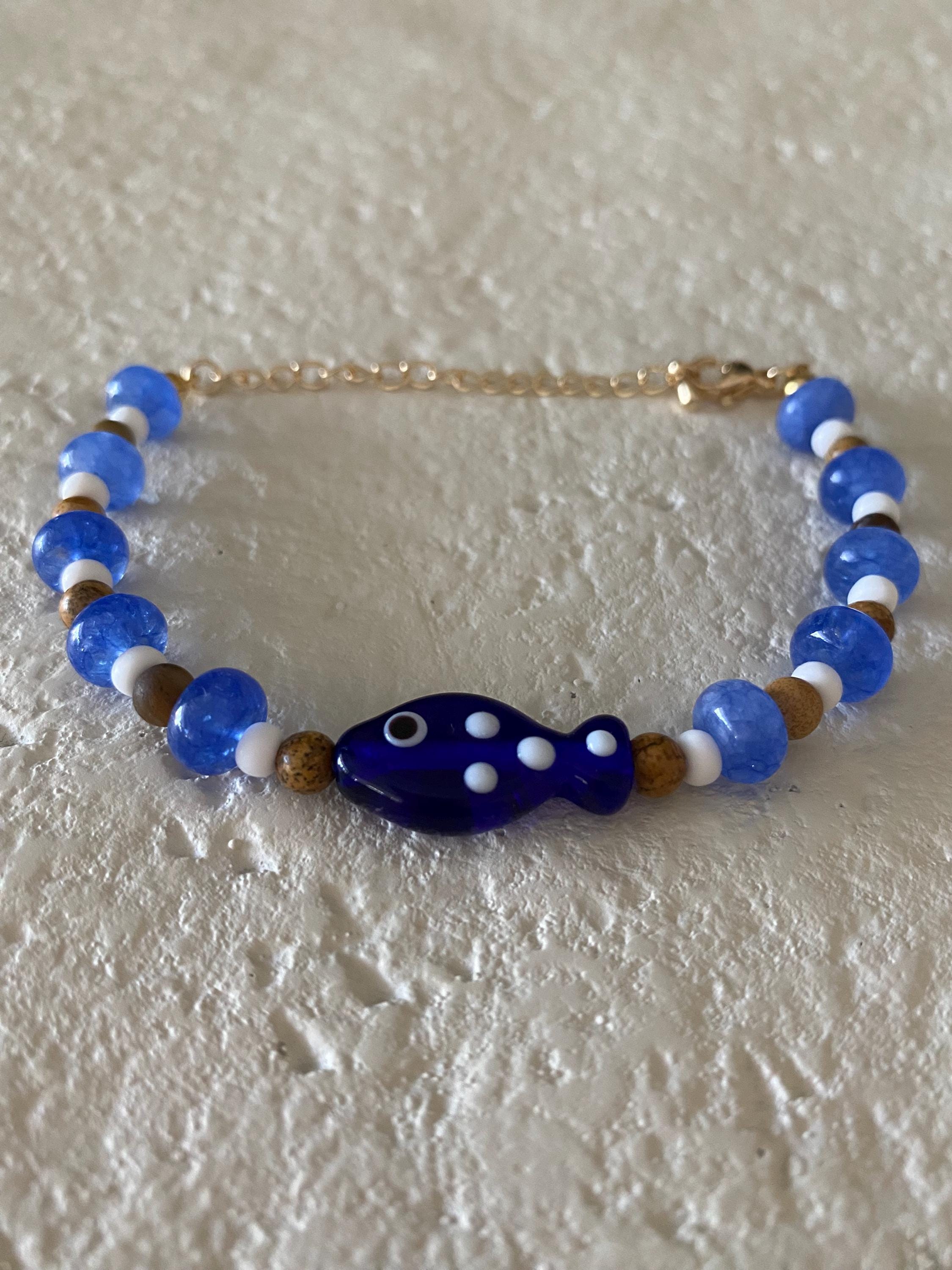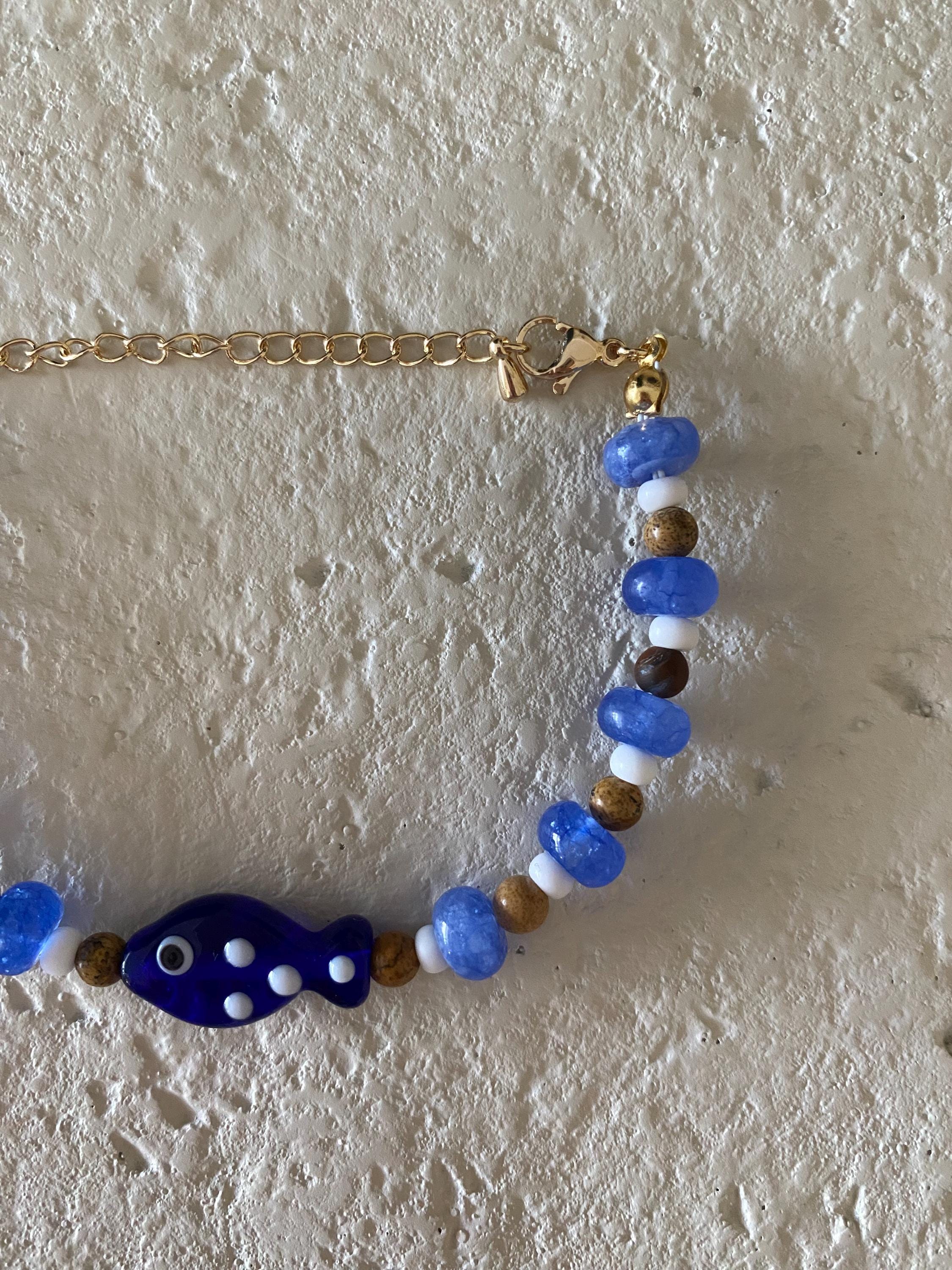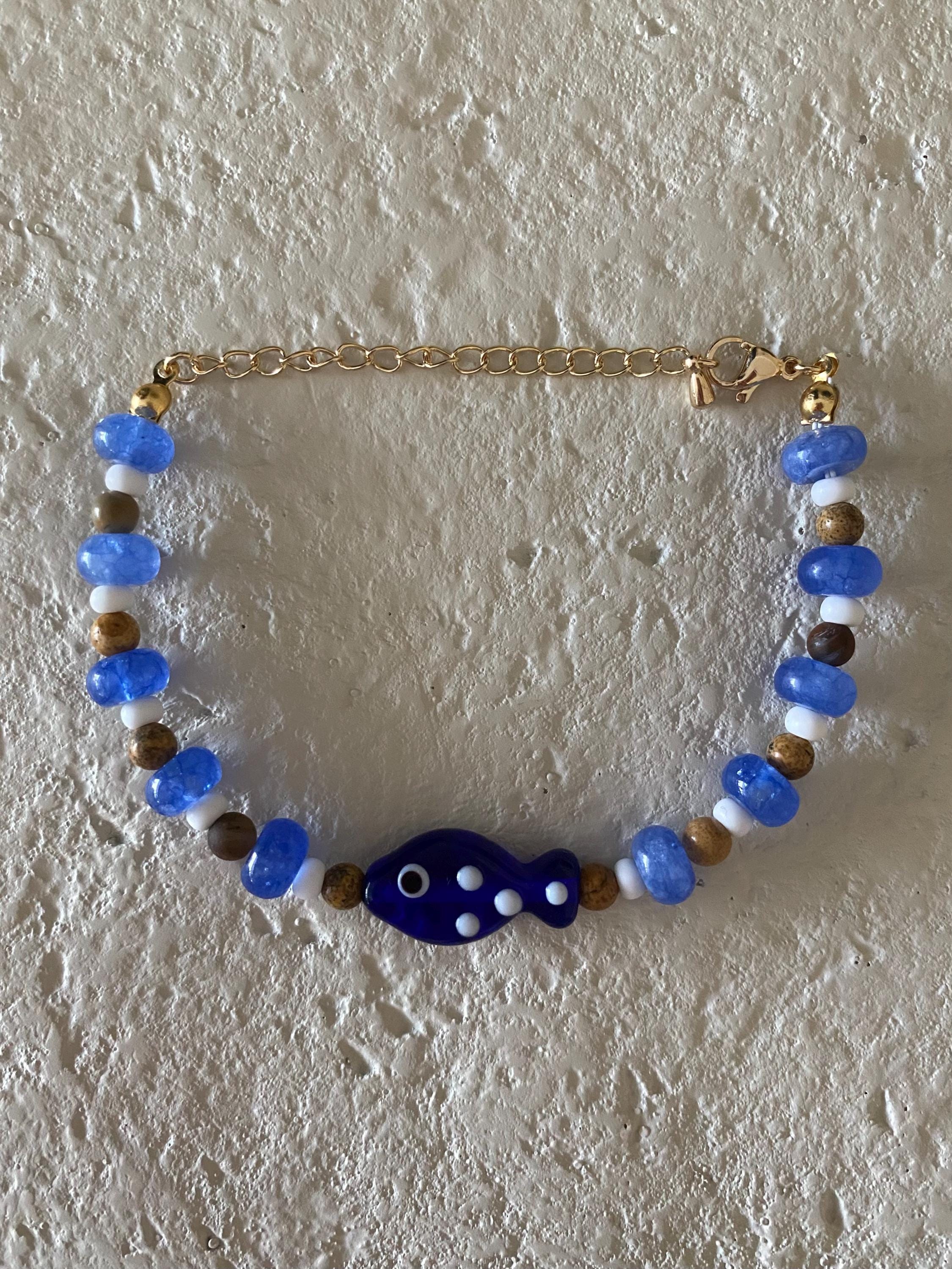 • Materials: Tigers eye, navy beads, white seed beads & glass fish charm