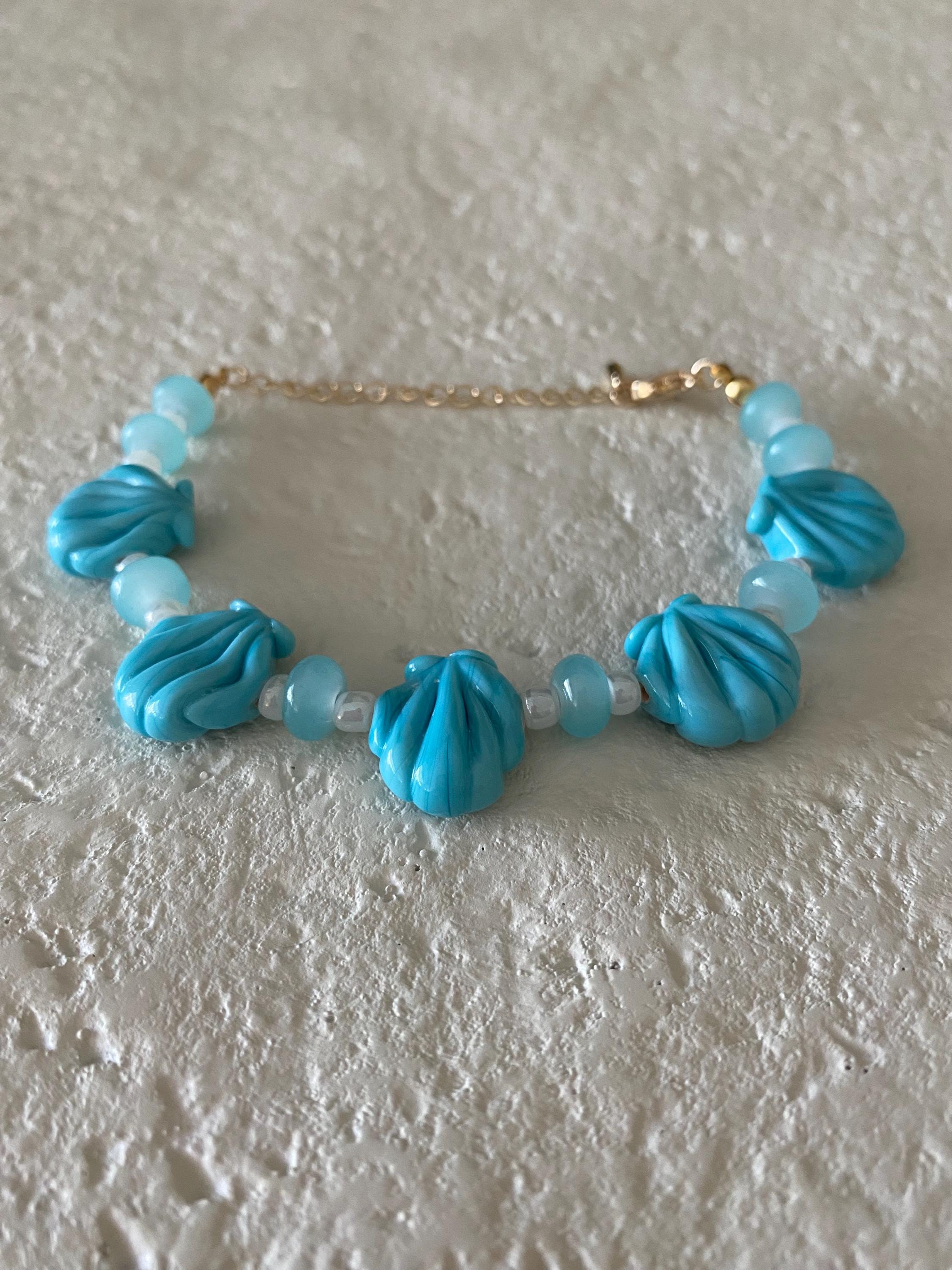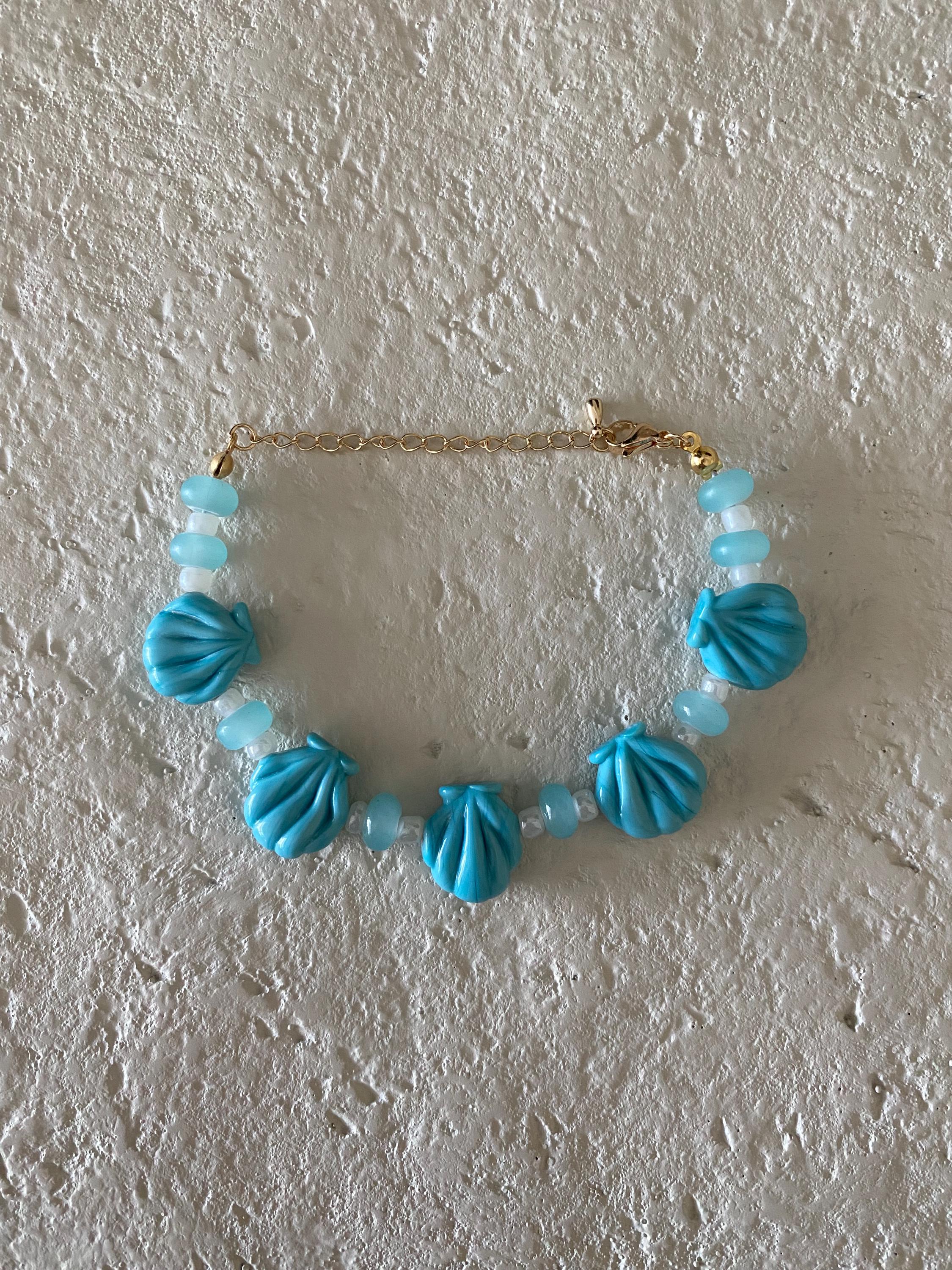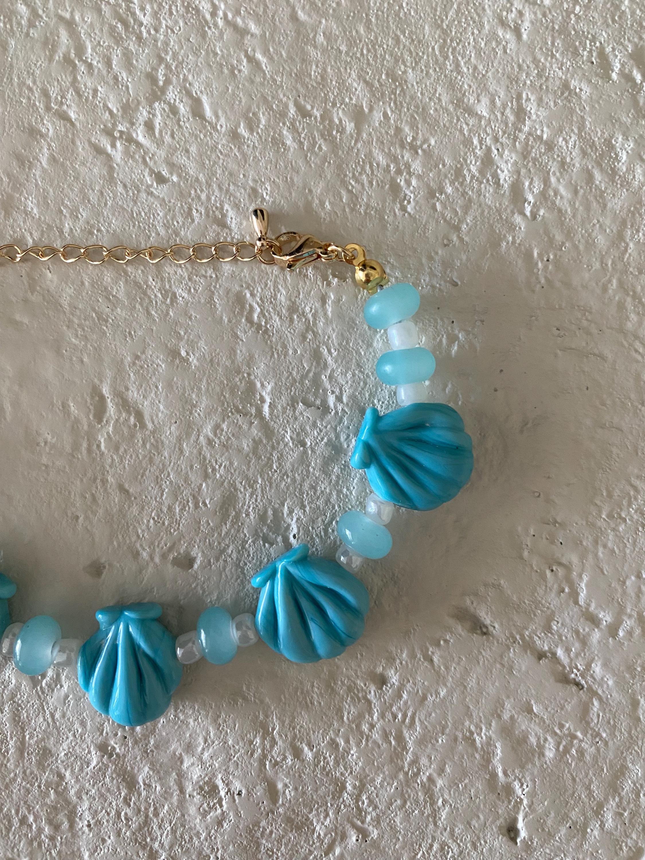 • Materials: Blue rondelle beads, seed beads & glass clam shell charm