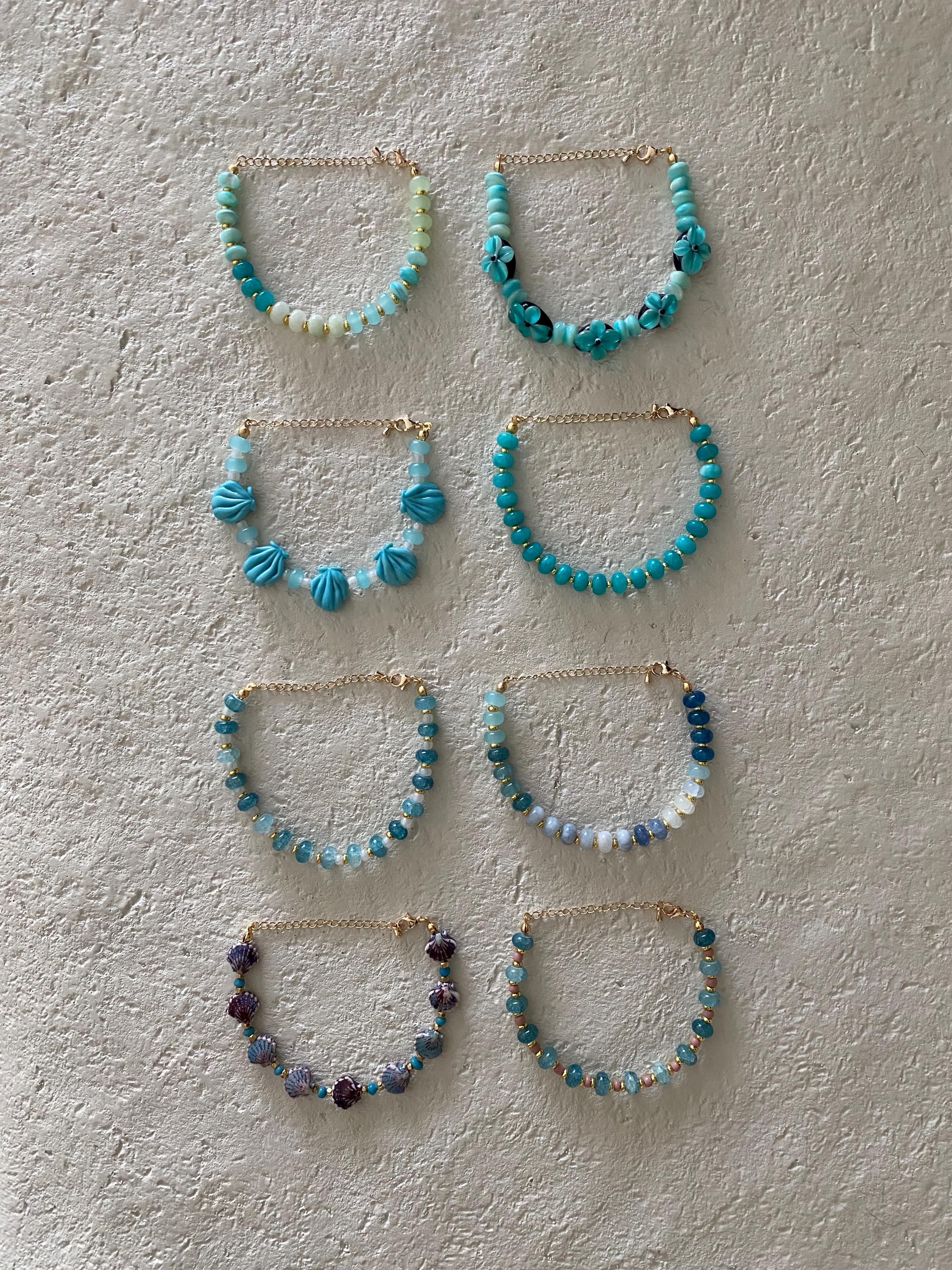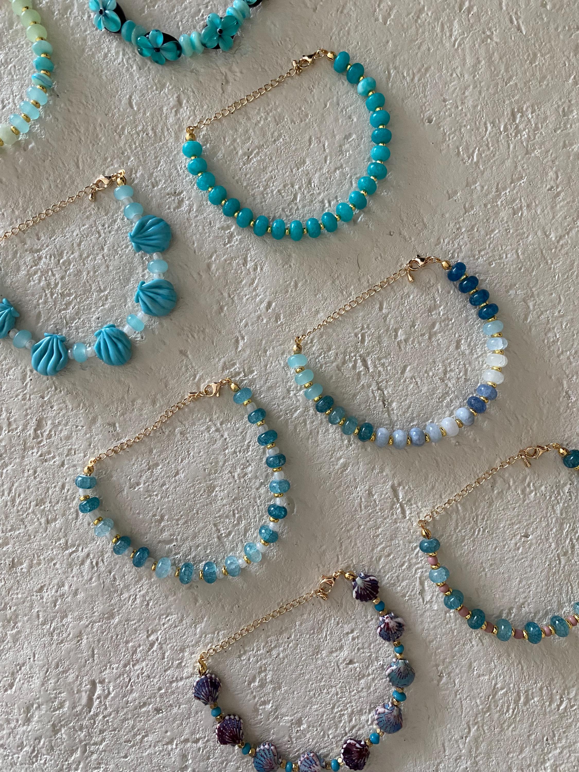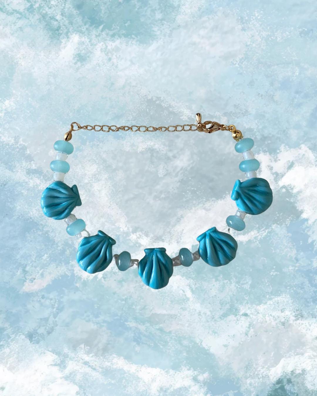 • Materials: Blue rondelle beads, seed beads & glass clam shell charm