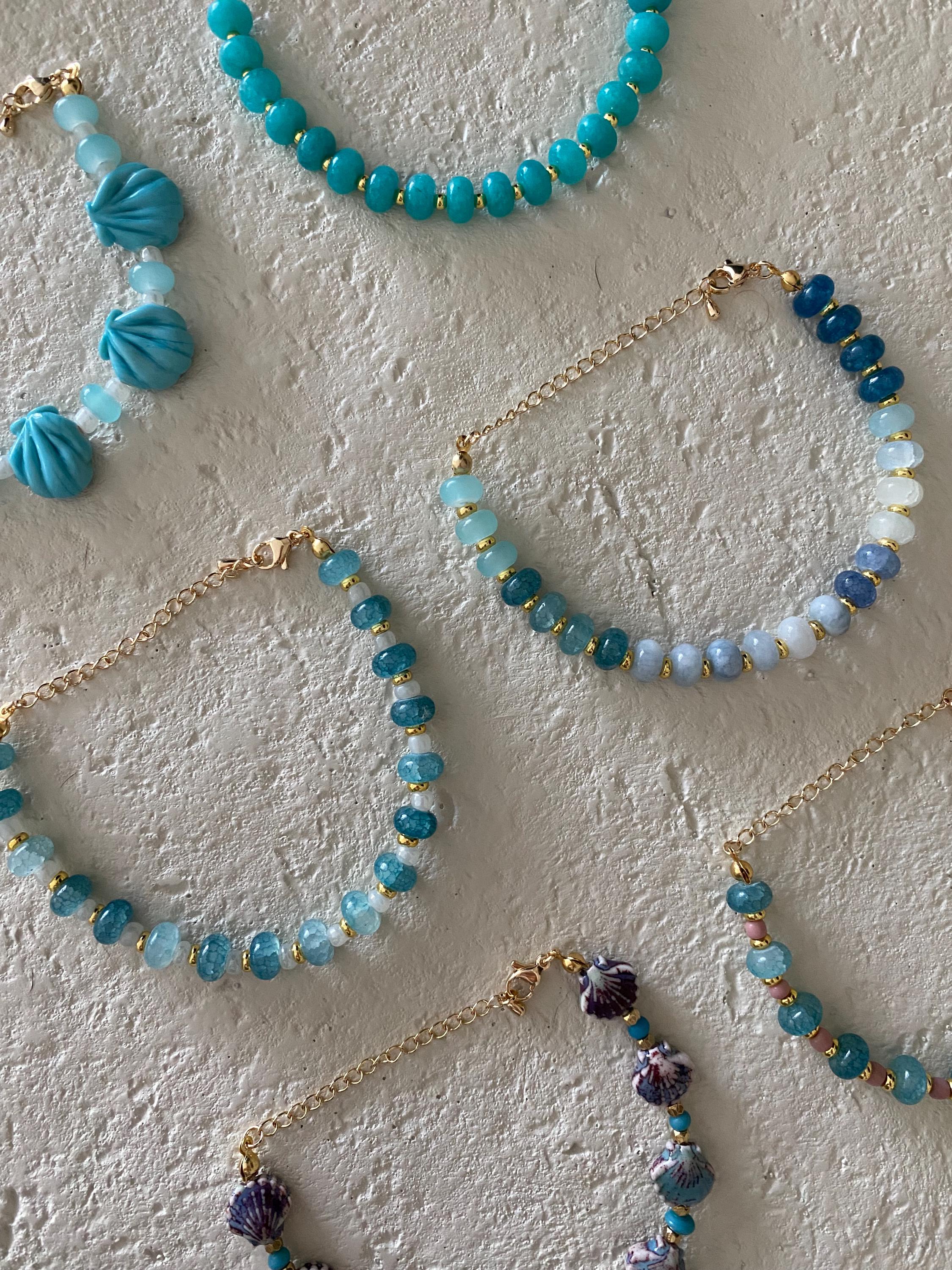 Our jewelry is handcrafted using glass beads, natural stones, wood, and 14k gold plated or stainless steel components. Every piece is made with quality and durability in mind.