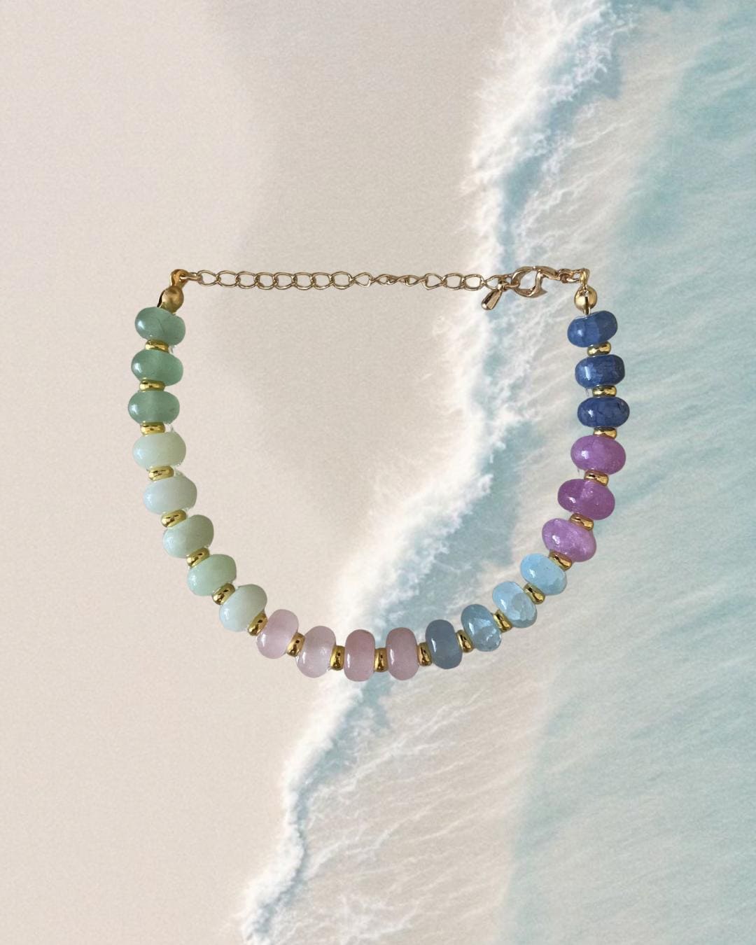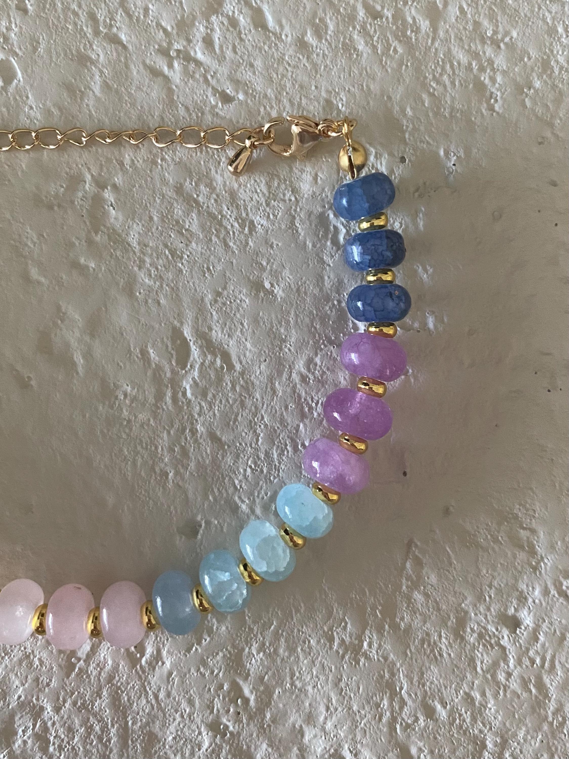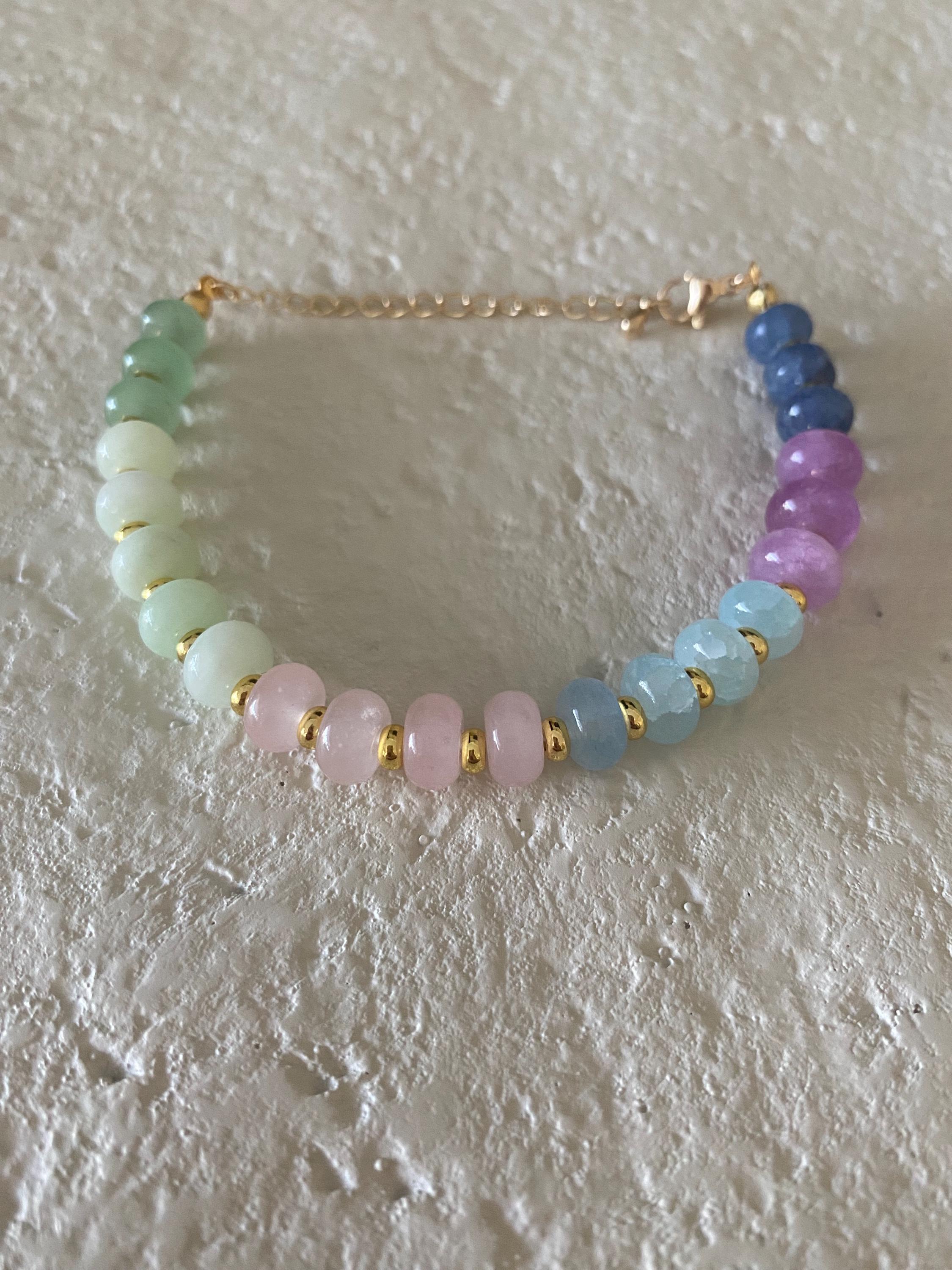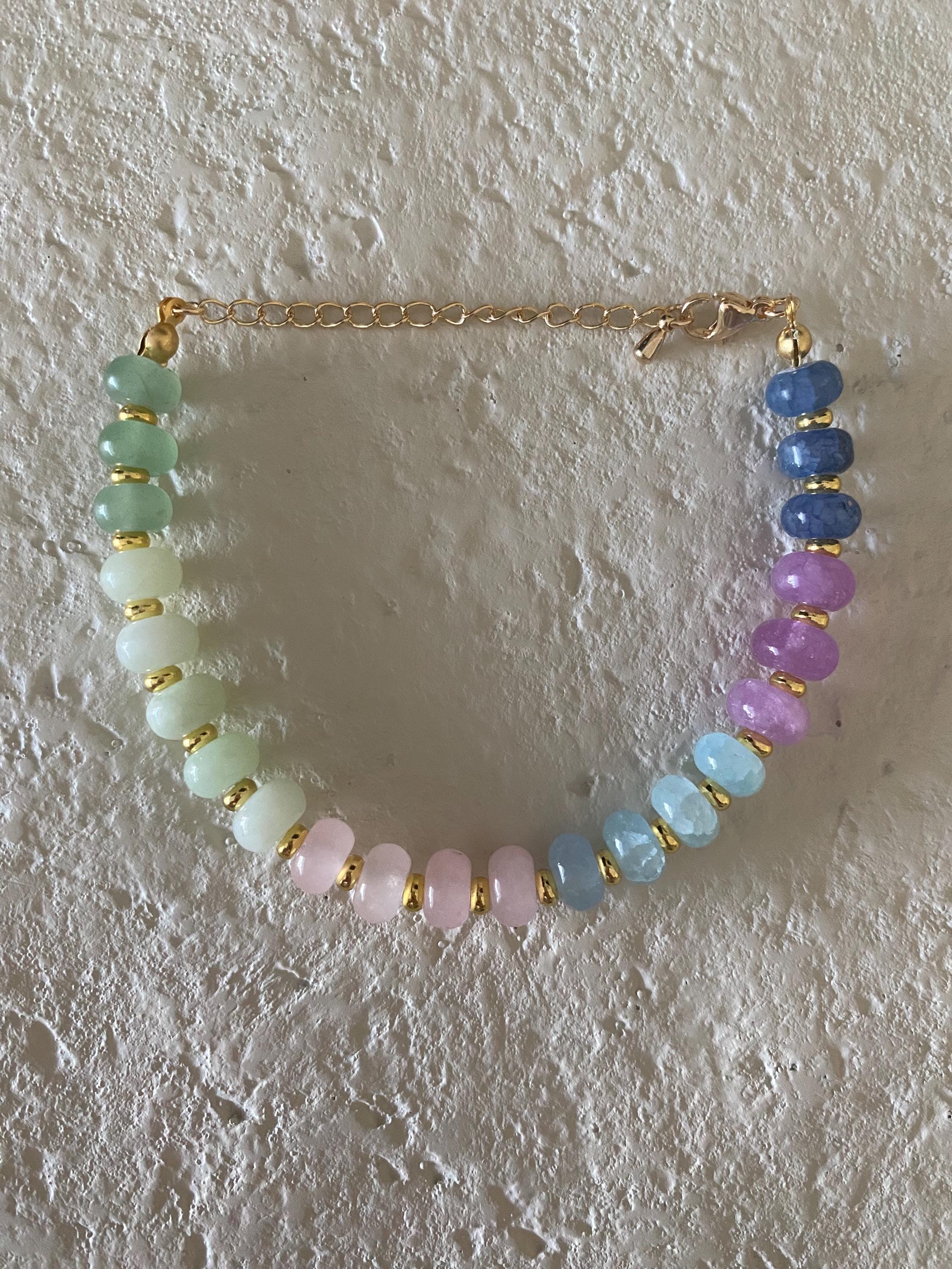 • Materials: Blue, green, pink & purple rondelle beads & gold plated beads