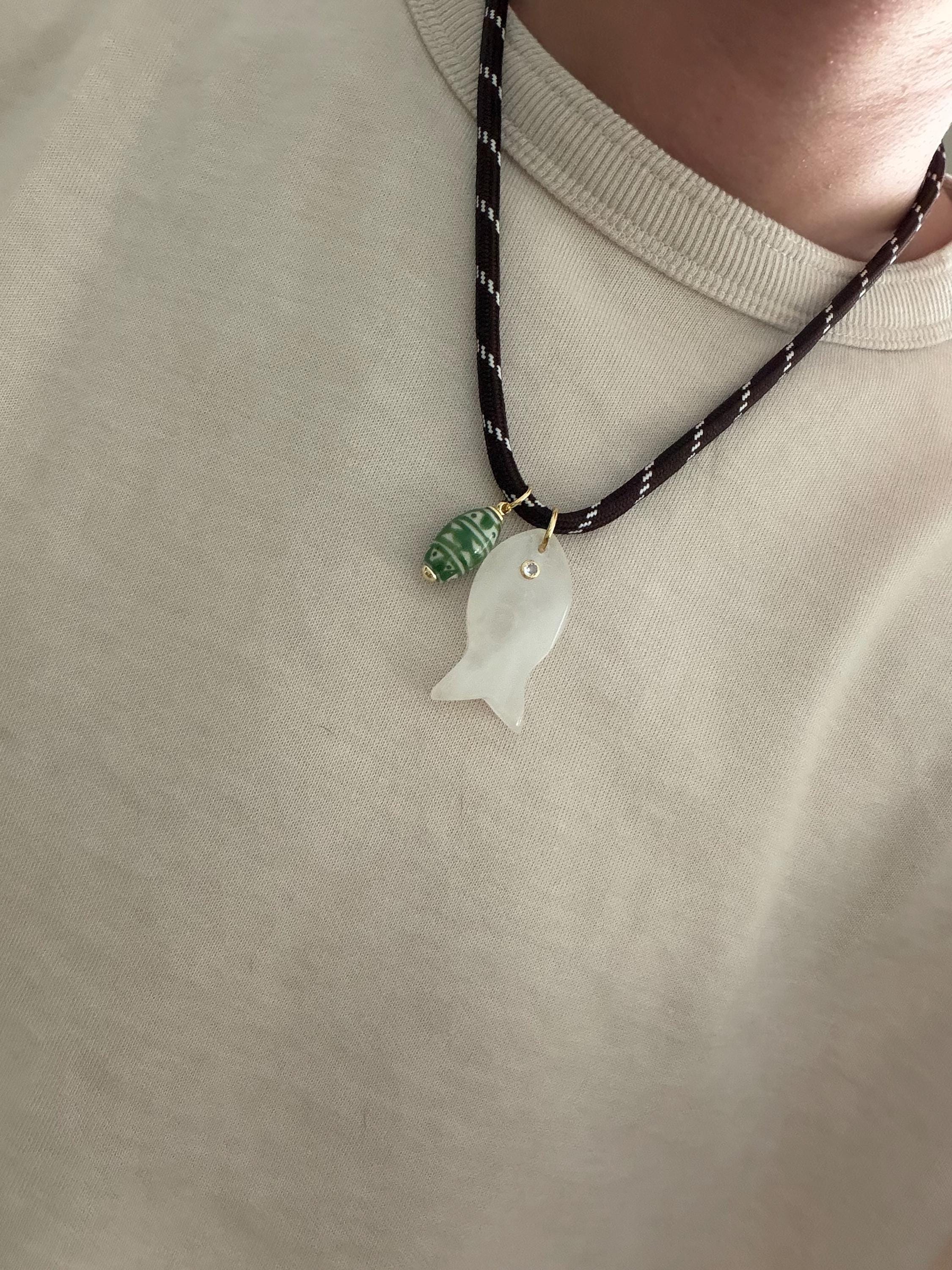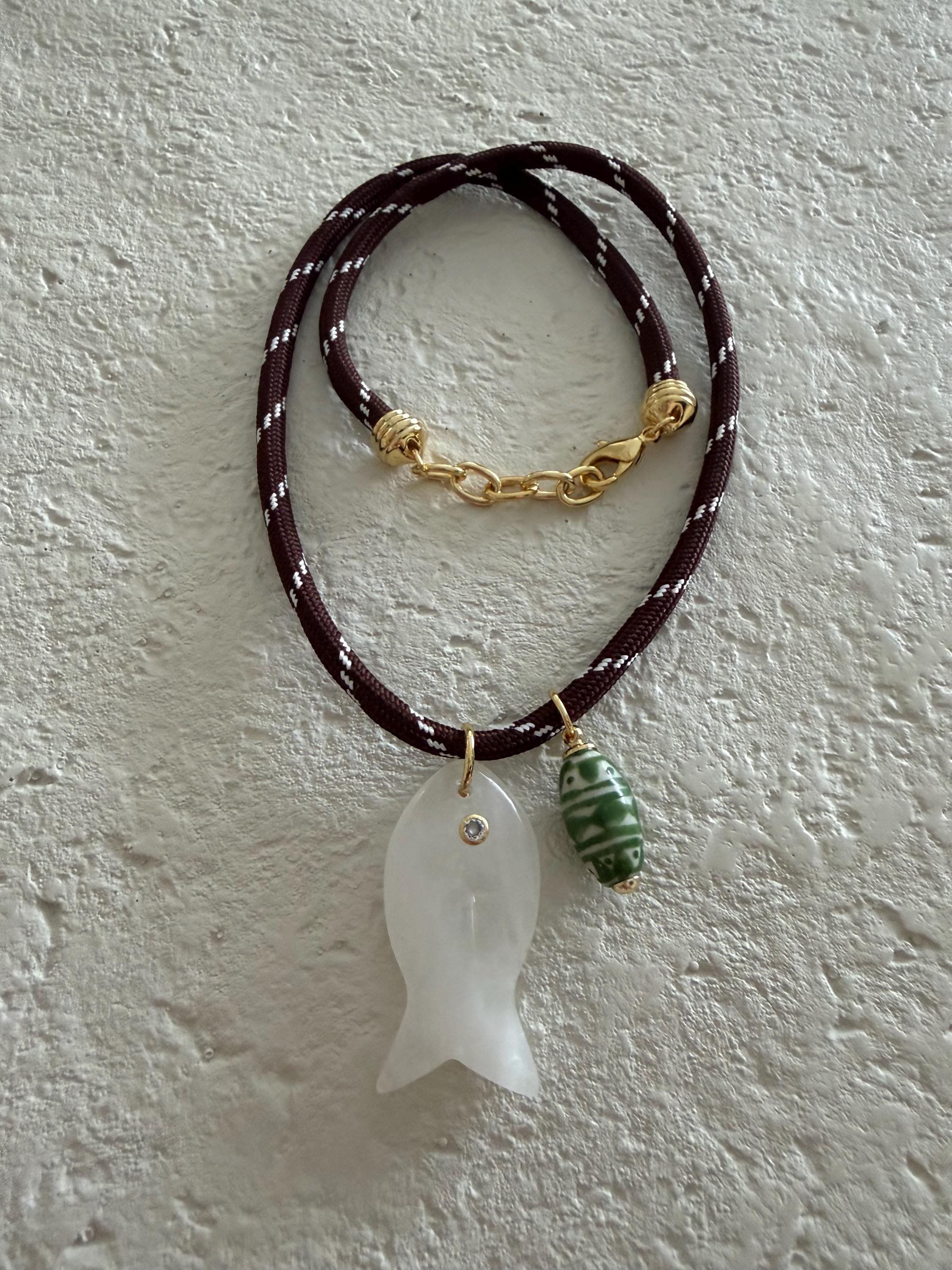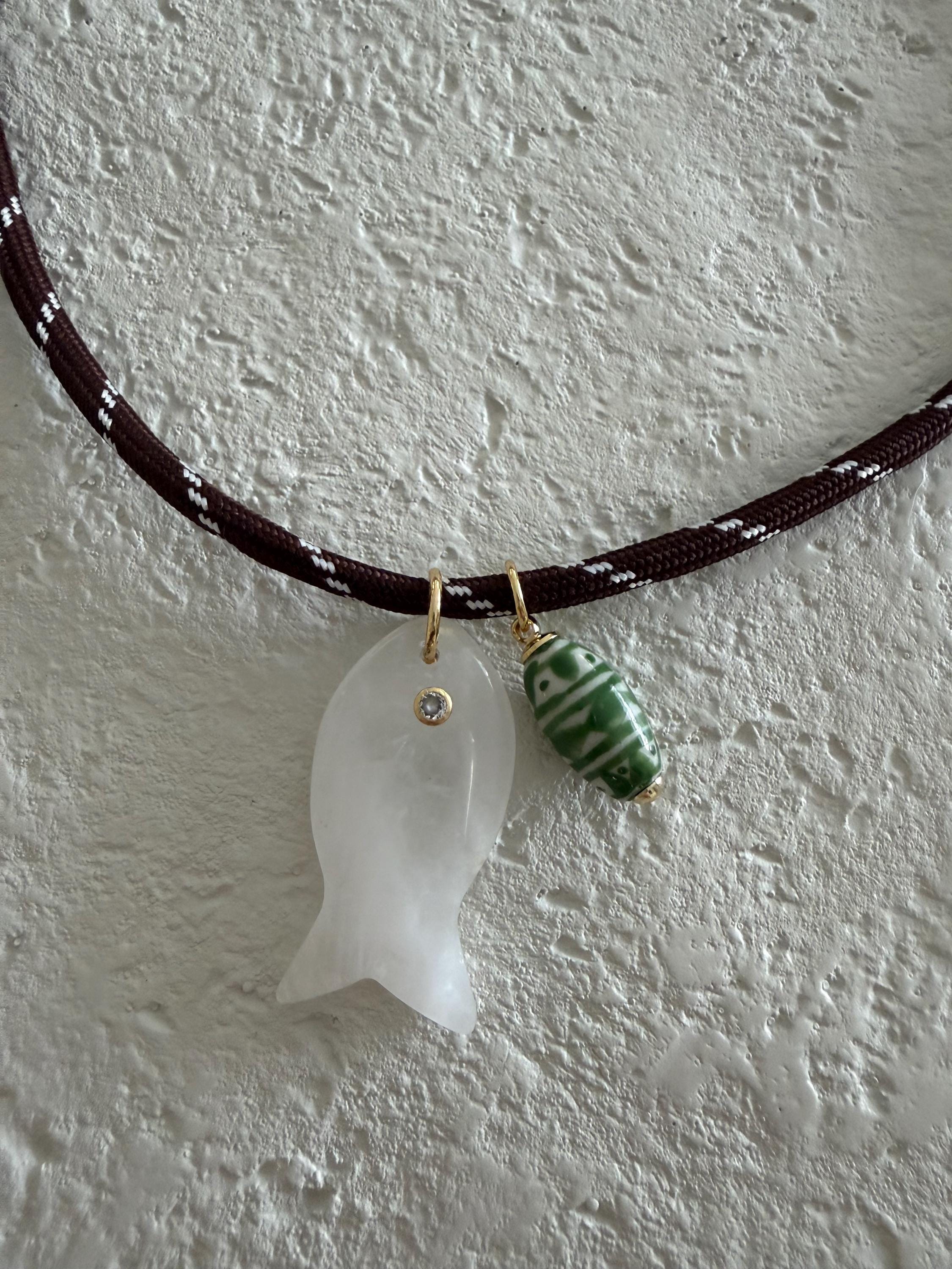 • Materials: 18k gold filled 38.8mm clear quartz gemstone fish pendant (gemstones coloring may vary), ceramic pendant & brown cord