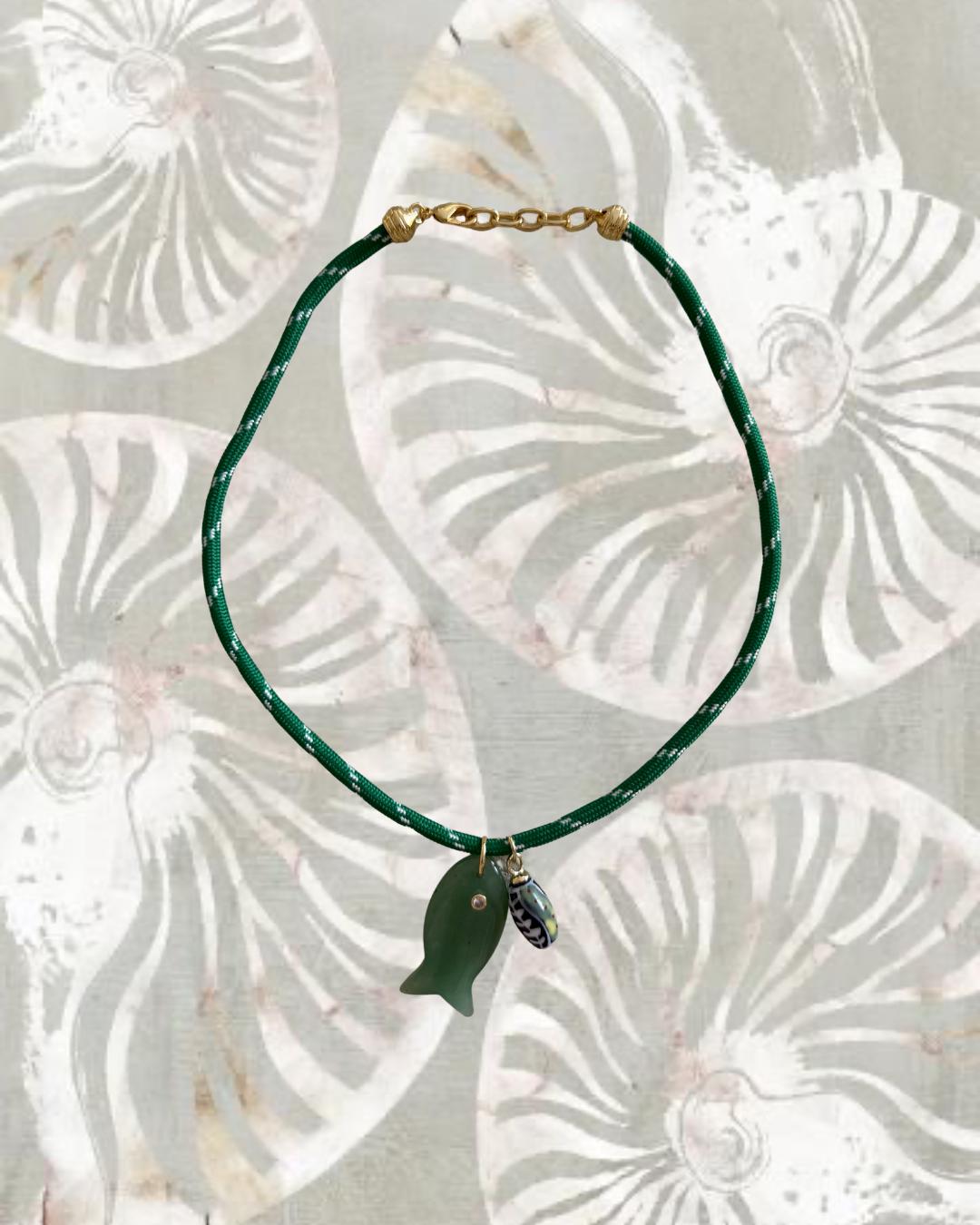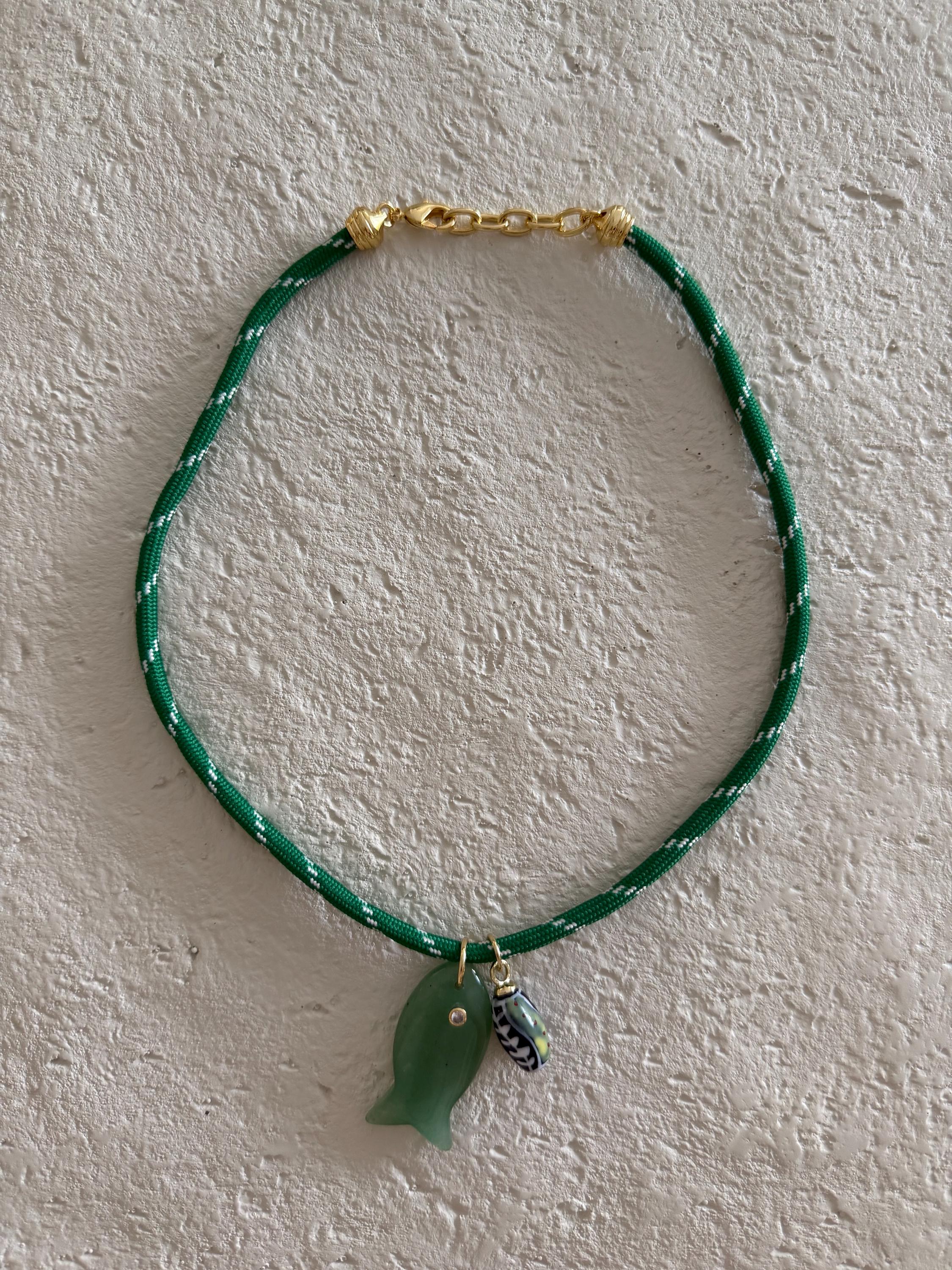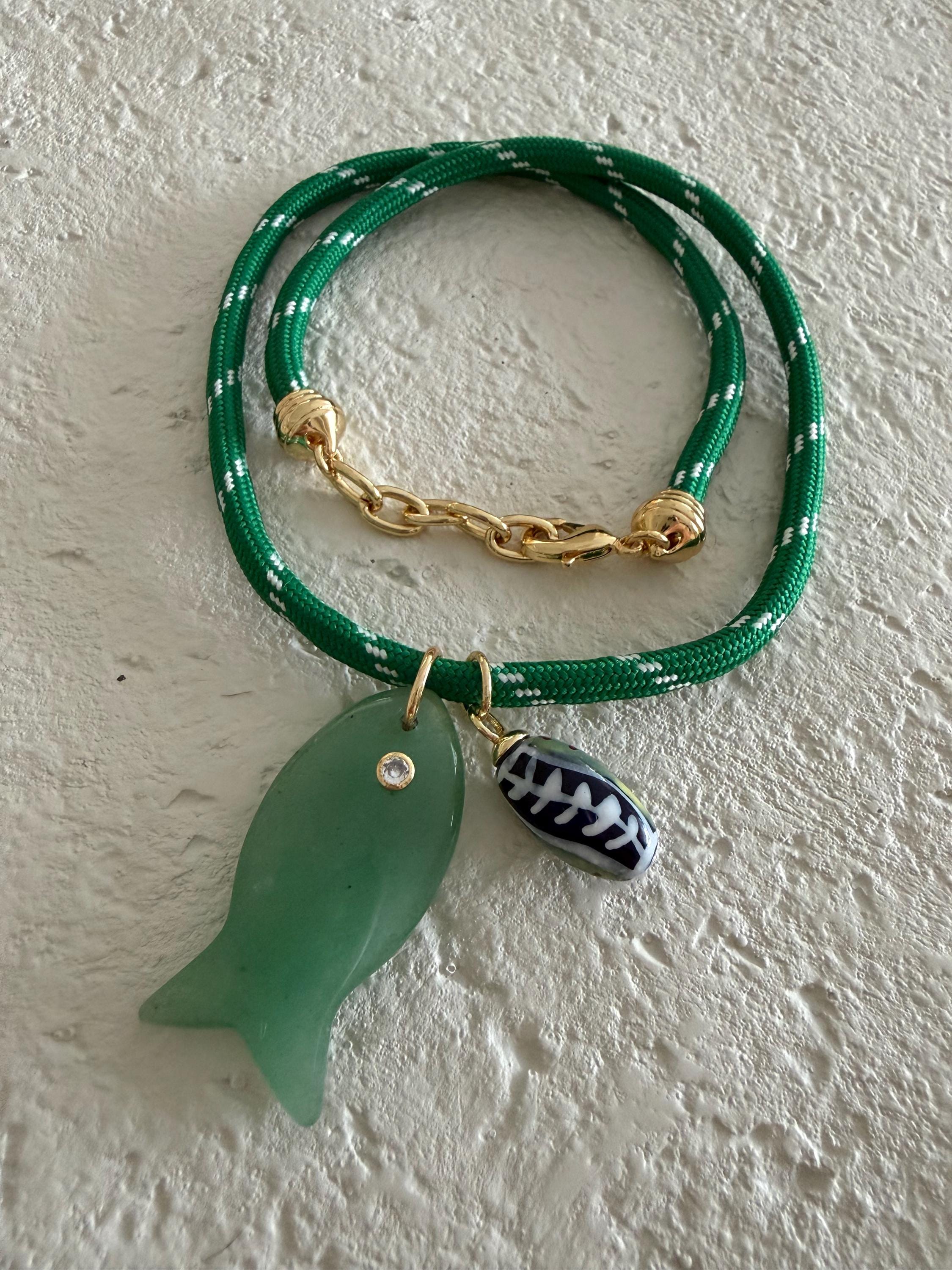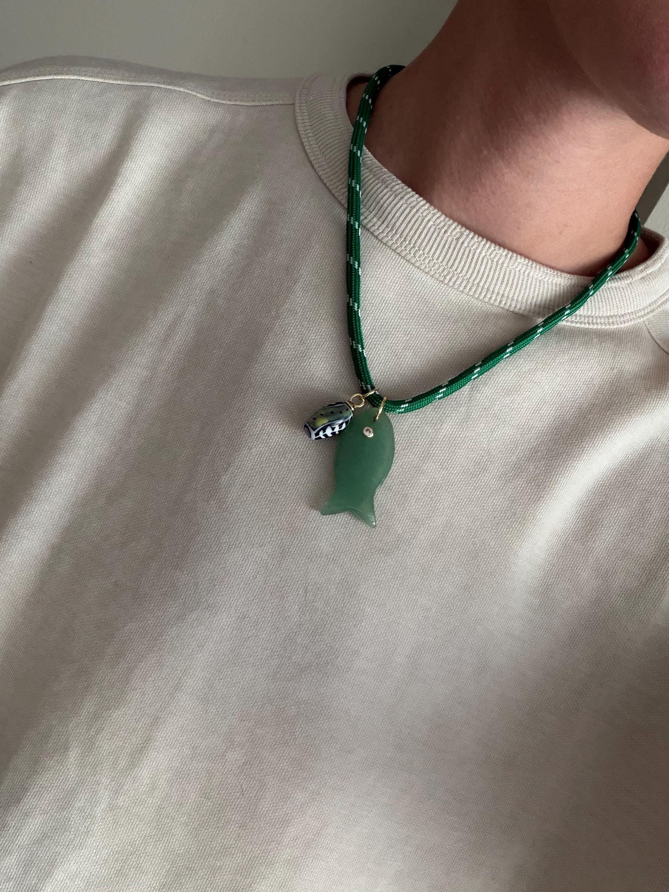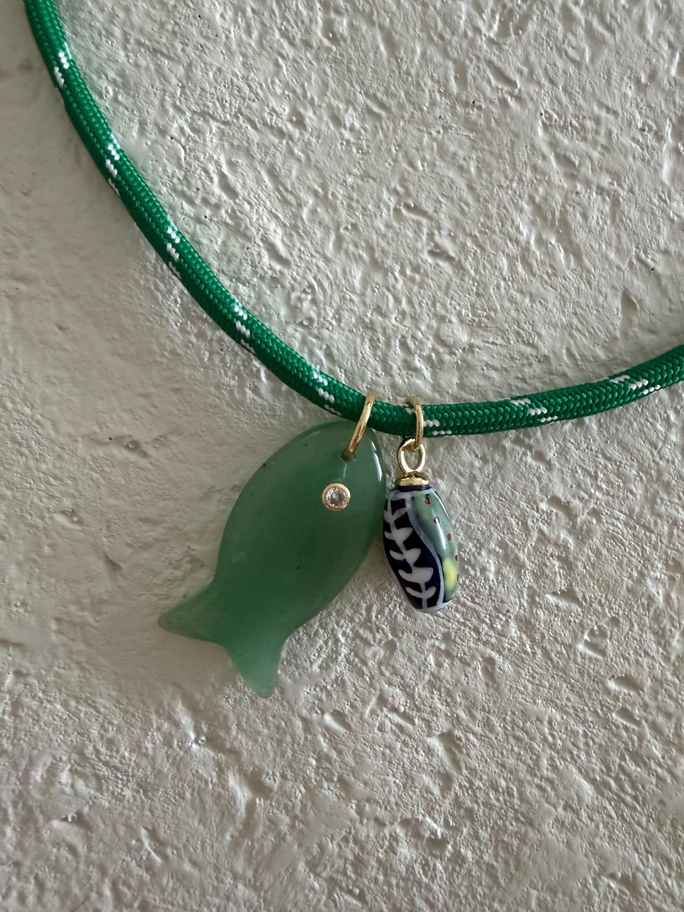 • Materials: 18k gold filled 38.8mm aventurine gemstone fish pendant (gemstones coloring may vary), ceramic pendant & green cord