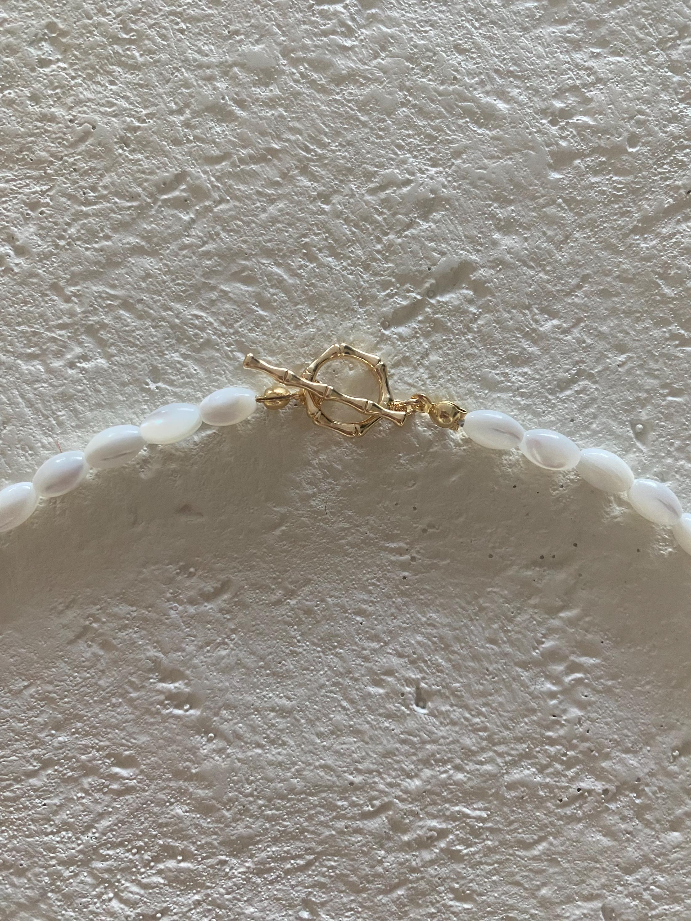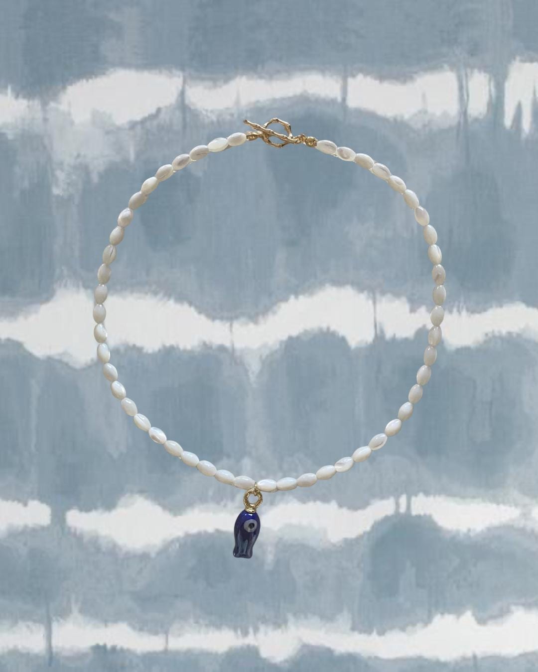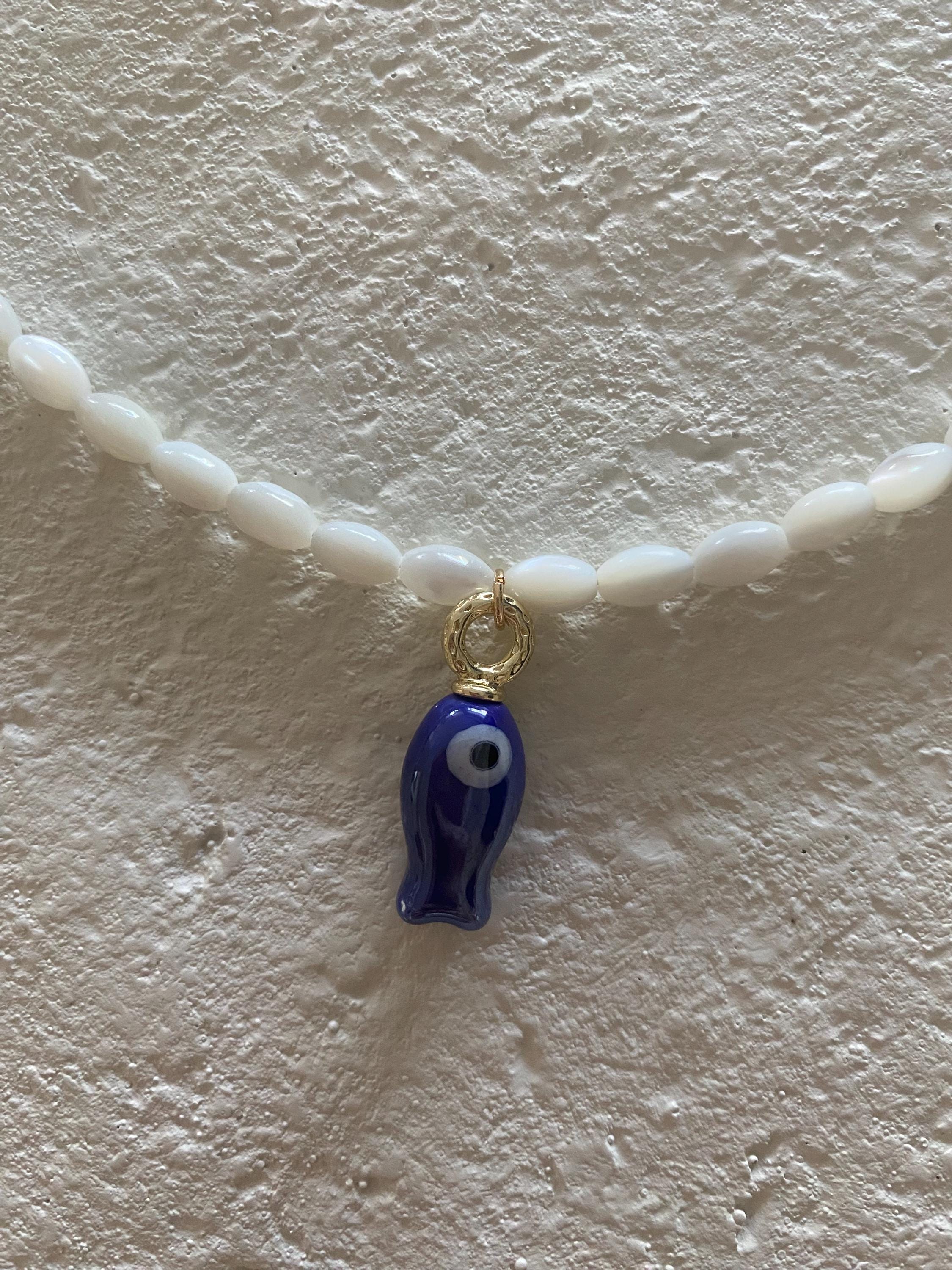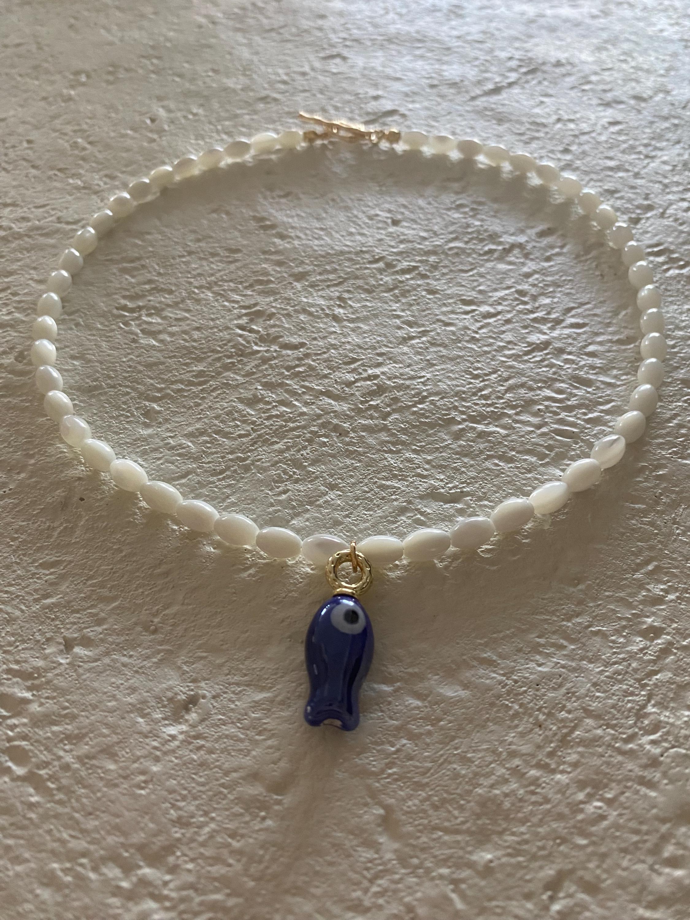 • Materials: Mother of pearl shell rice beads & gold fill-finish hand painted ceramic fish charm