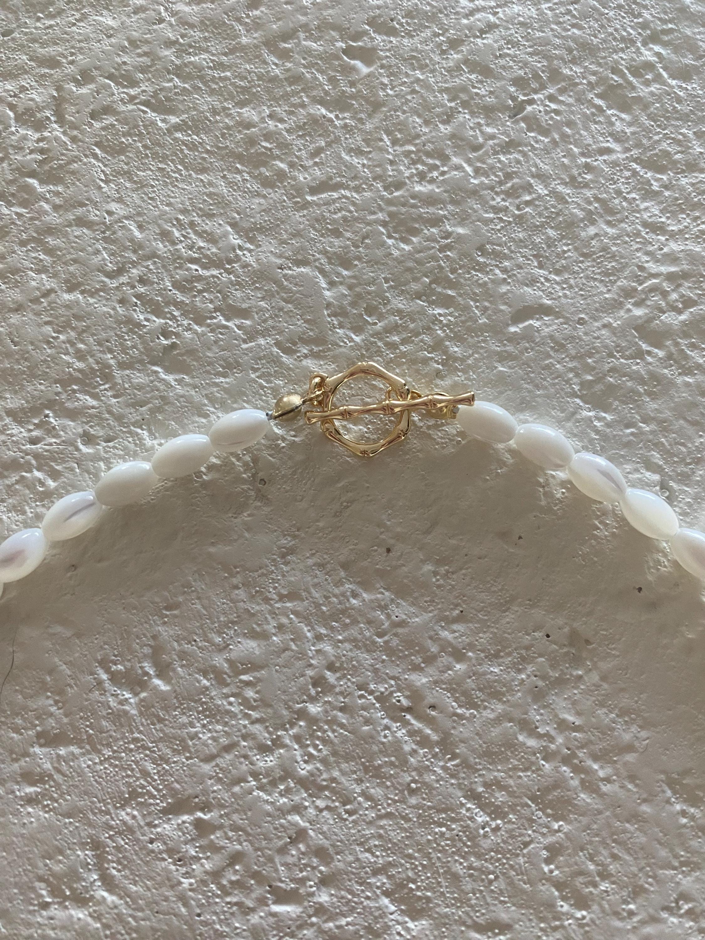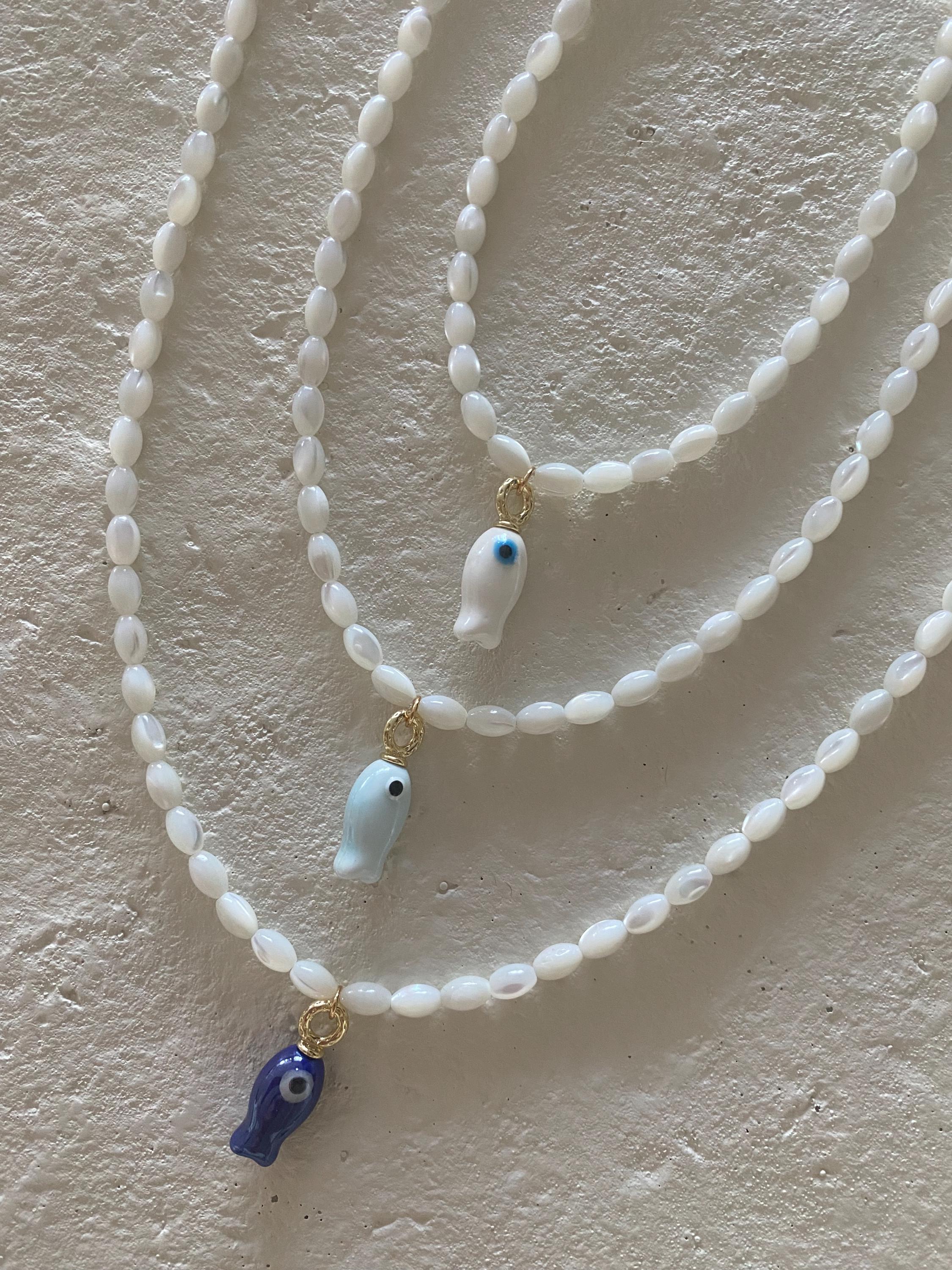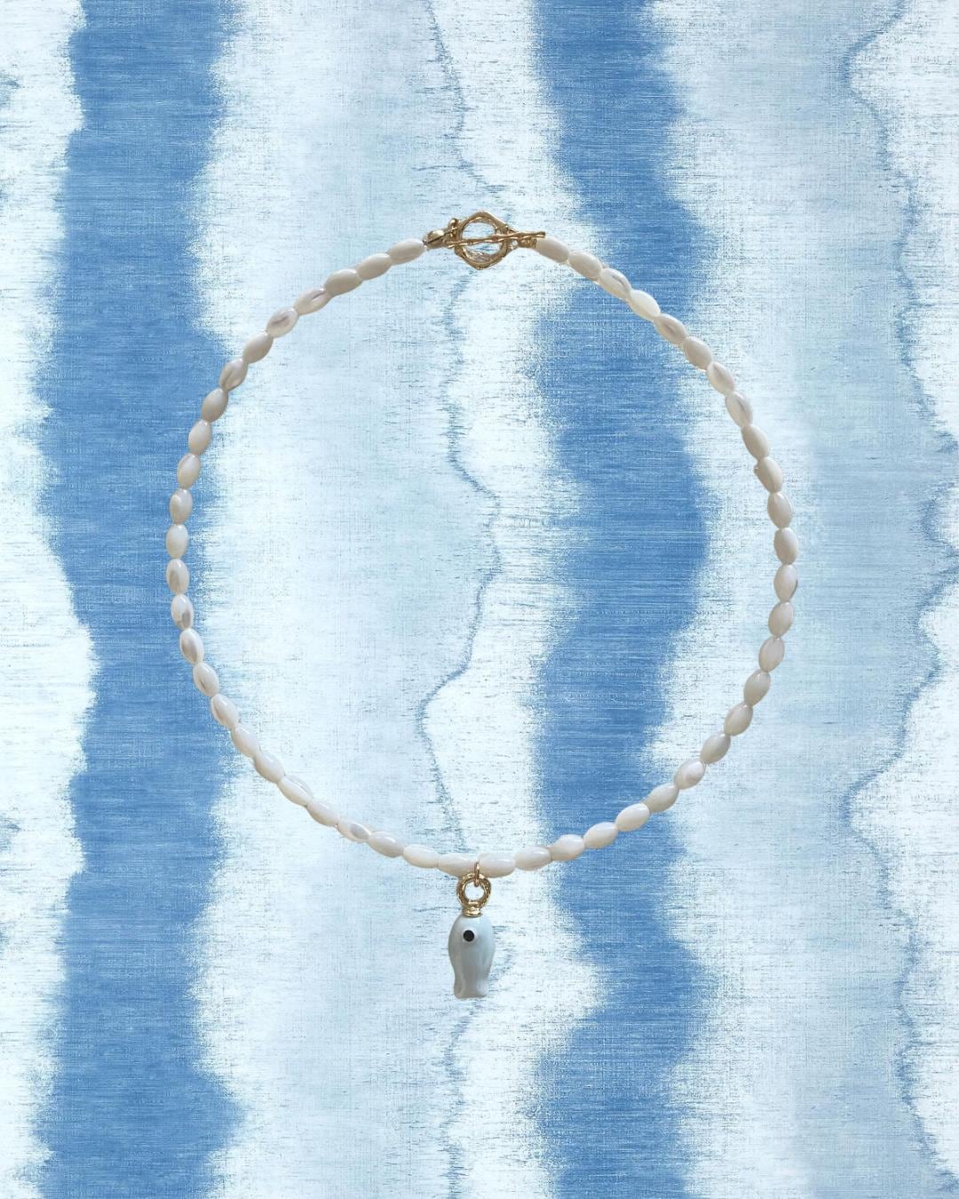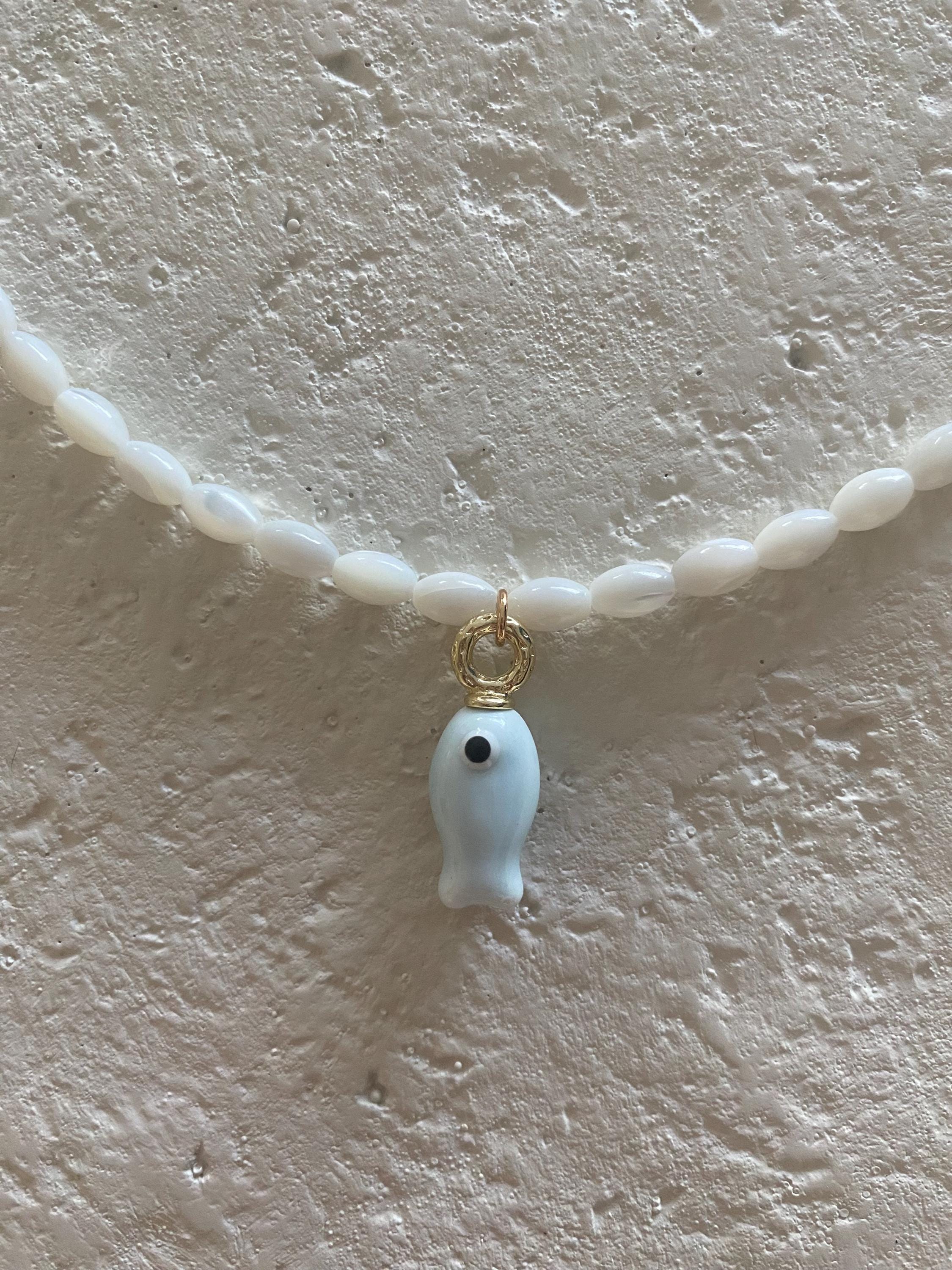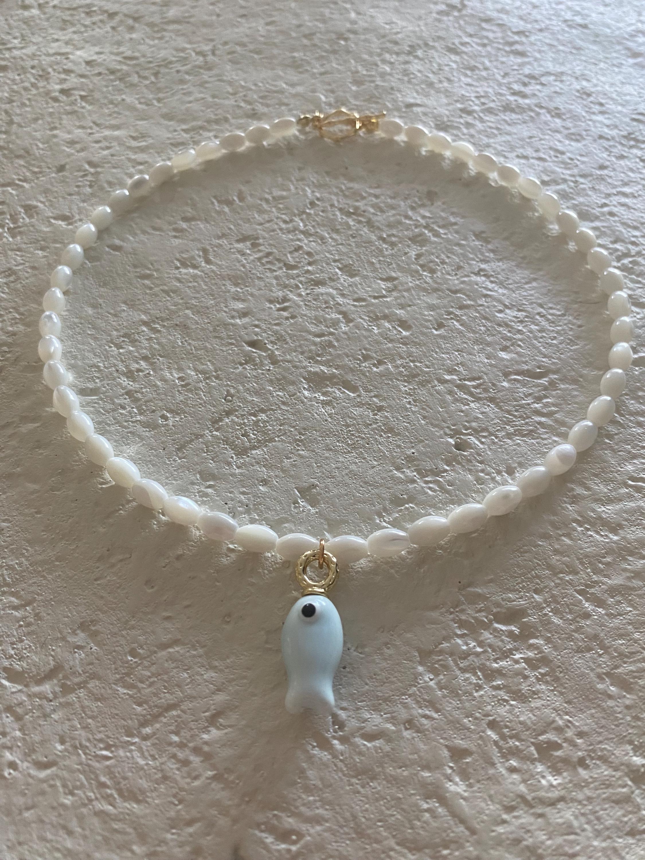 • Materials: Mother of pearl shell rice beads & gold fill-finish hand painted ceramic fish charm