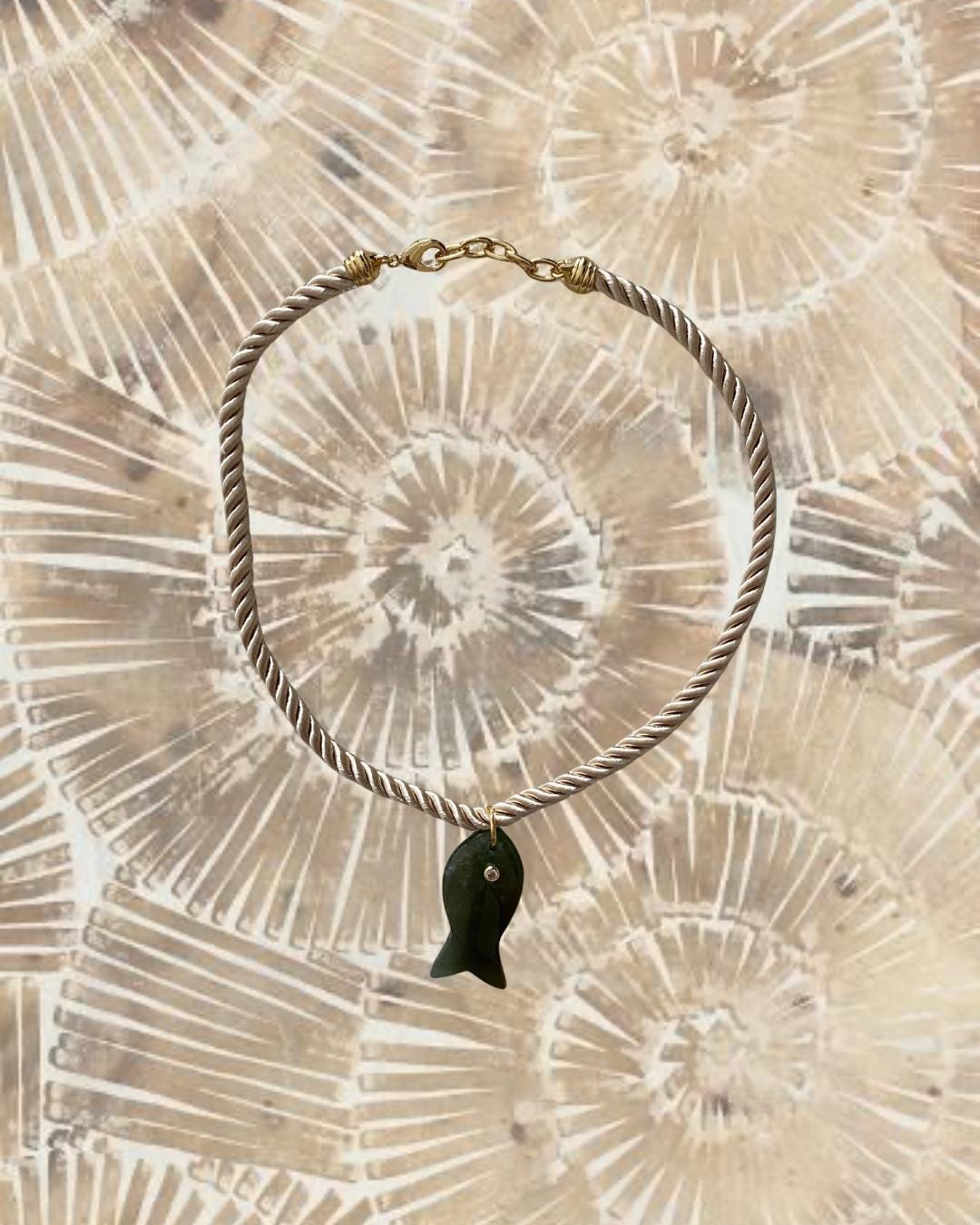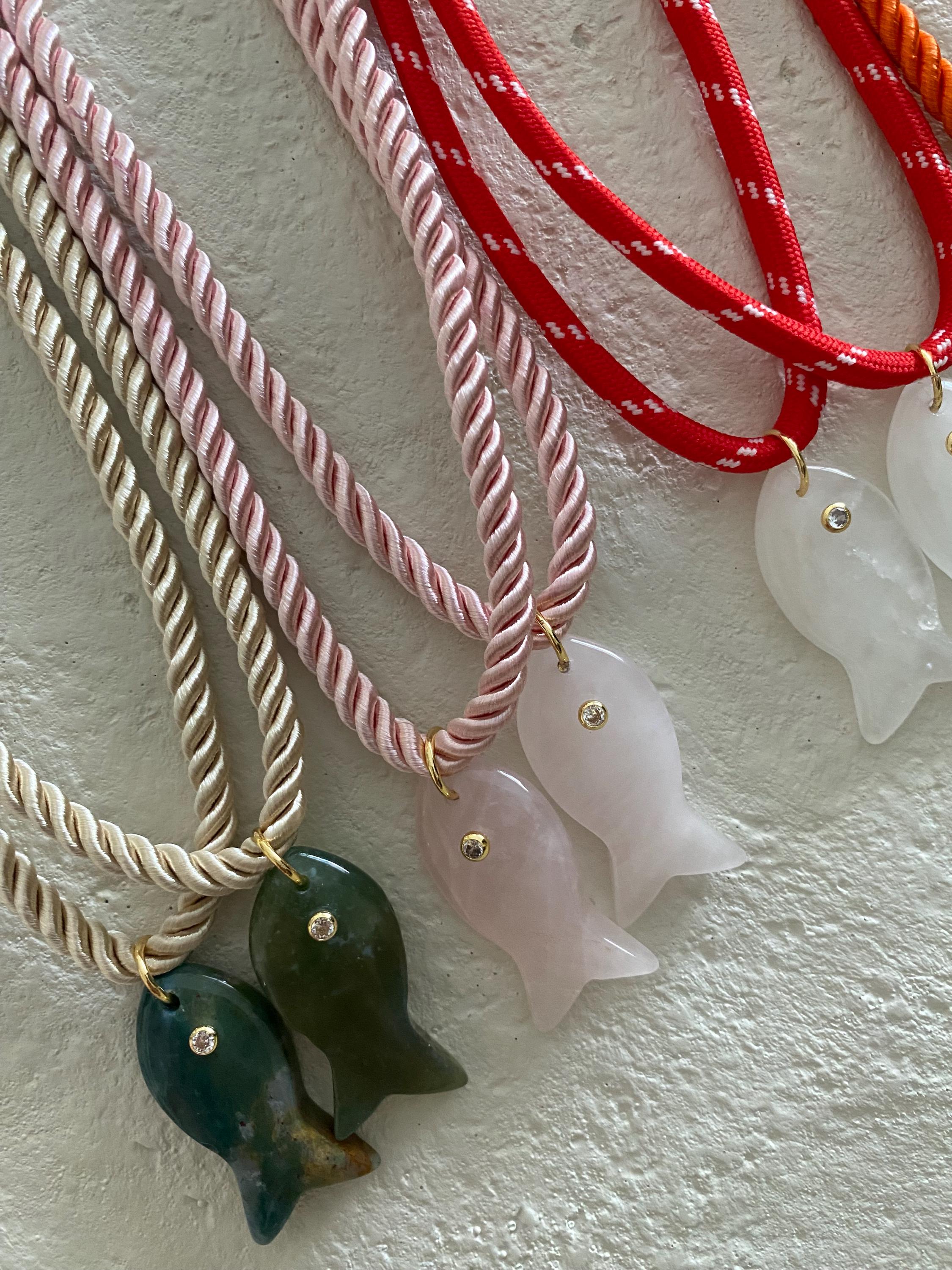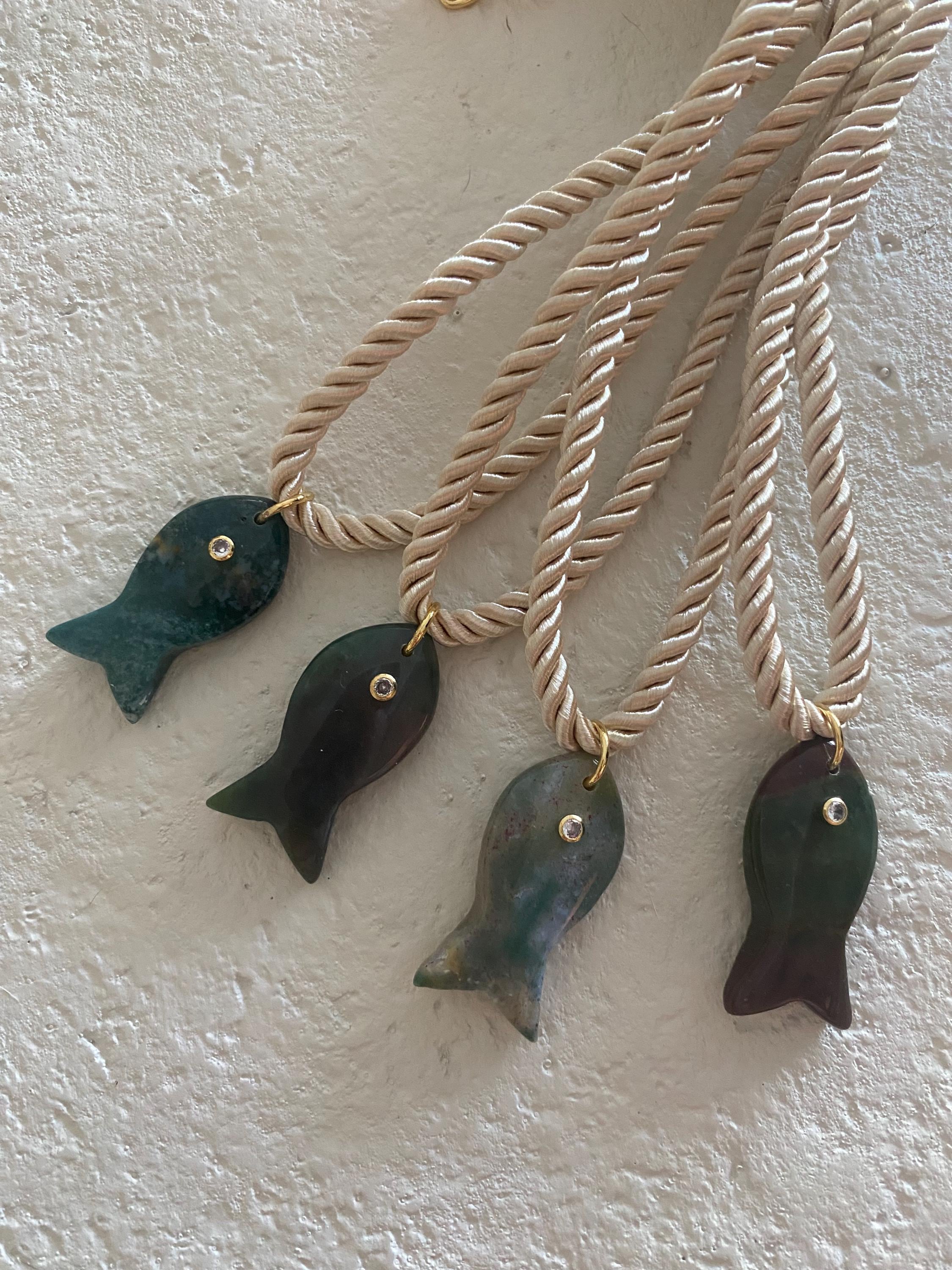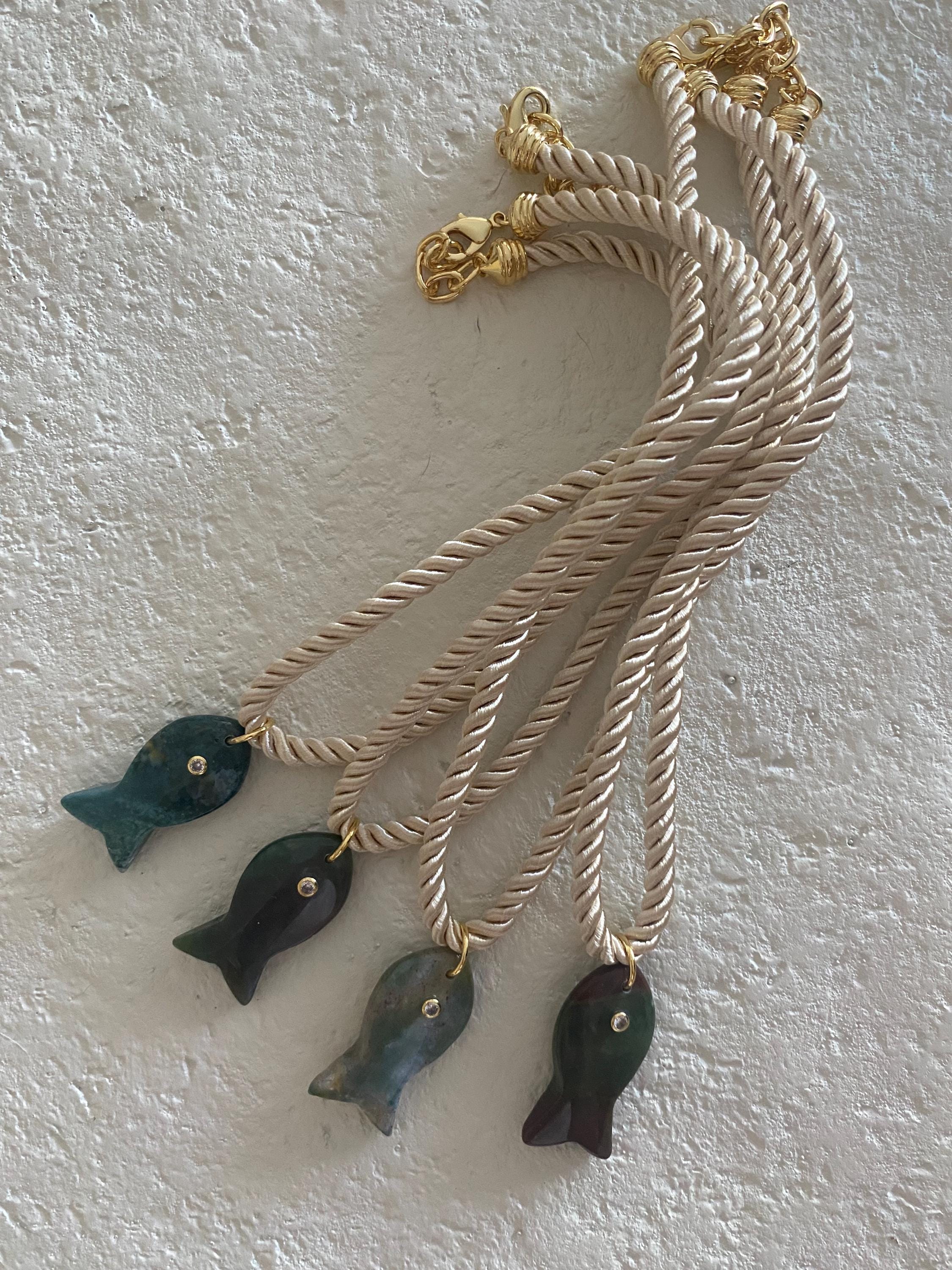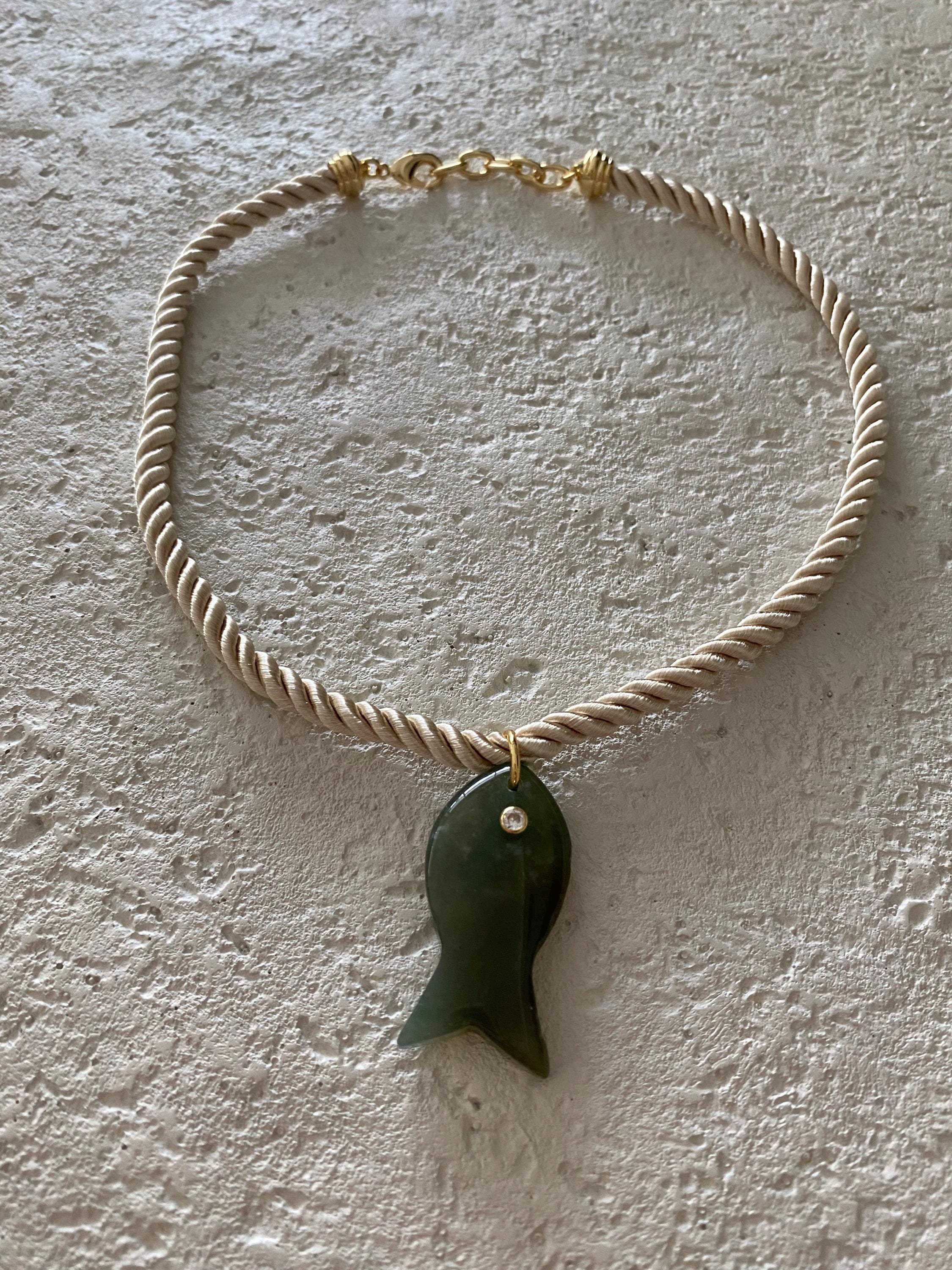 • Materials: 18k gold filled 38.8mm green apatite gemstone fish pendant & cream braided silk rope cord (gemstone coloring may vary)