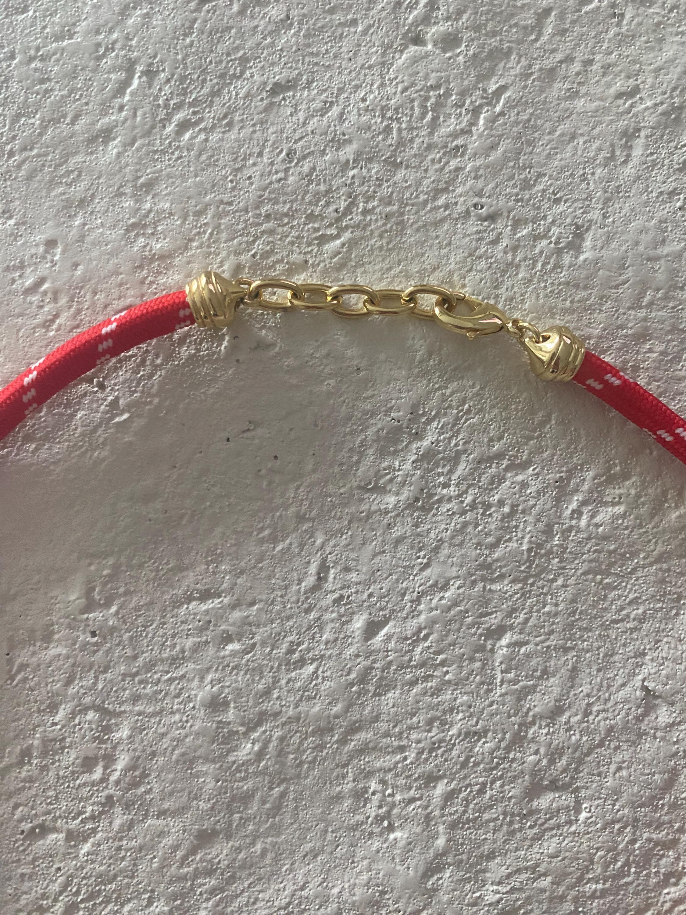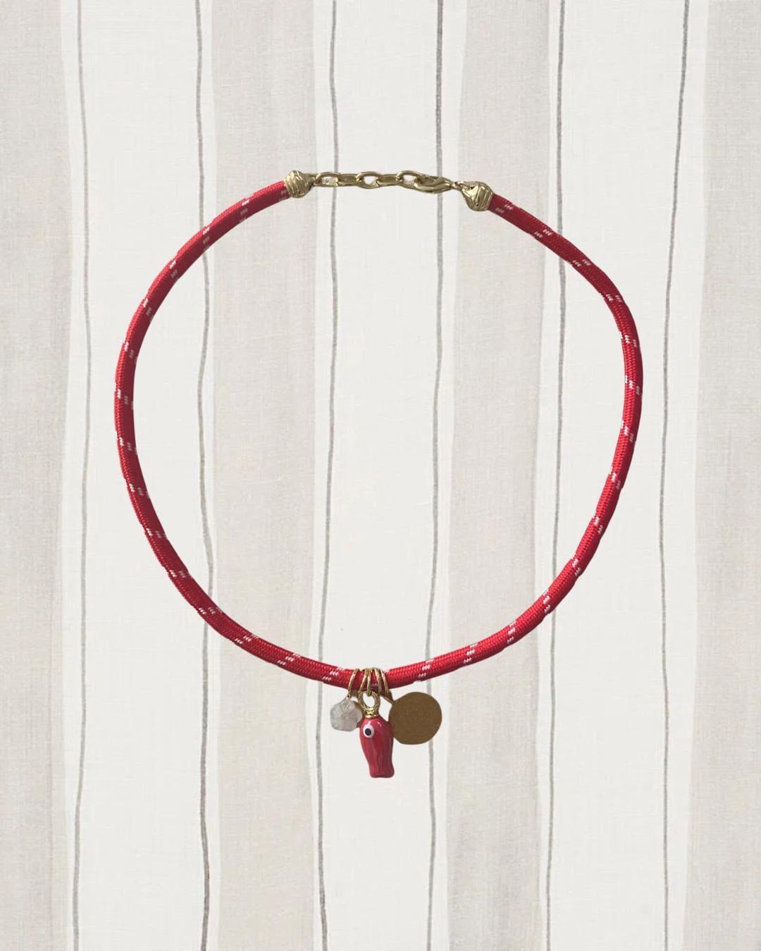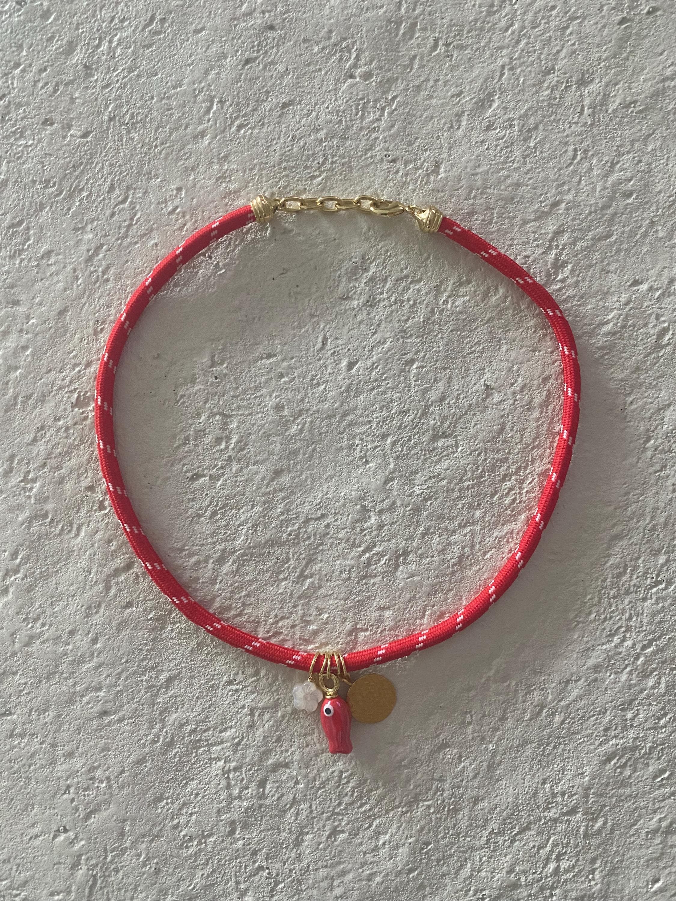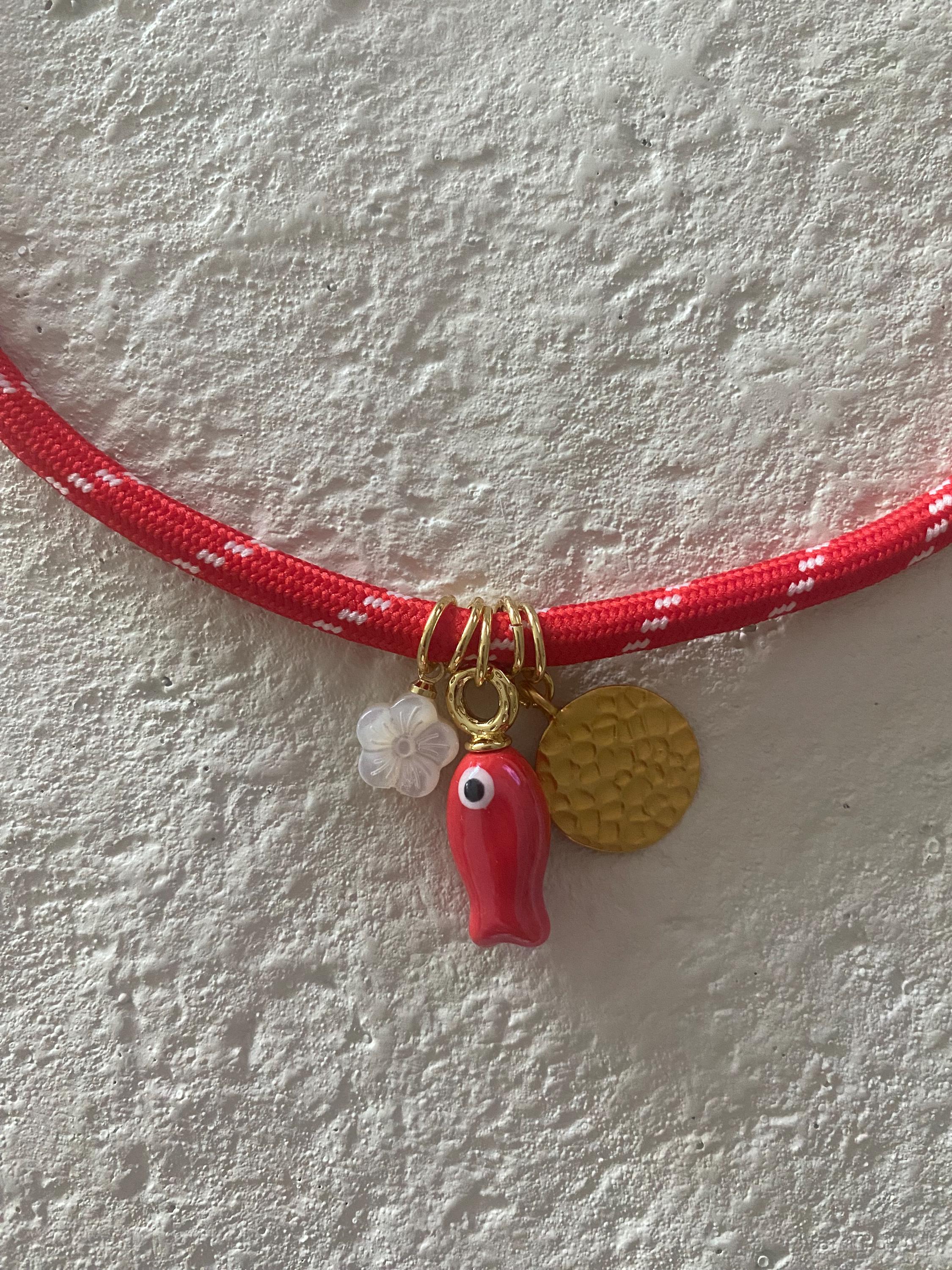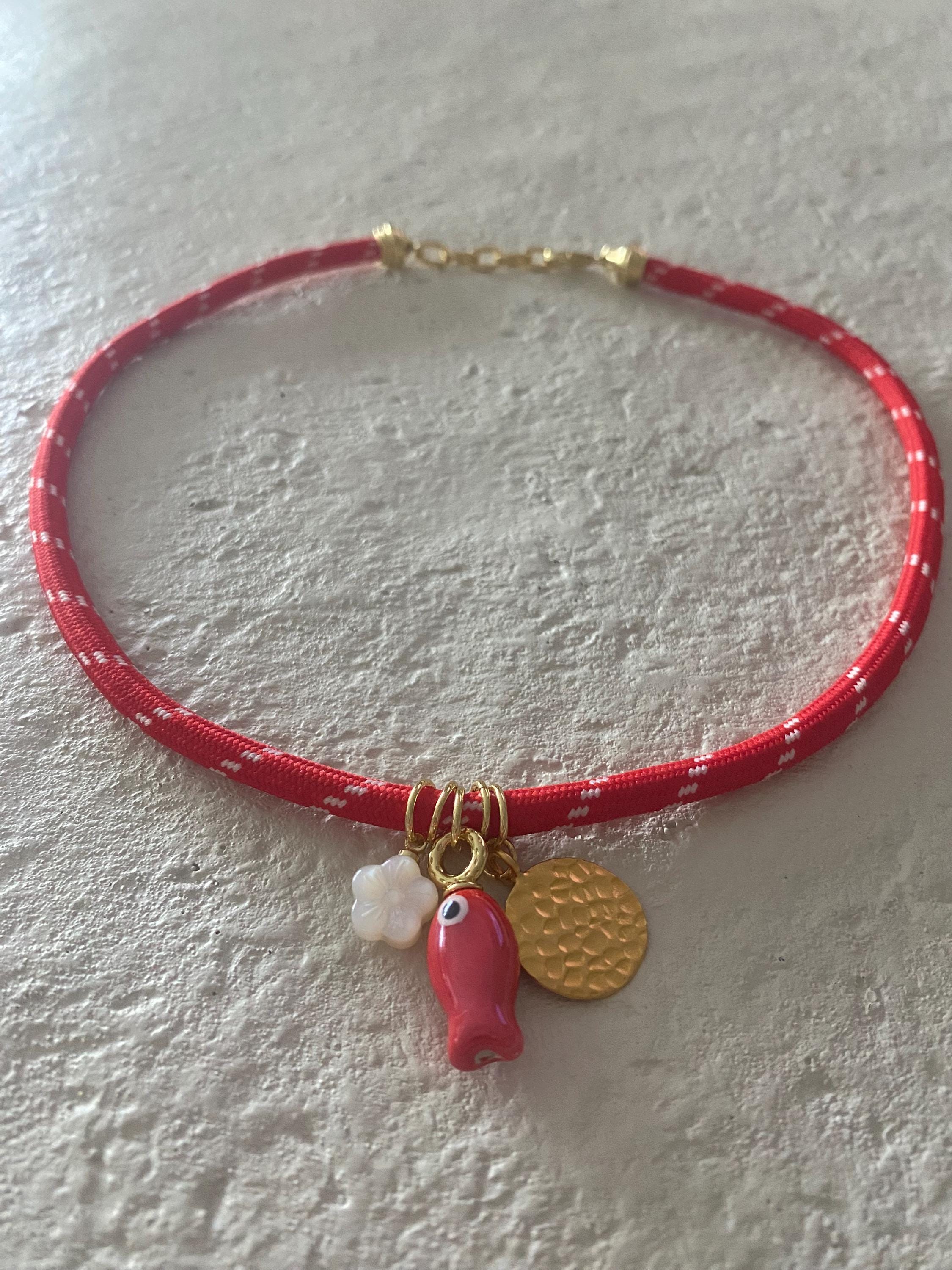 • Materials: Gold fill-finish hand painted ceramic fish charm, gold filled shell pearl hibiscus charm, gold plated hammered charm & red cord