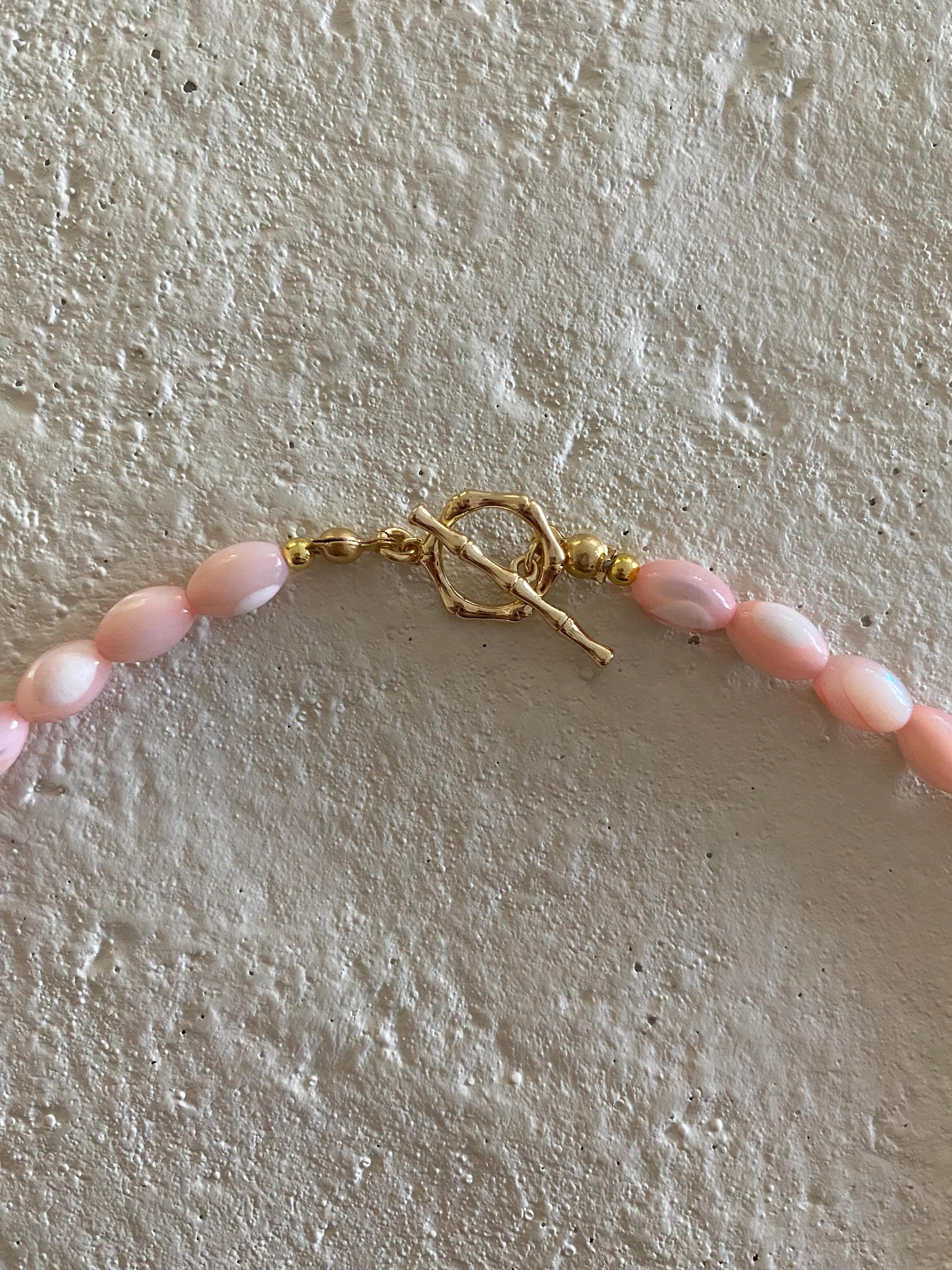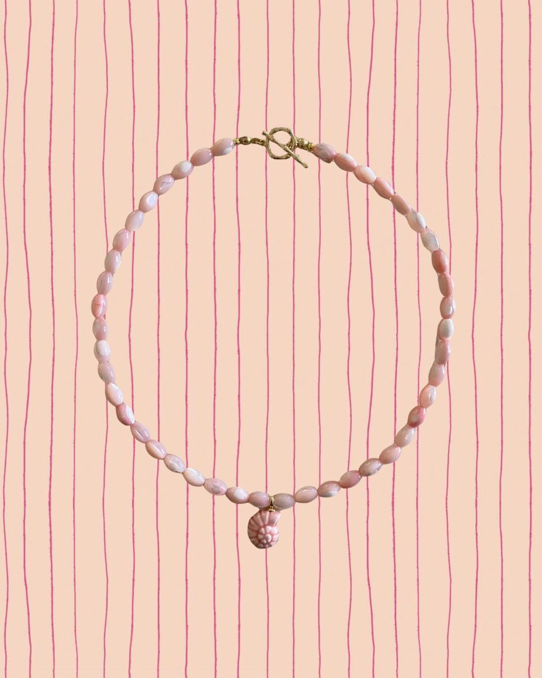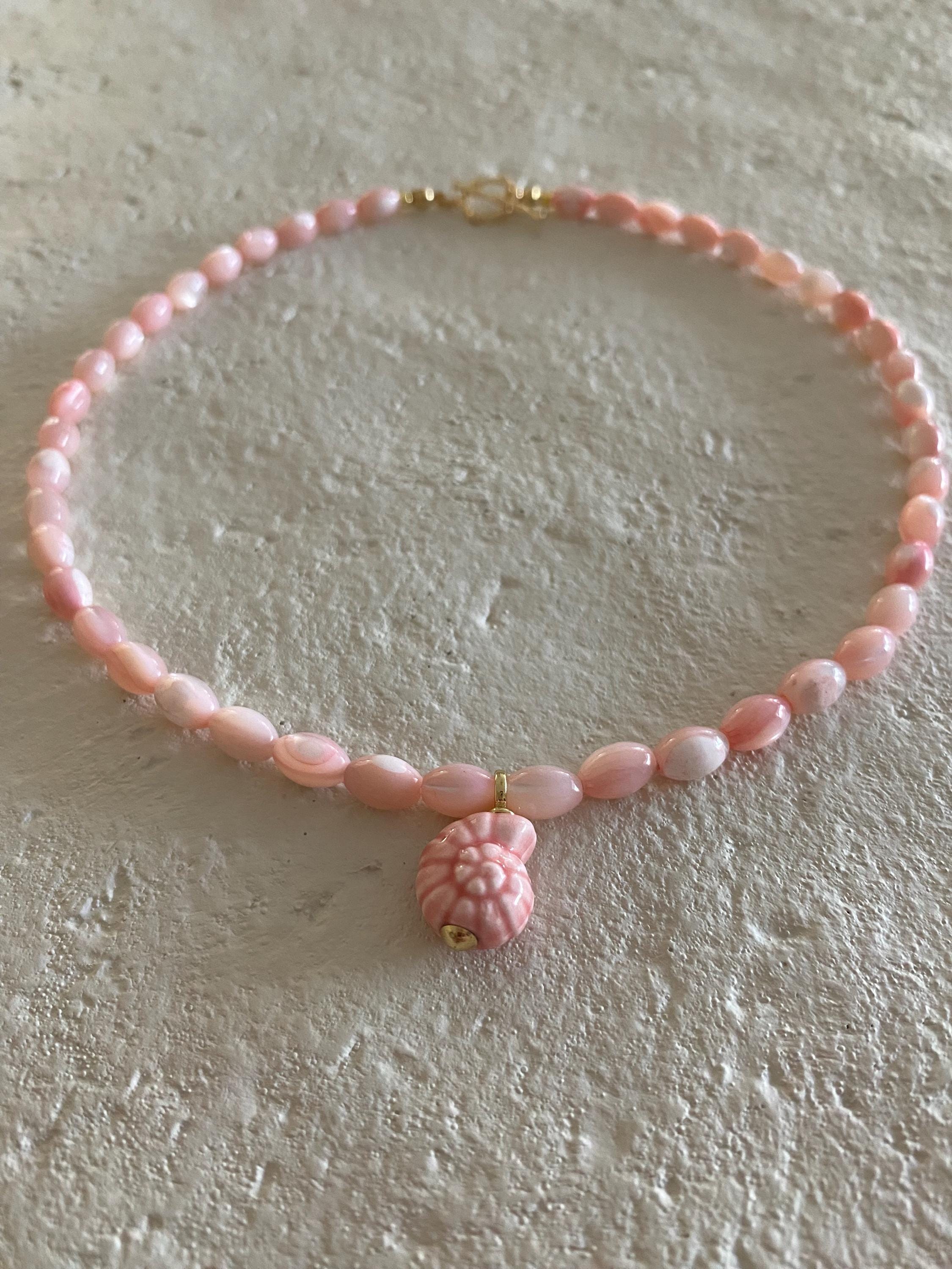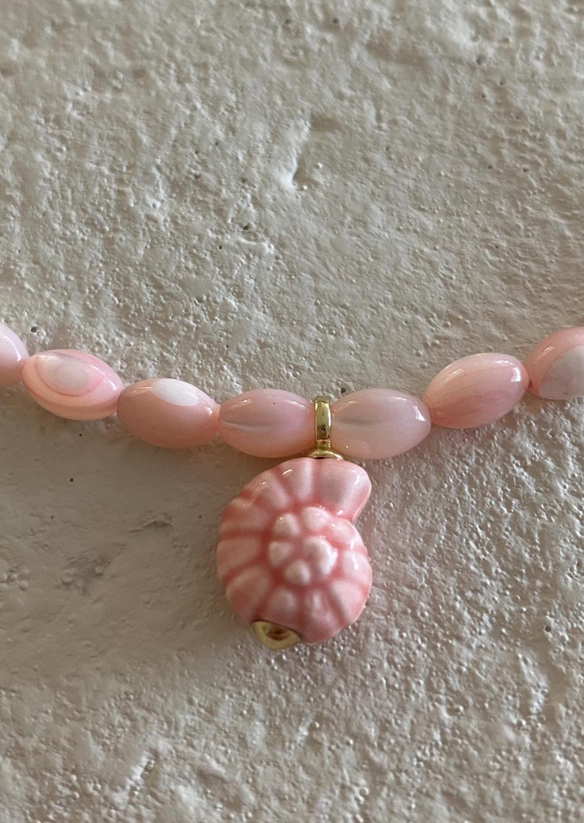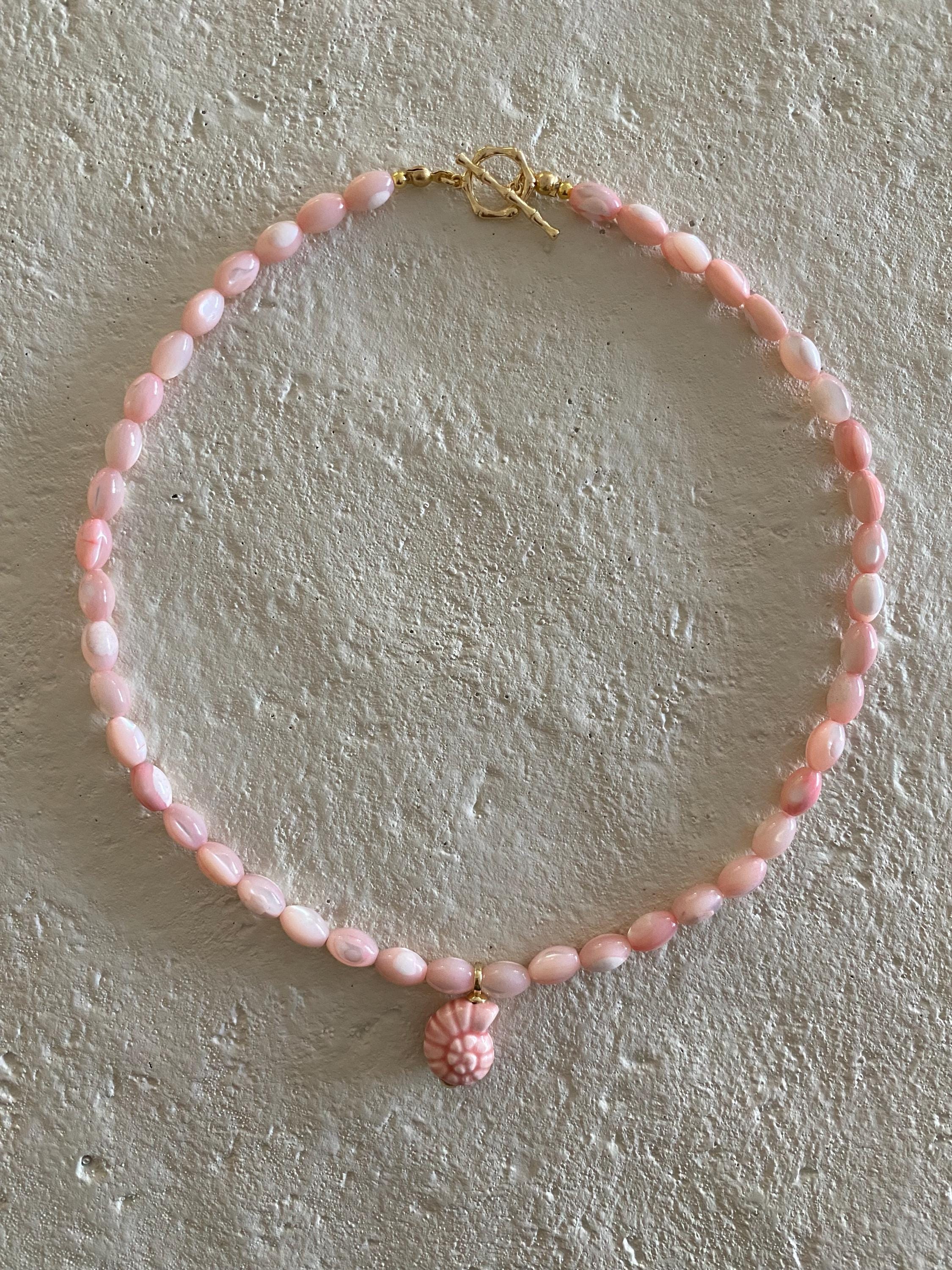 • Materials: Pink shell rice beads & 24k gold filled porcelain shell charm