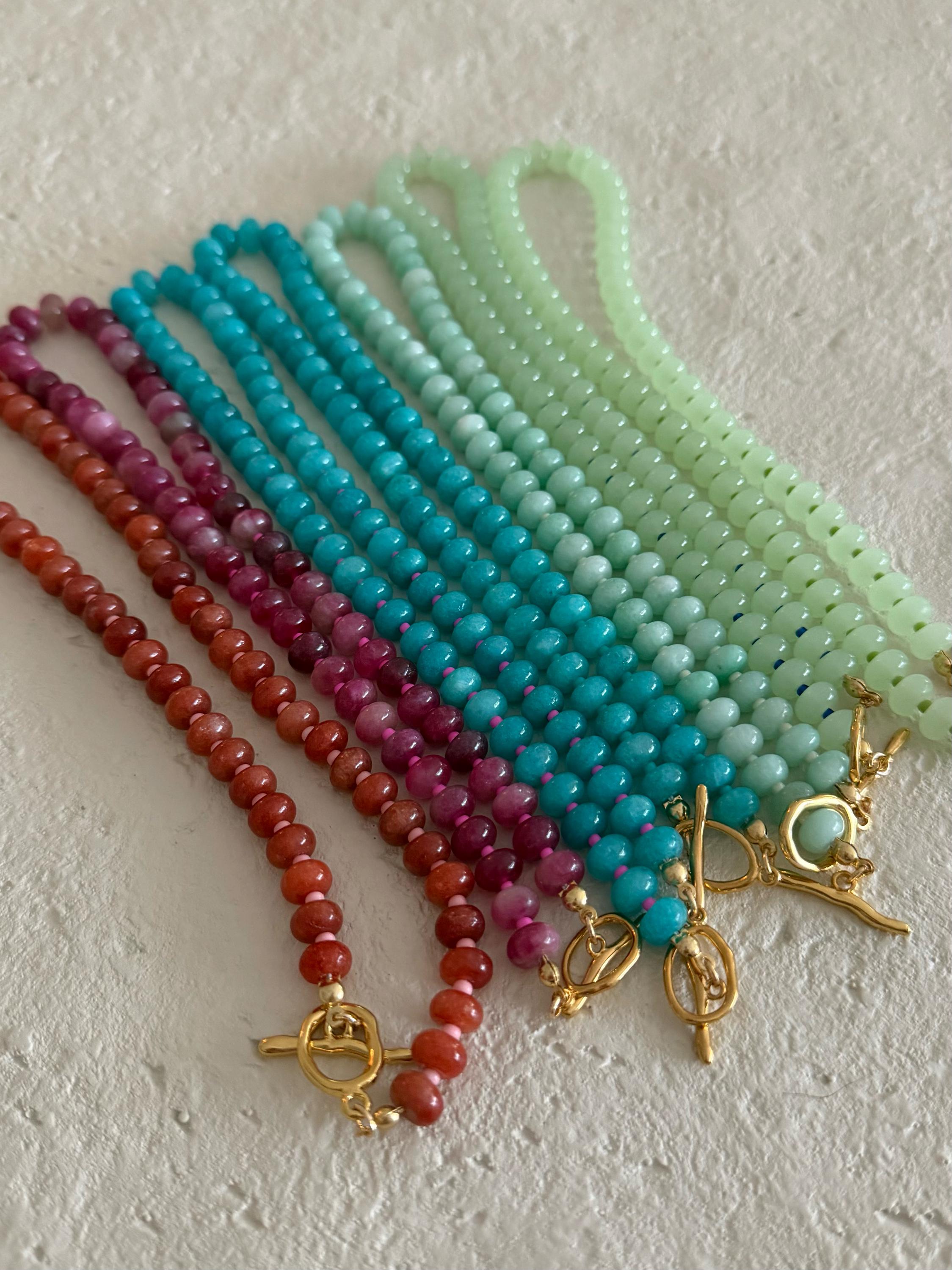 Our jewelry is handcrafted using glass beads, natural stones, wood, and 14k gold plated or stainless steel components. Every piece is made with quality and durability in mind.