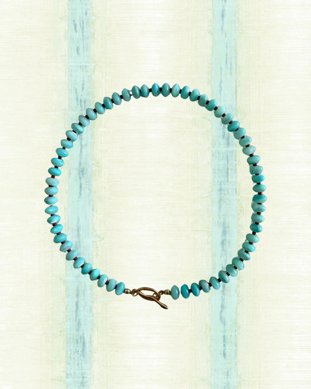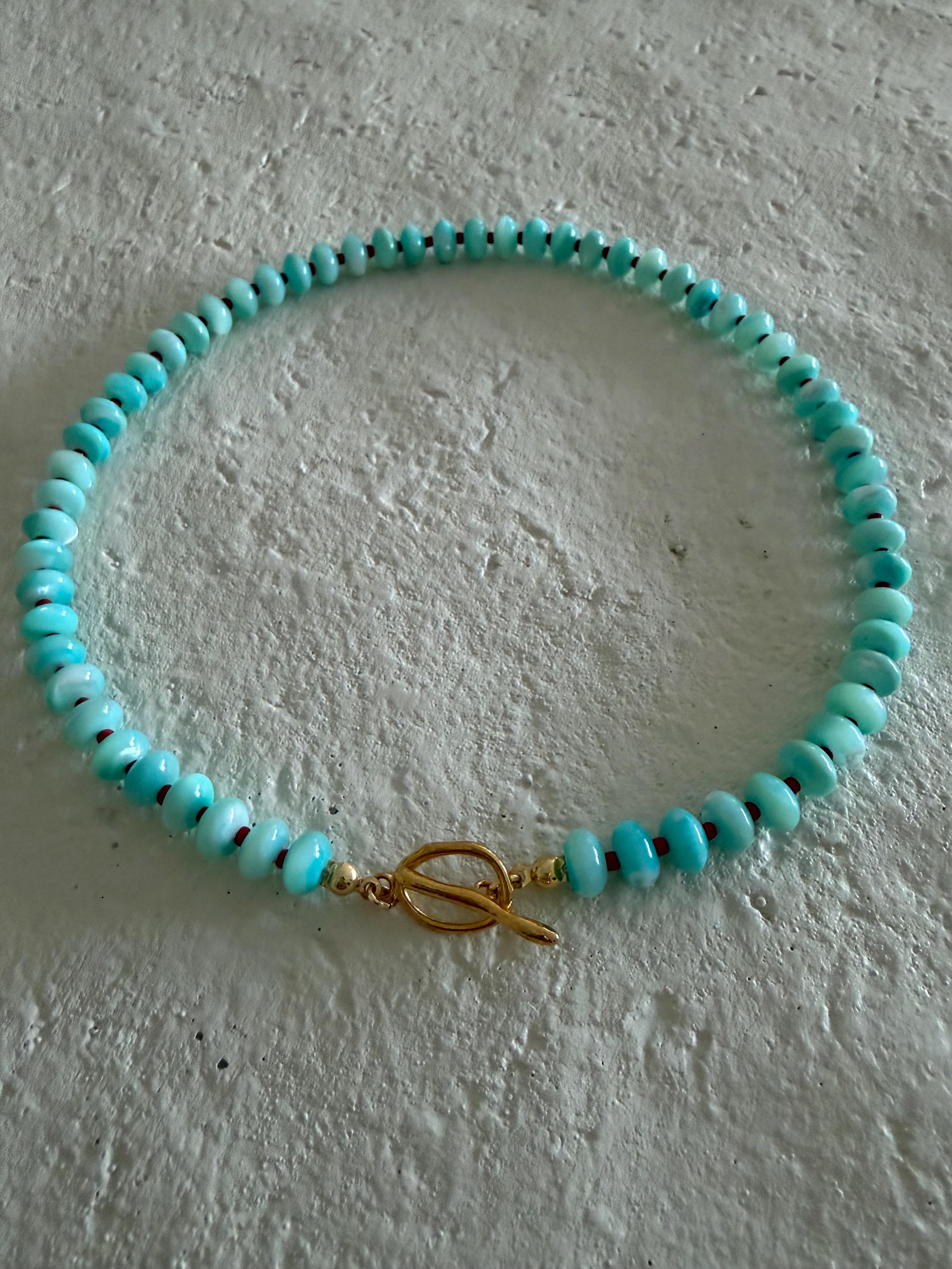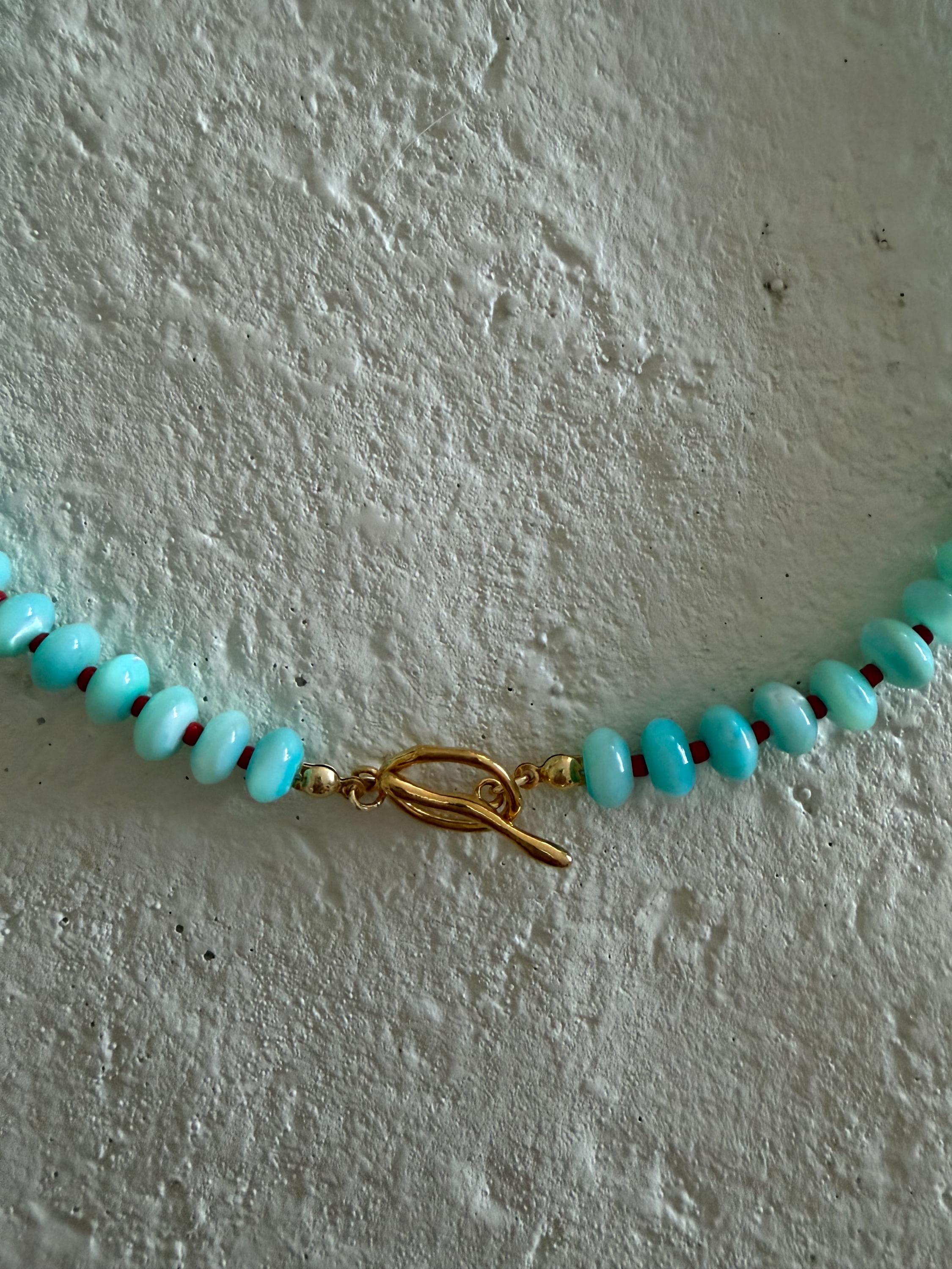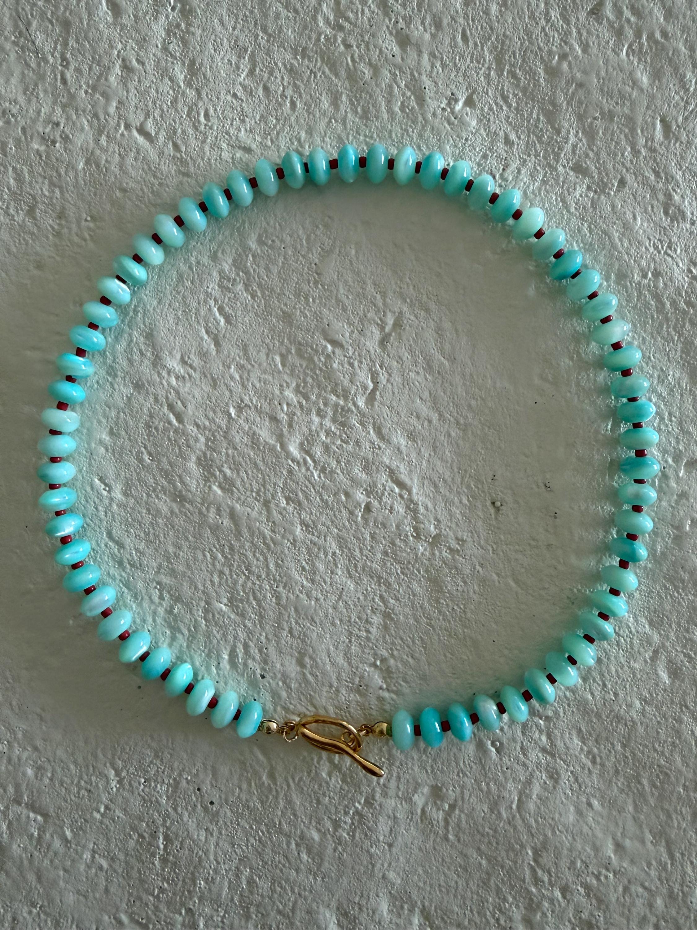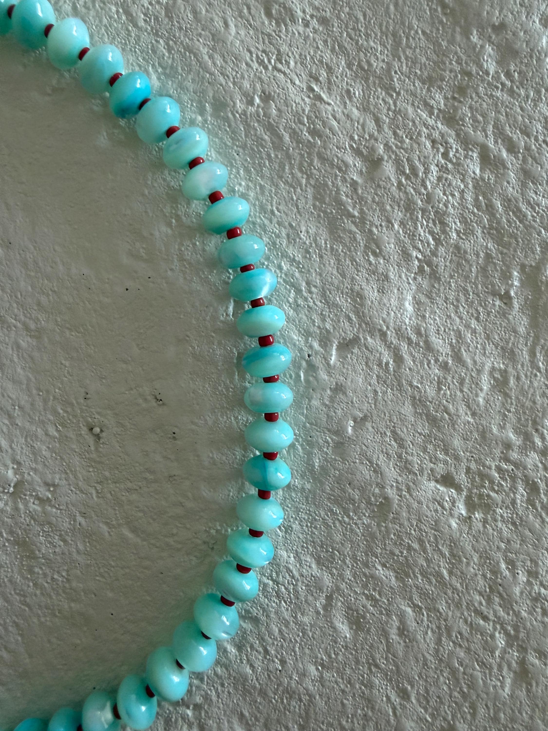 • Materials: Aqua Blue Mother of Pearl glass beads & red seed beads