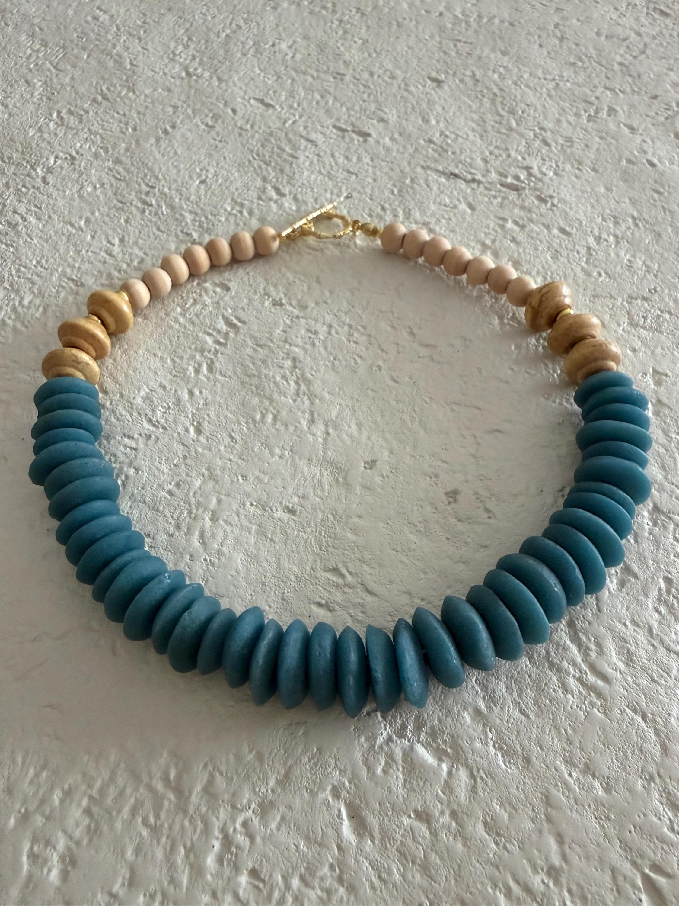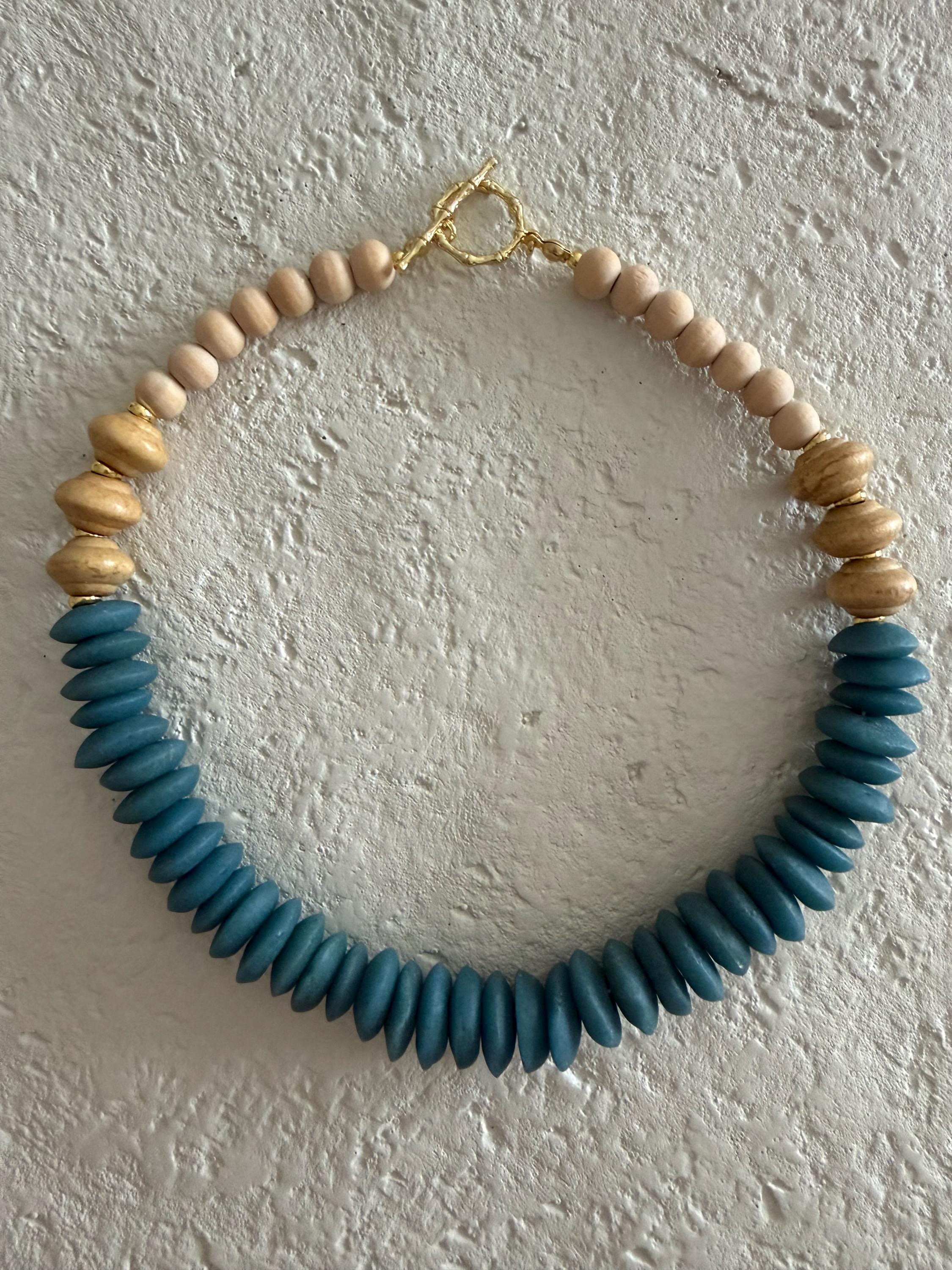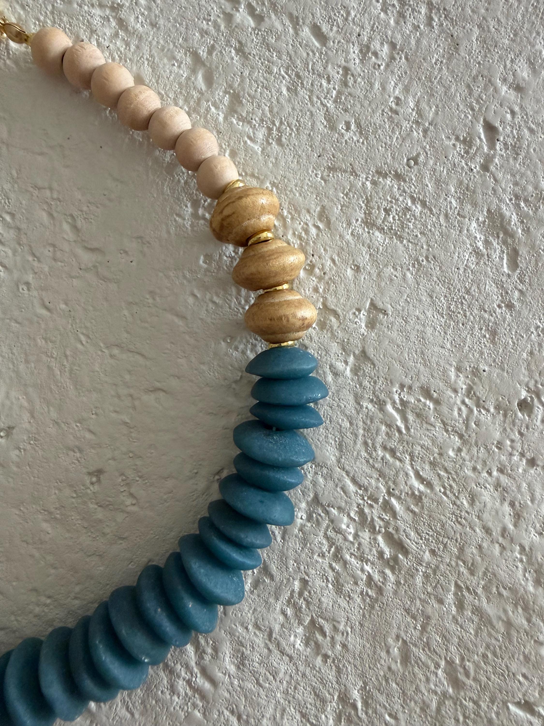 • Materials: Blue African Fair Trade glass beads, natural wooden beads & 18k gold plated beads