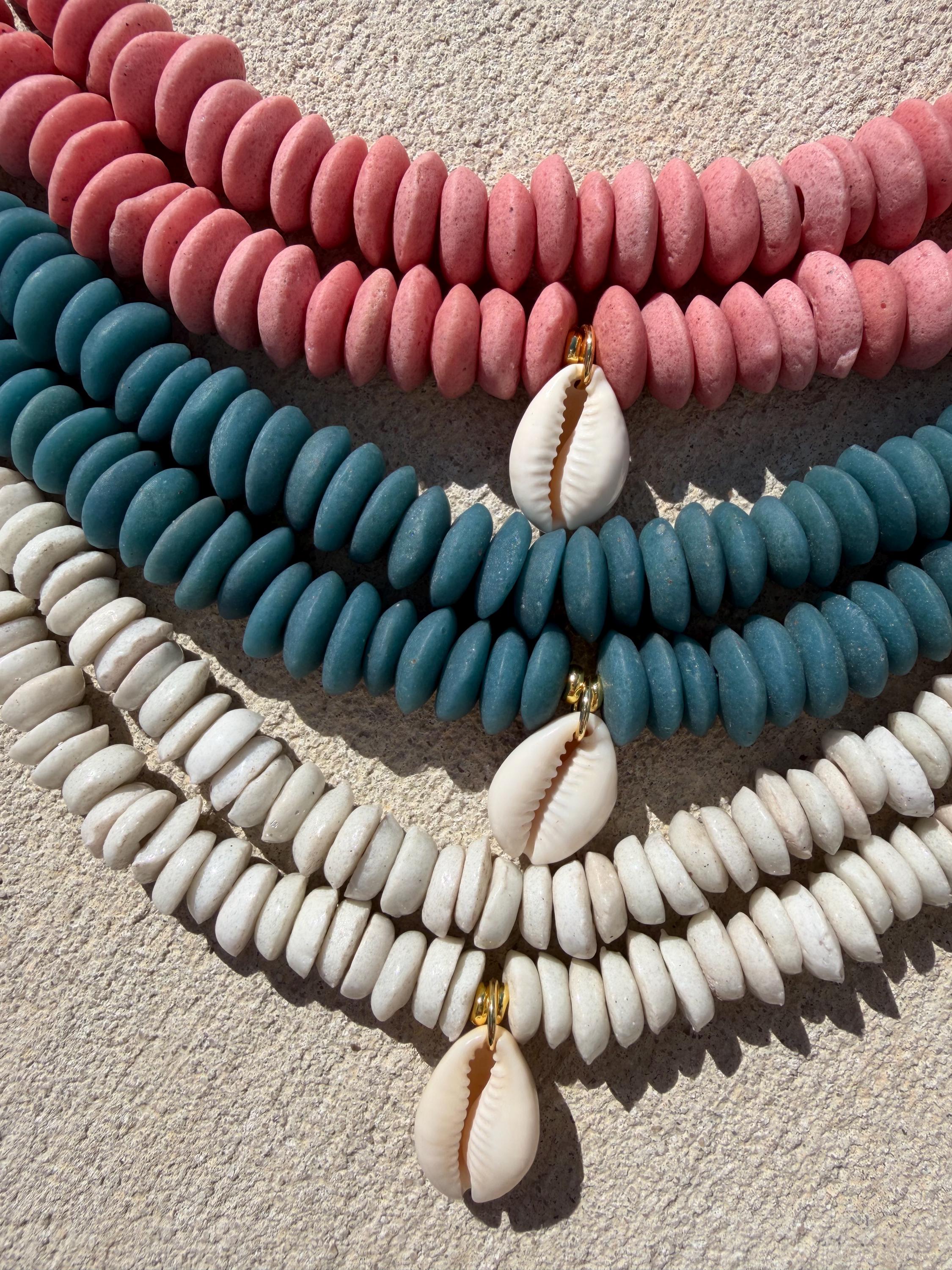 Our jewelry is handcrafted using glass beads, natural stones, wood, and 14k gold plated or stainless steel components. Every piece is made with quality and durability in mind.