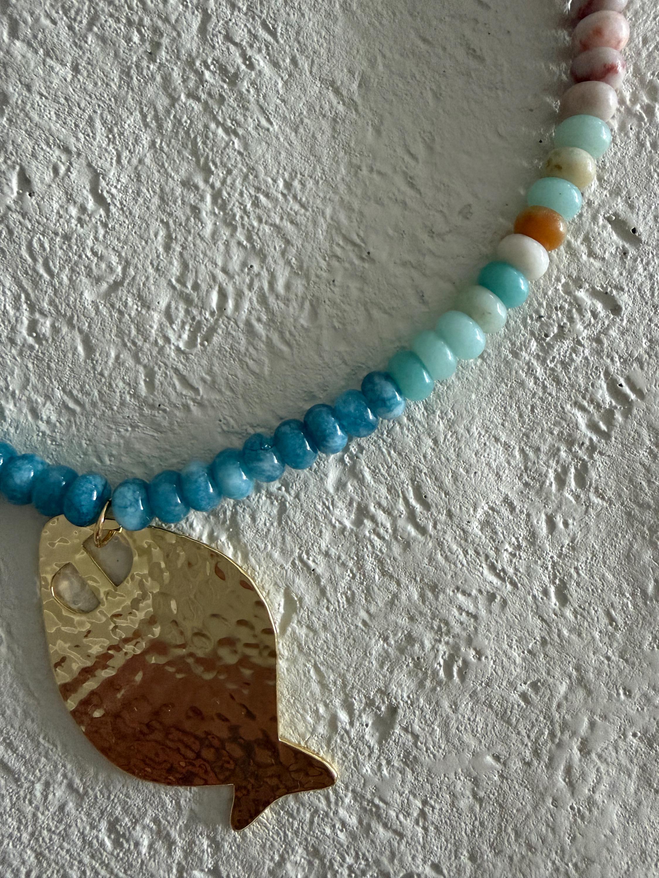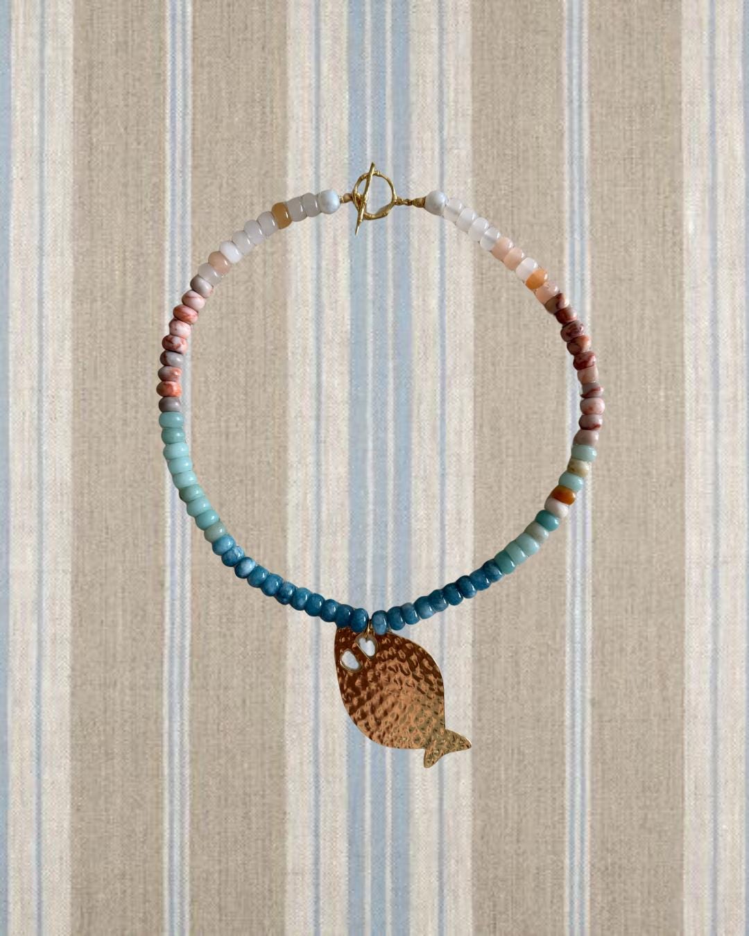 Finished with a hammered gold fish pendant, this piece is playful yet elevated — the perfect balance of coastal charm and heirloom texture.