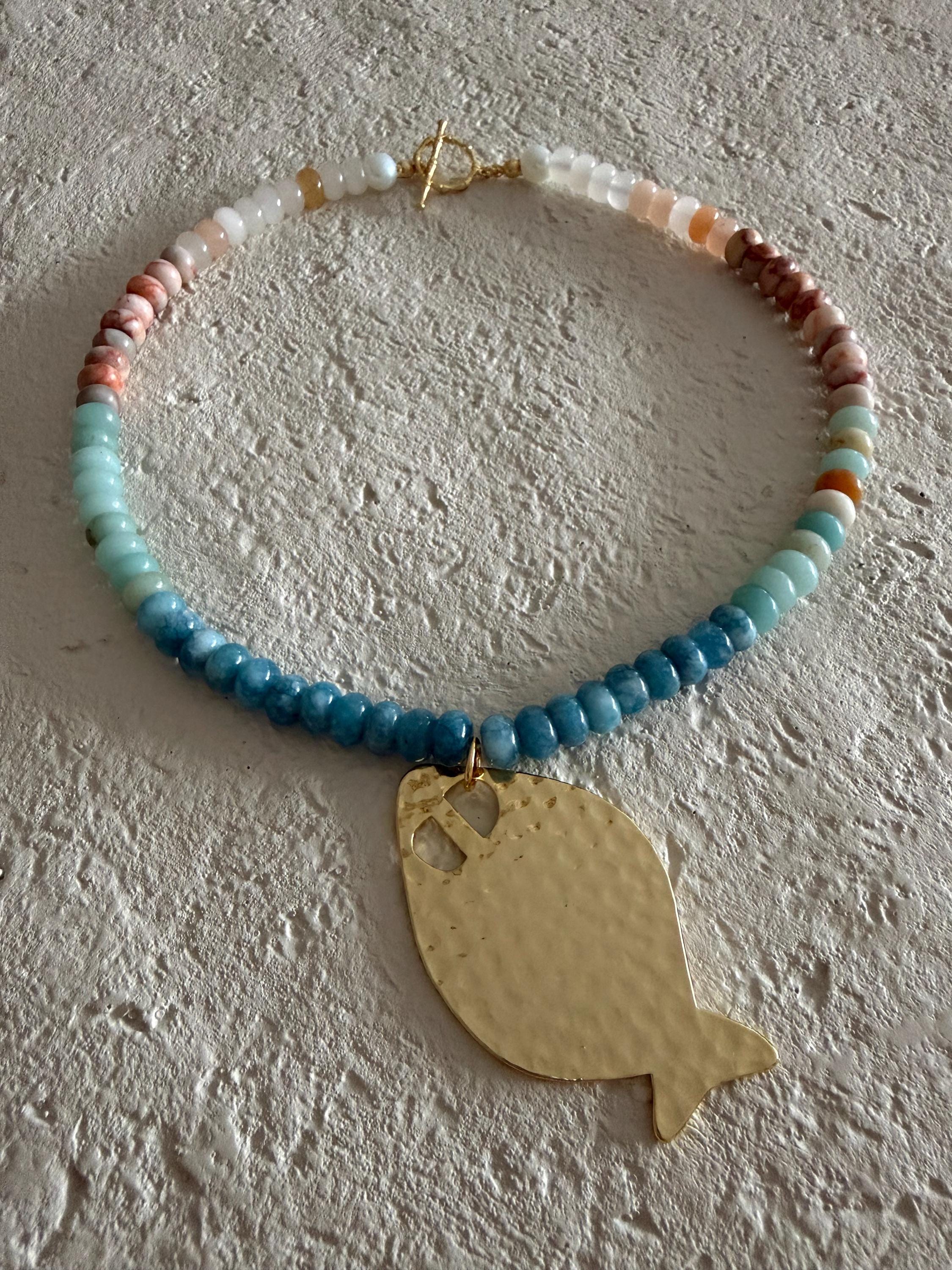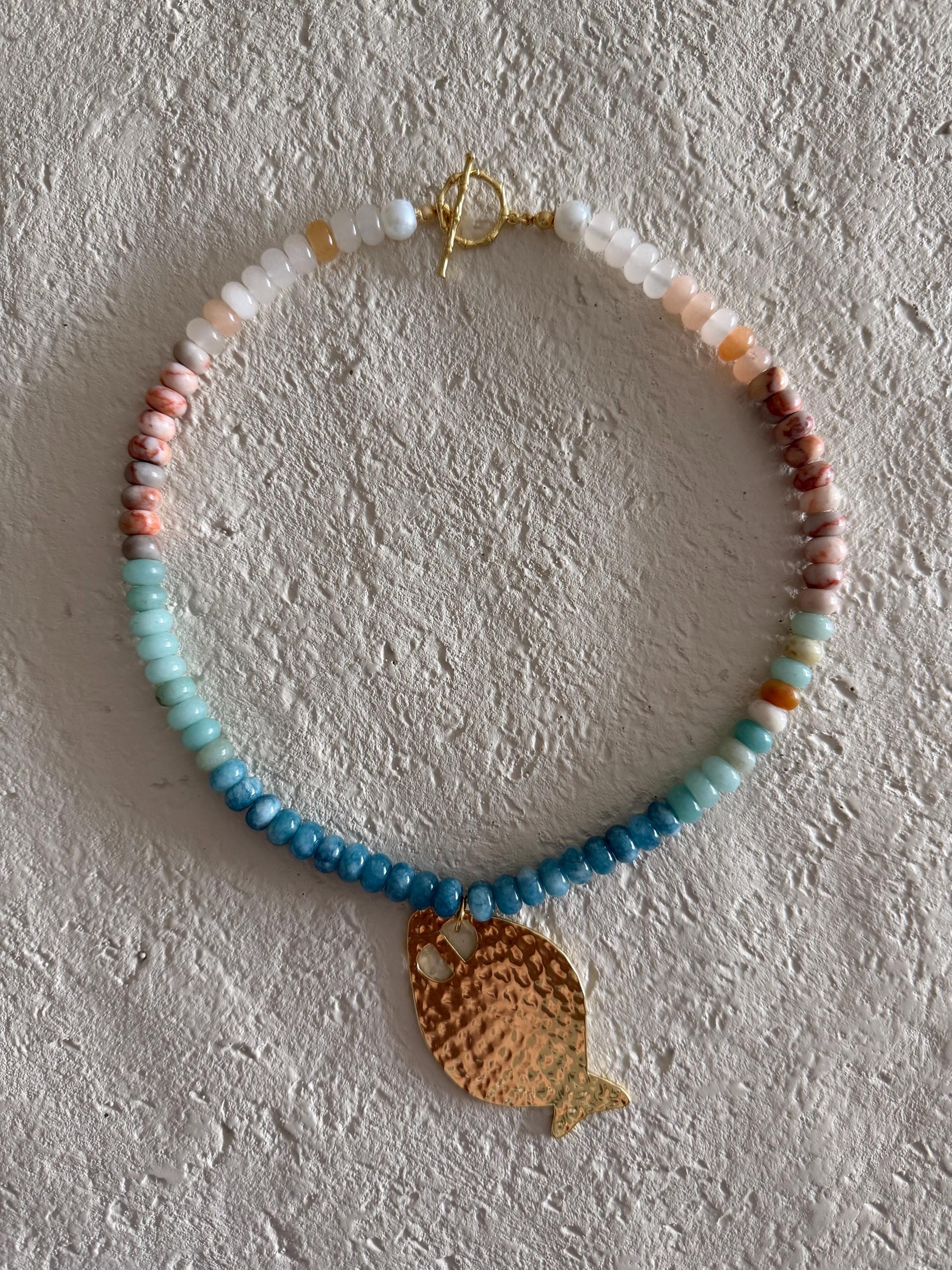 This handcrafted necklace features a dreamy blend of multicolor gemstones in soft ocean hues — creamy whites, warm coral tones, seafoam, and deep turquoise blues — creating a natural gradient that feels like the shoreline at sunset.