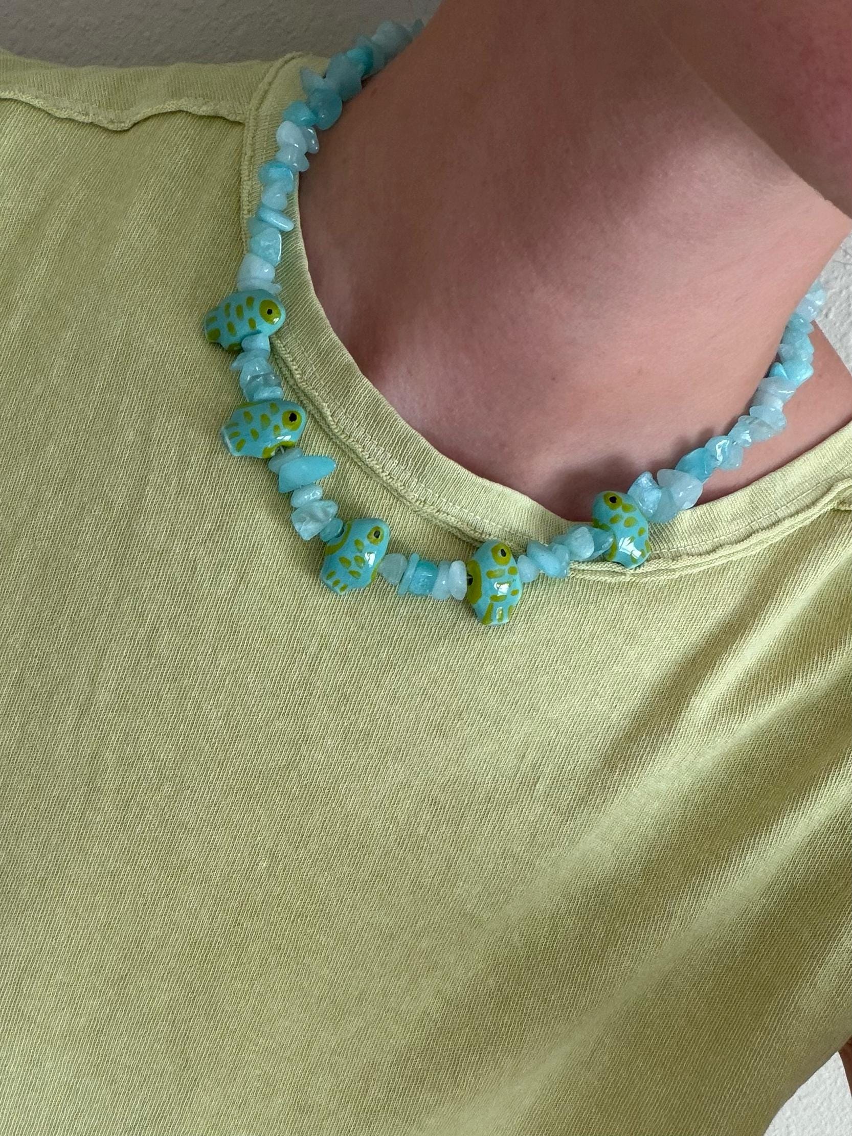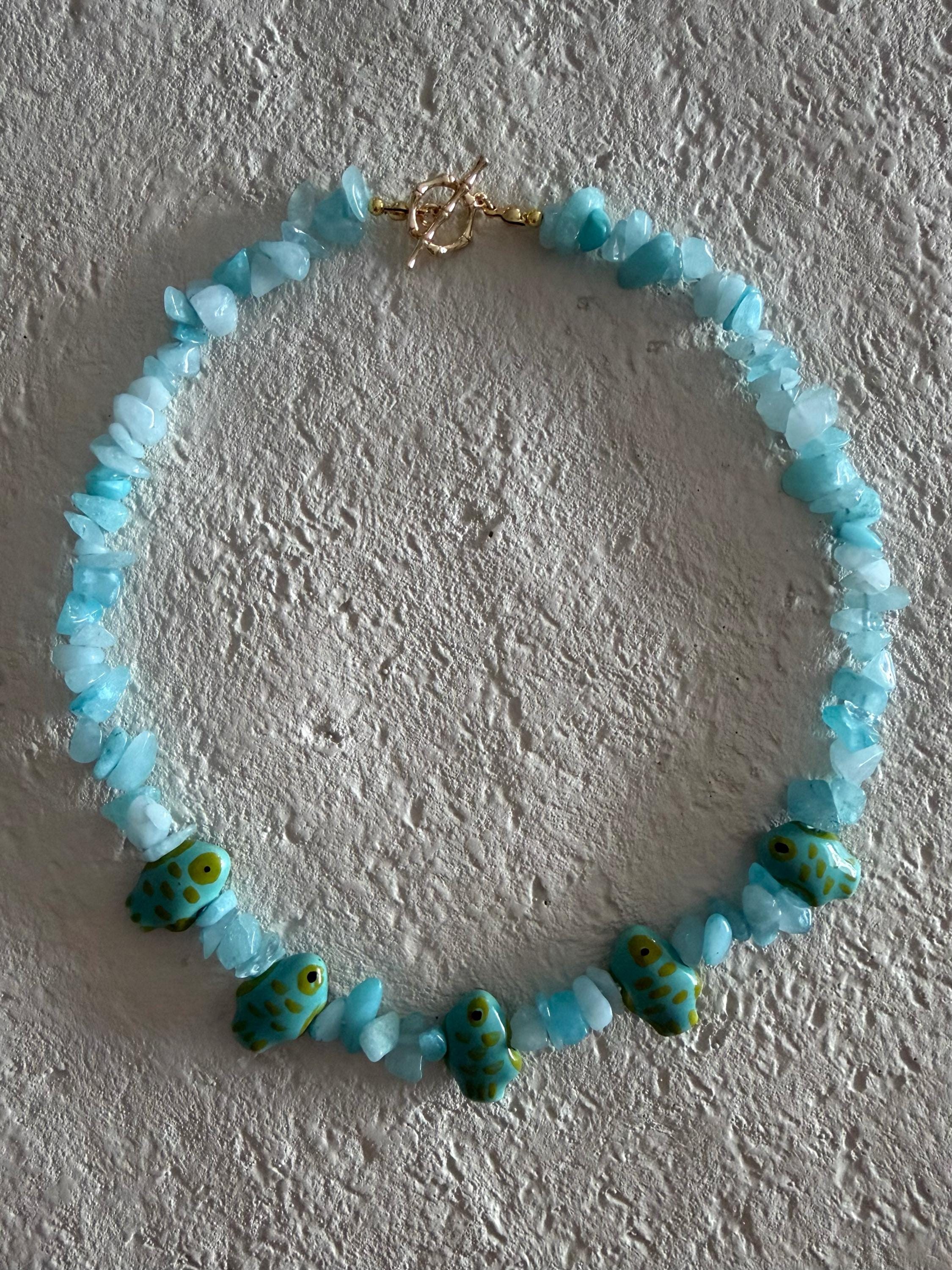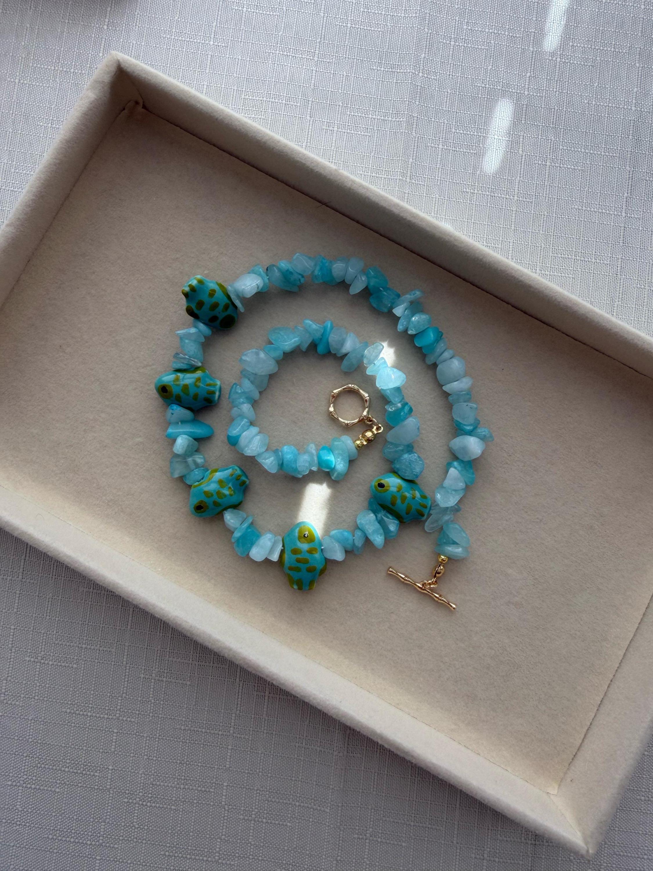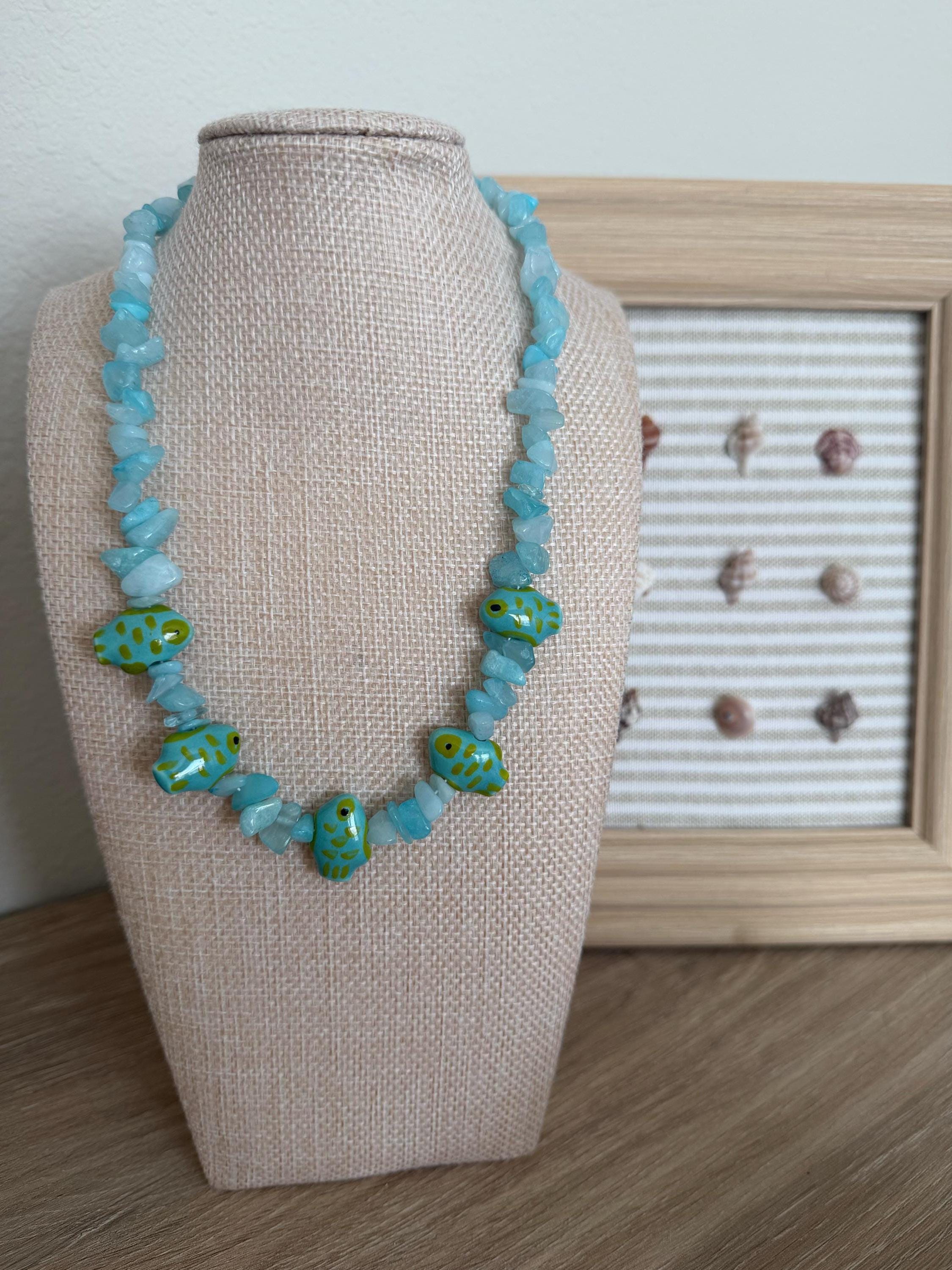 This handmade necklace features soft aqua blue gemstone chips paired with whimsical ceramic painted fish beads, creating a piece that feels like a little school of fish swimming across the shoreline. The mix of organic gemstone texture and vibrant ocean tones makes this necklace both fun and effortlessly coastal.