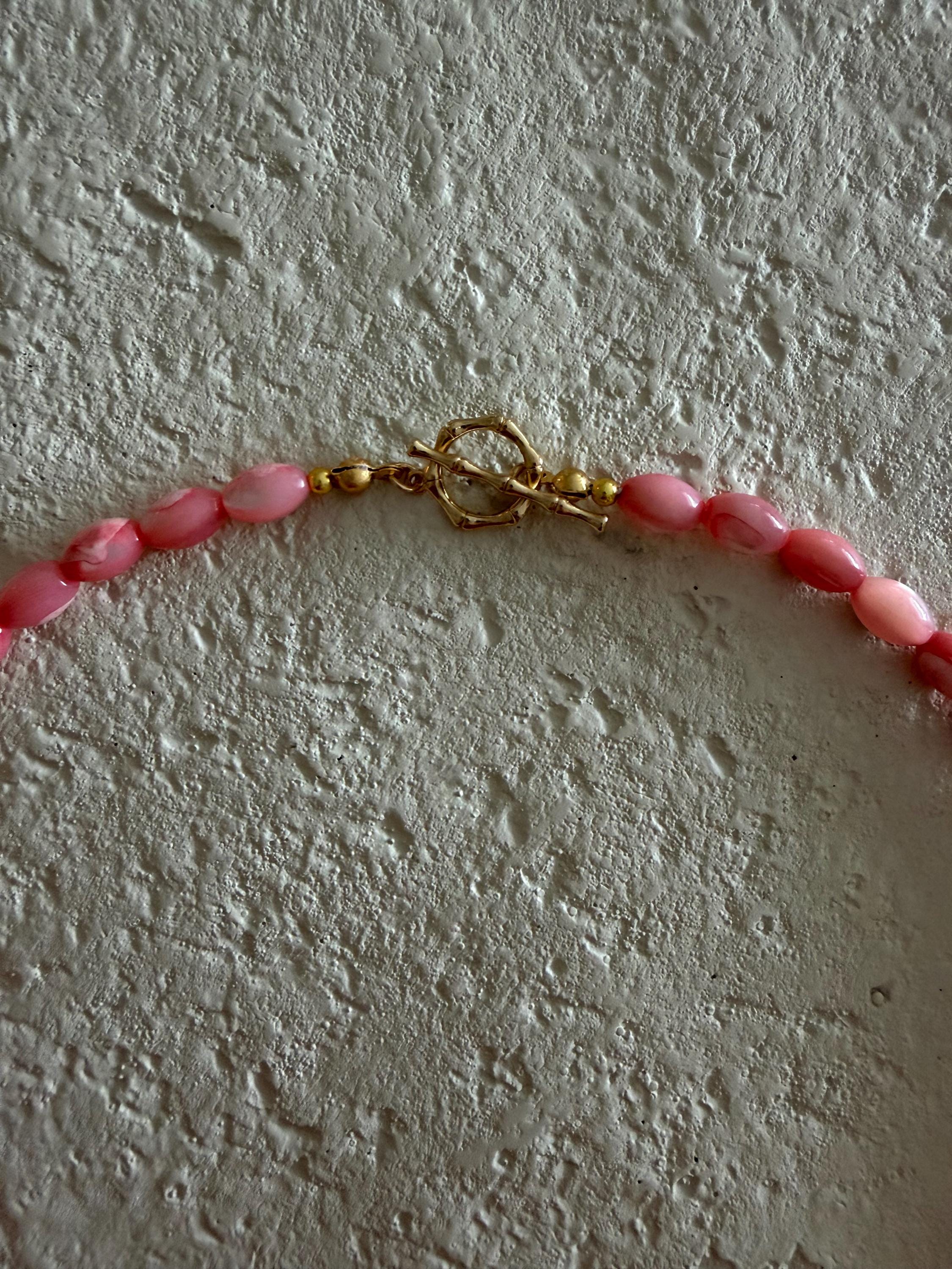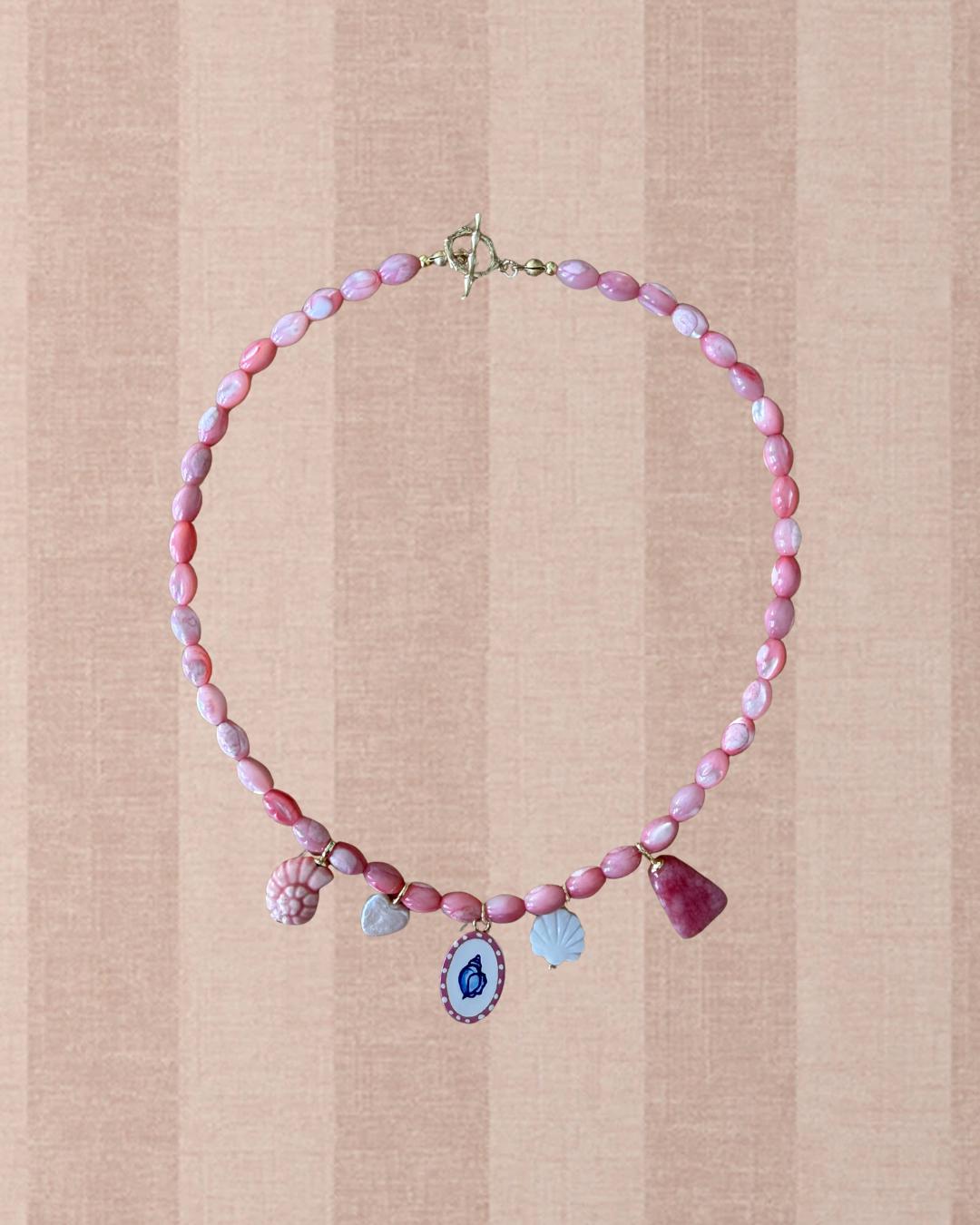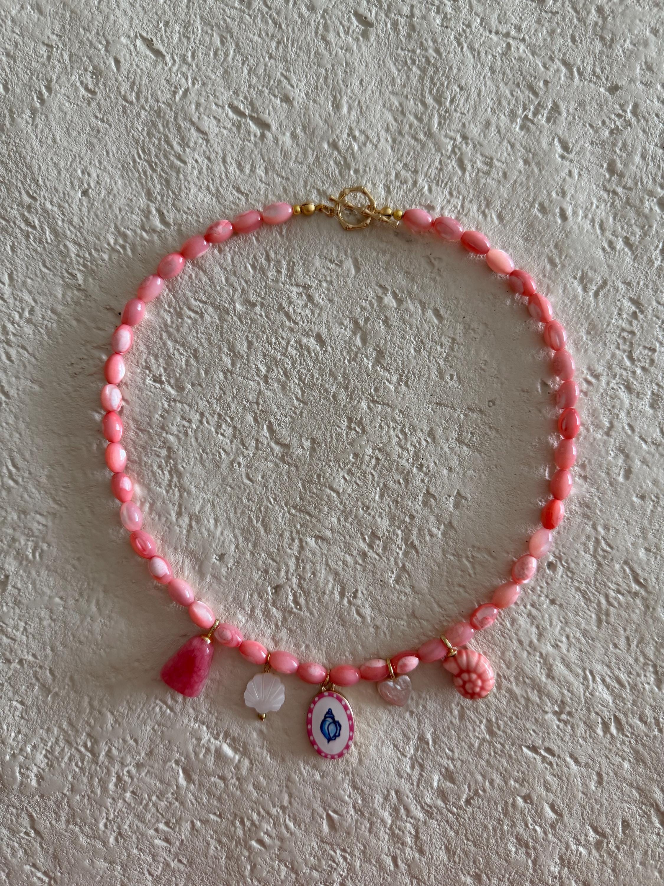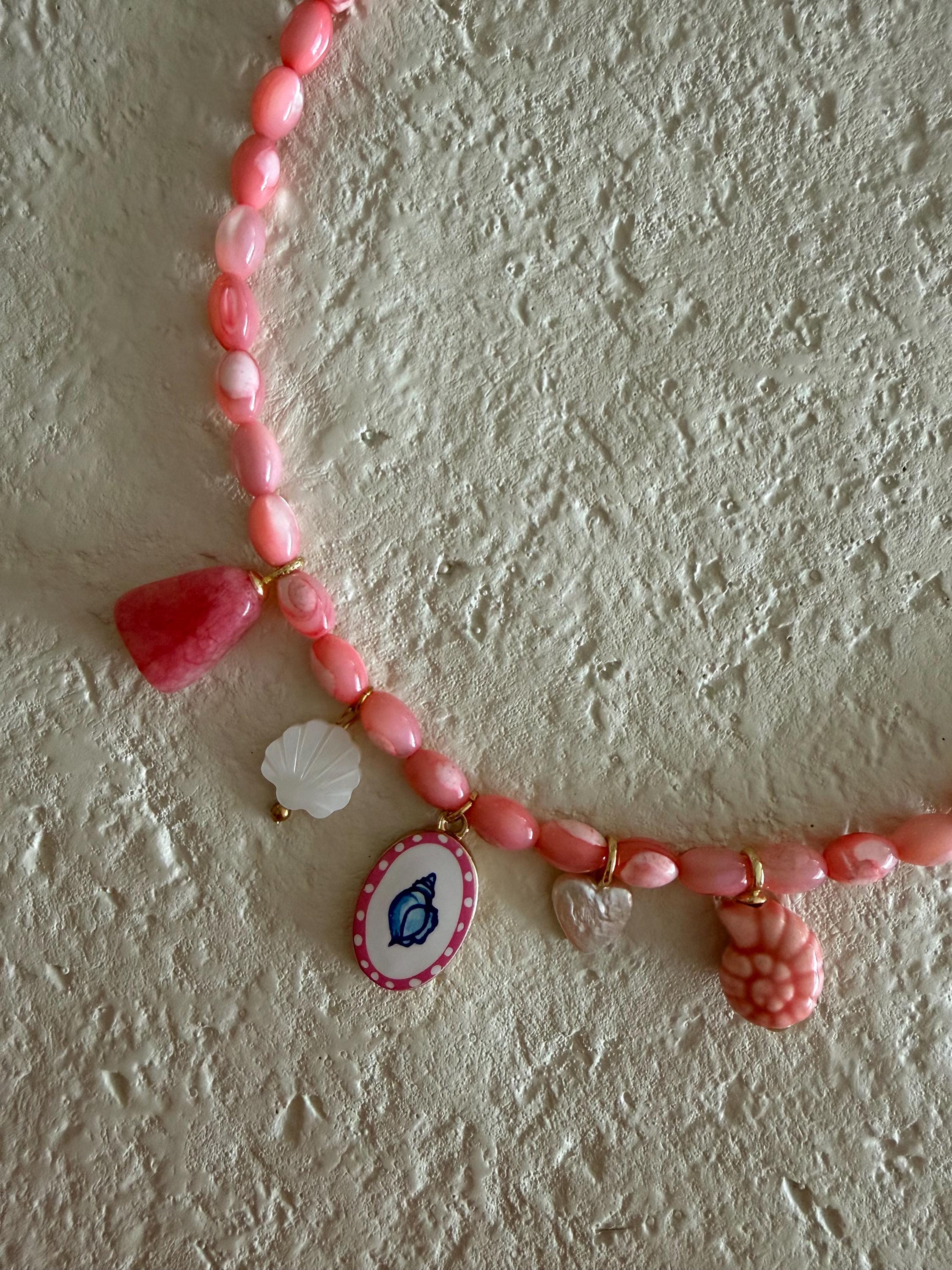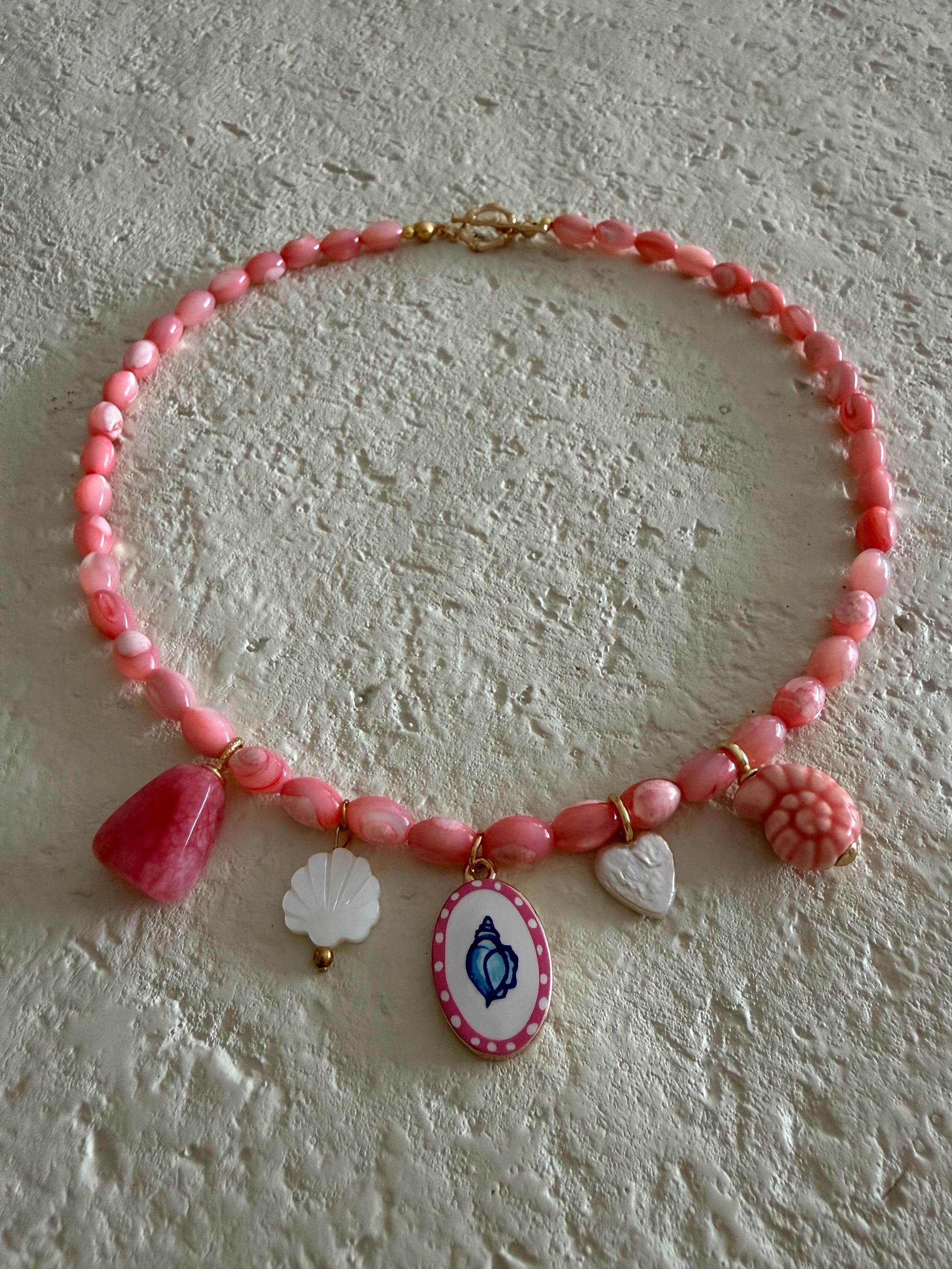The Coral Keepsake necklace captures the warmth and color of seaside sunsets. Featuring soft pink beads and a curated mix of ocean-inspired charms. This piece feels joyful, playful, and full of coastal charm.
