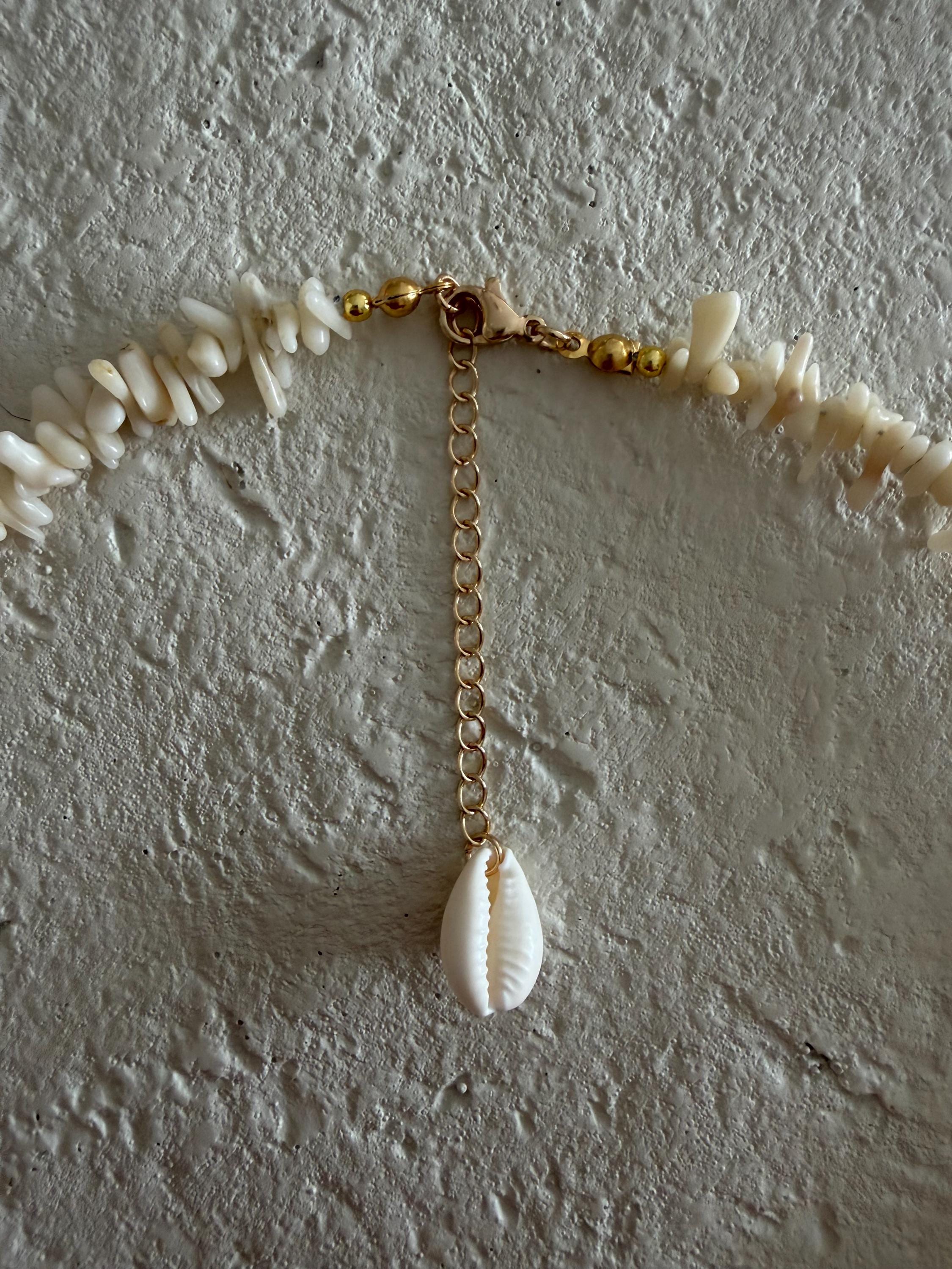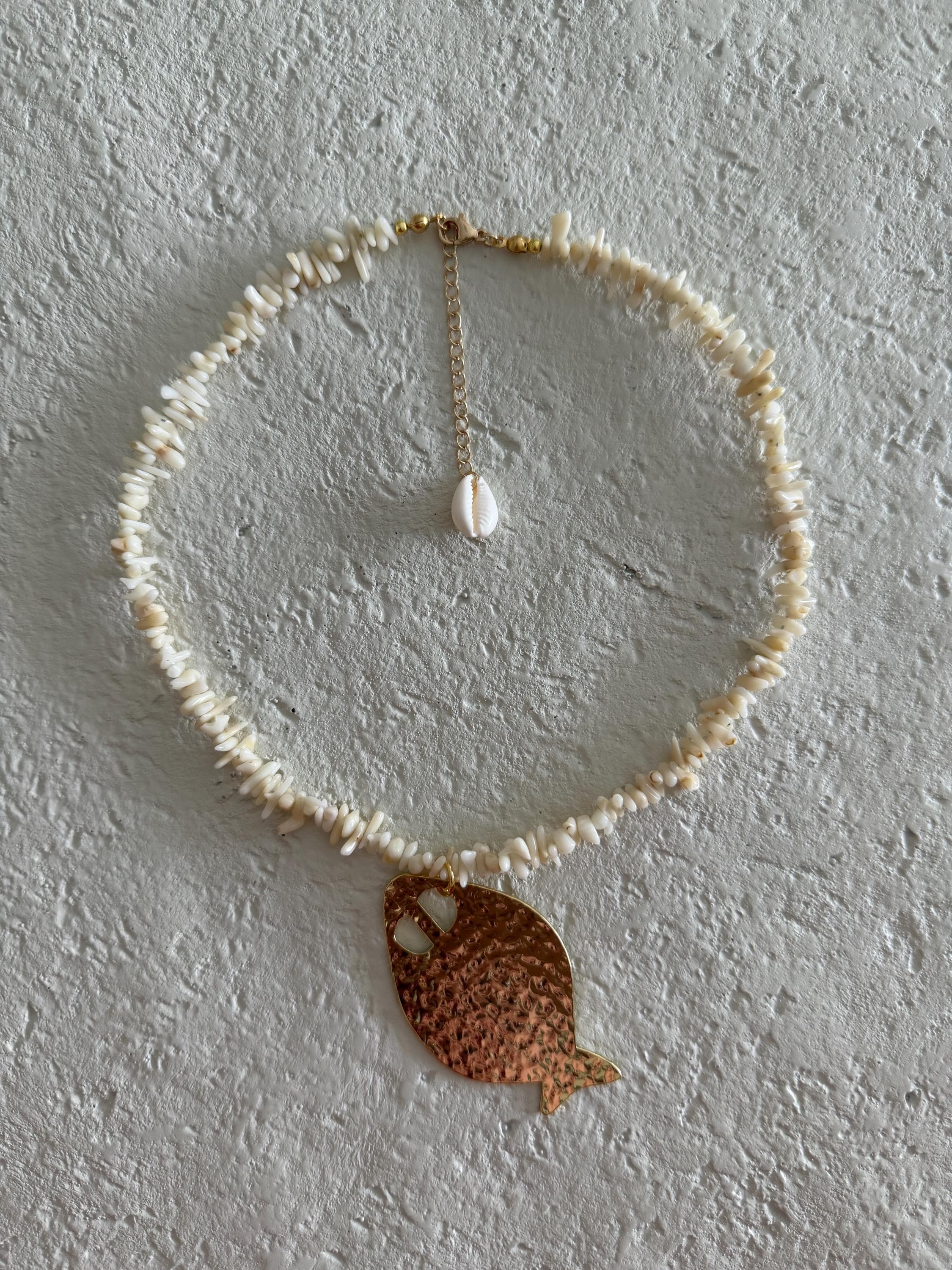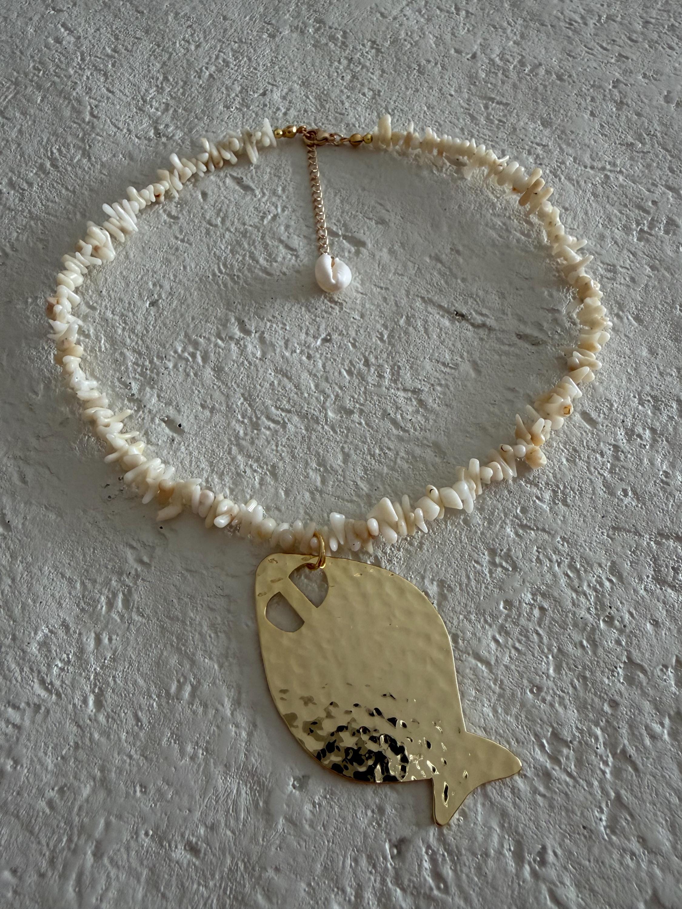 This handcrafted necklace features natural cream coral branch beads, each with its own organic shape and texture, creating a strand that feels beautifully raw and collected. The soft neutral tones are finished with a large hammered gold fish pendant — adding movement, shine, and a playful coastal touch.