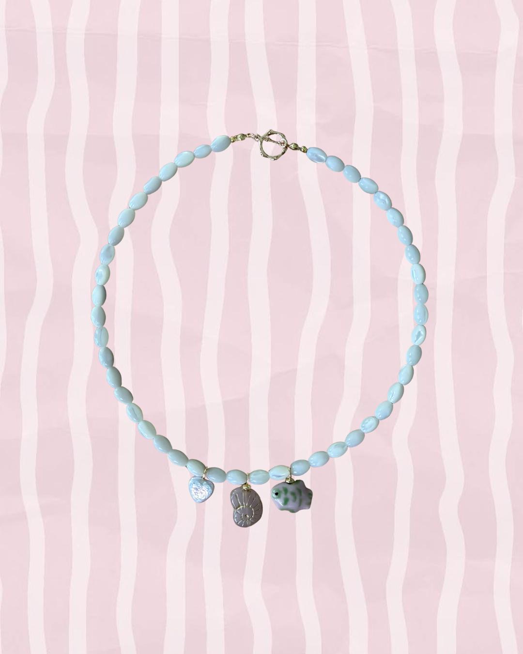 Soft and timeless, the Seaside Keepsake necklace is inspired by small treasures collected along the shore. Creamy white beads are paired with delicate ocean charms — including a shell, spiral, and heart — creating a piece that feels both playful and nostalgic.