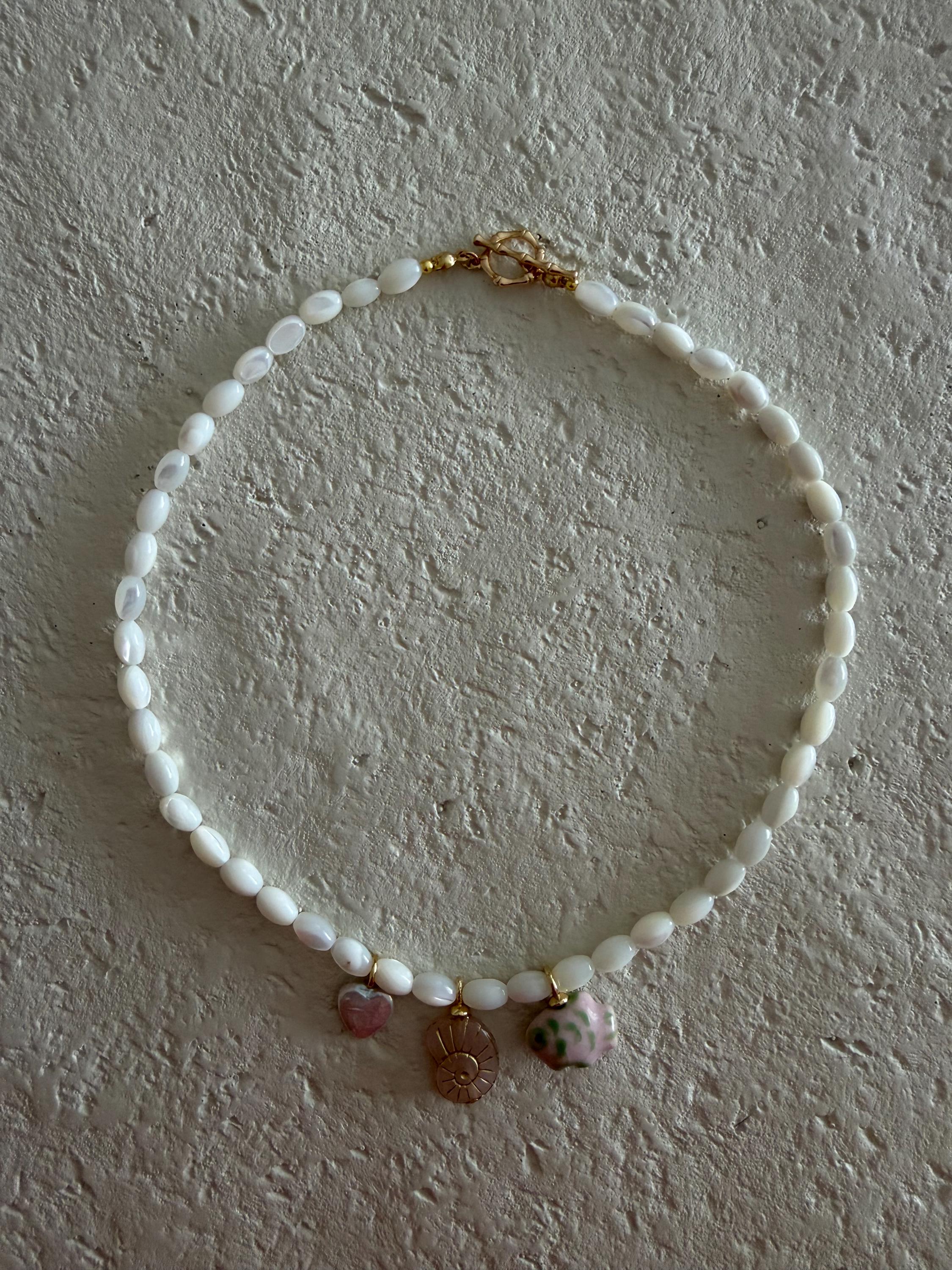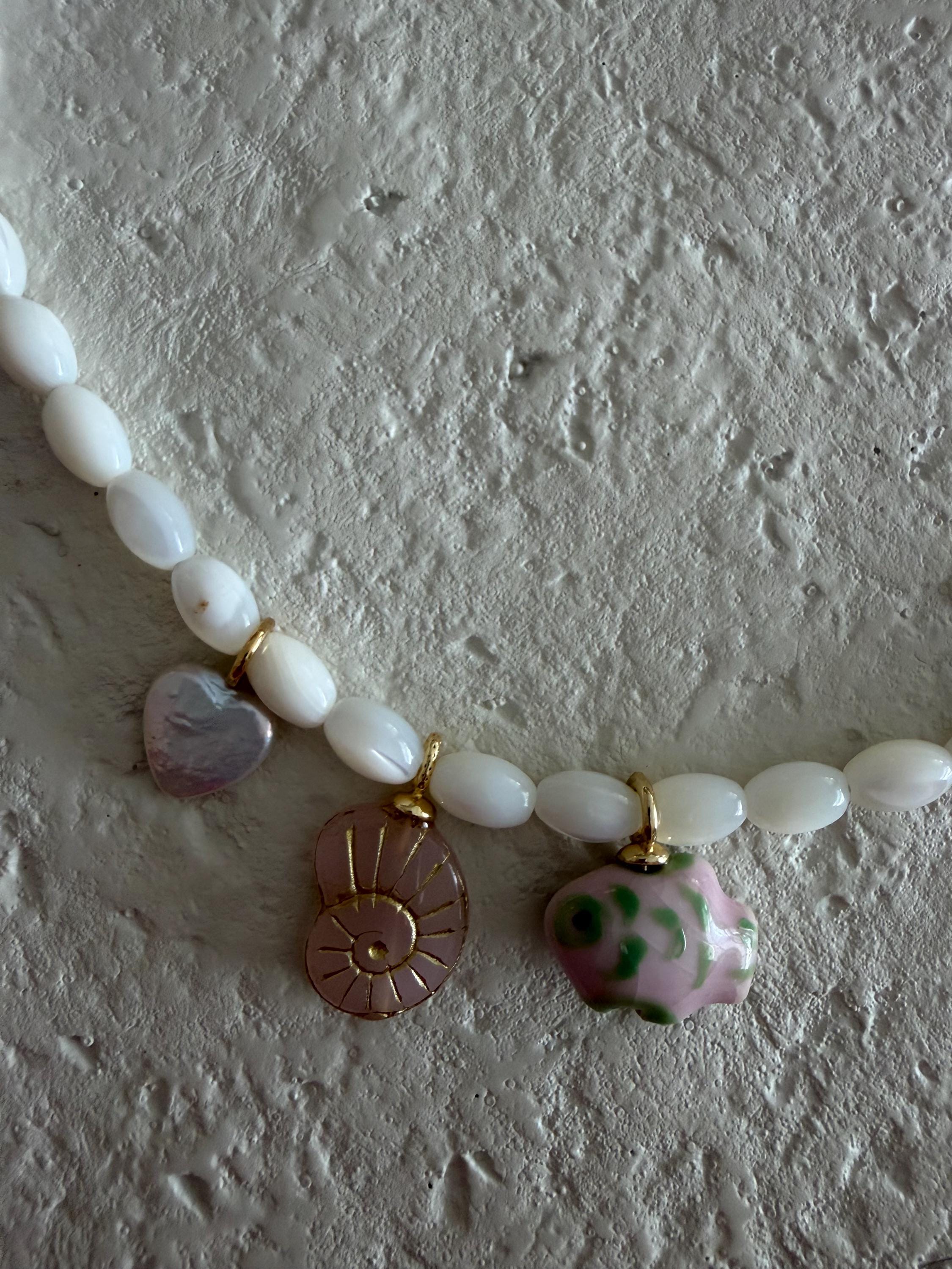• Materials: White pearl rice beads with various pink coastal charms