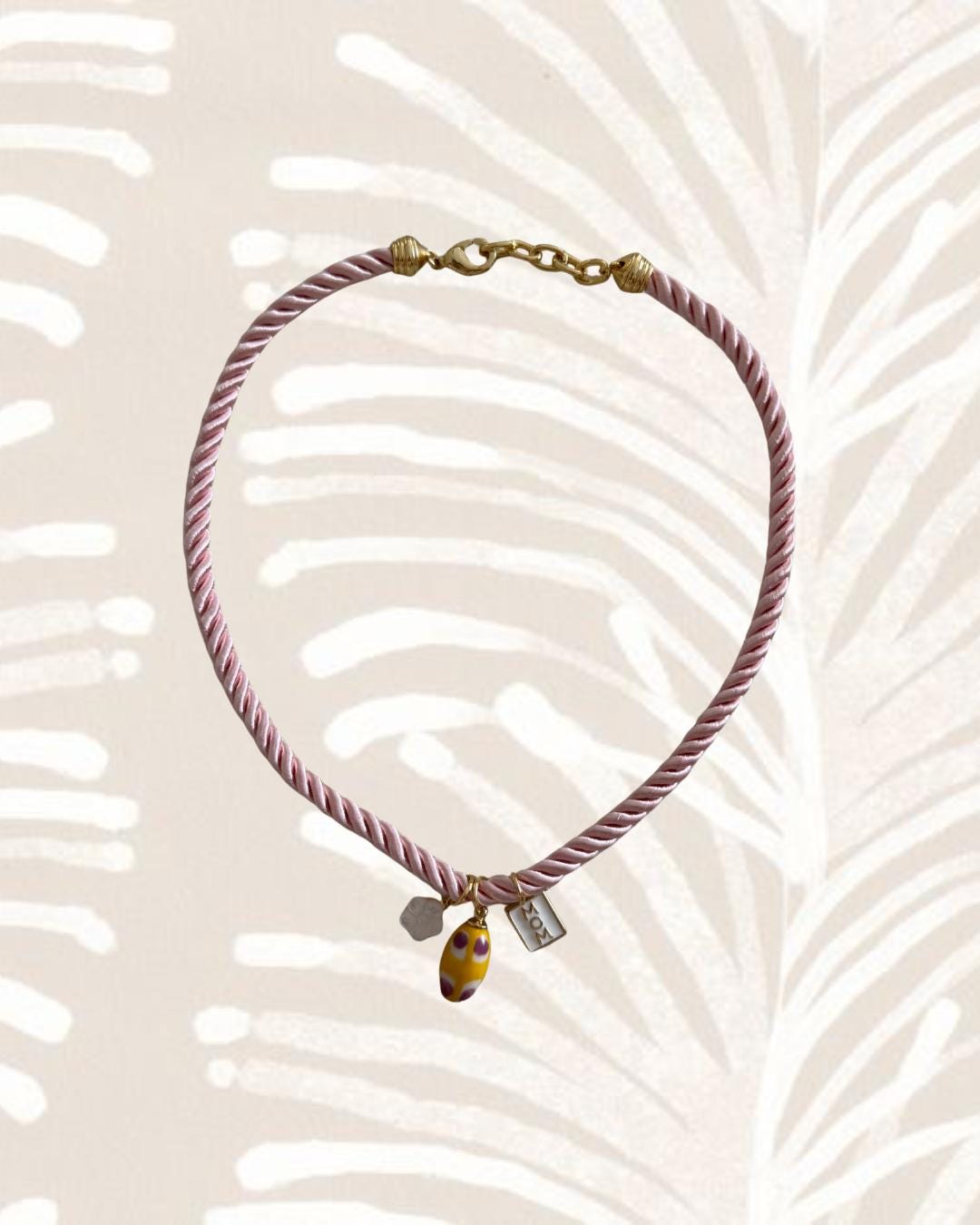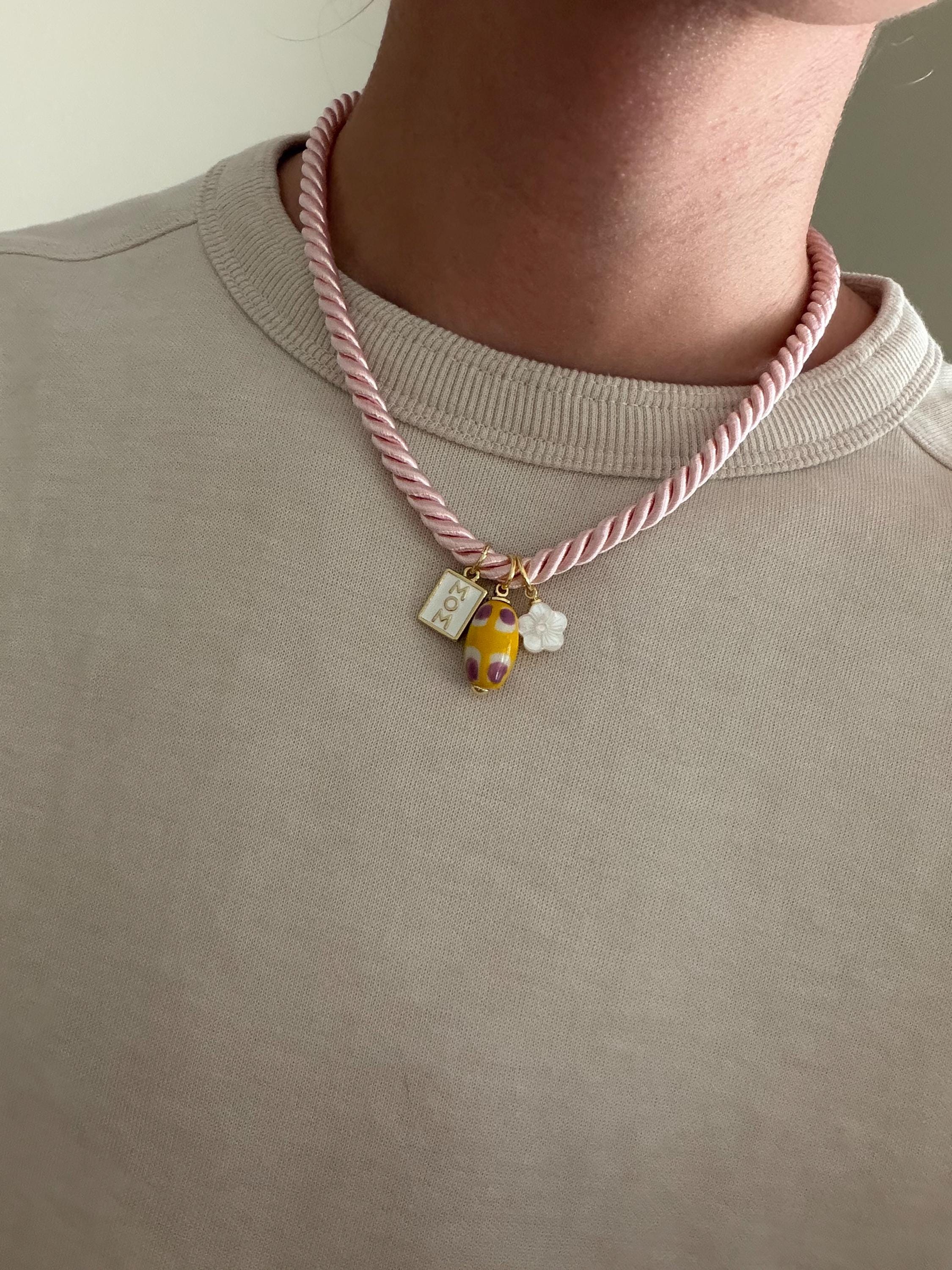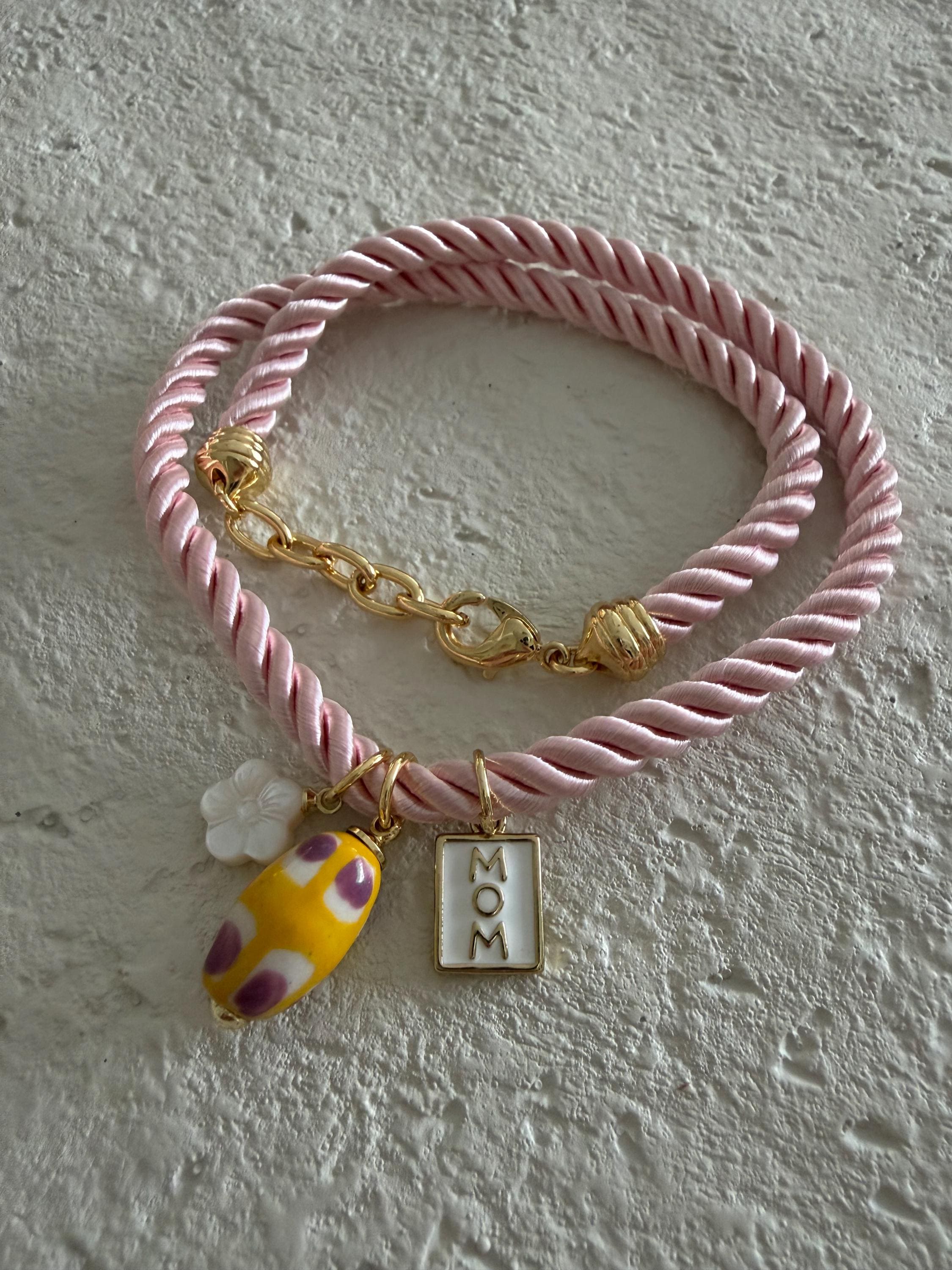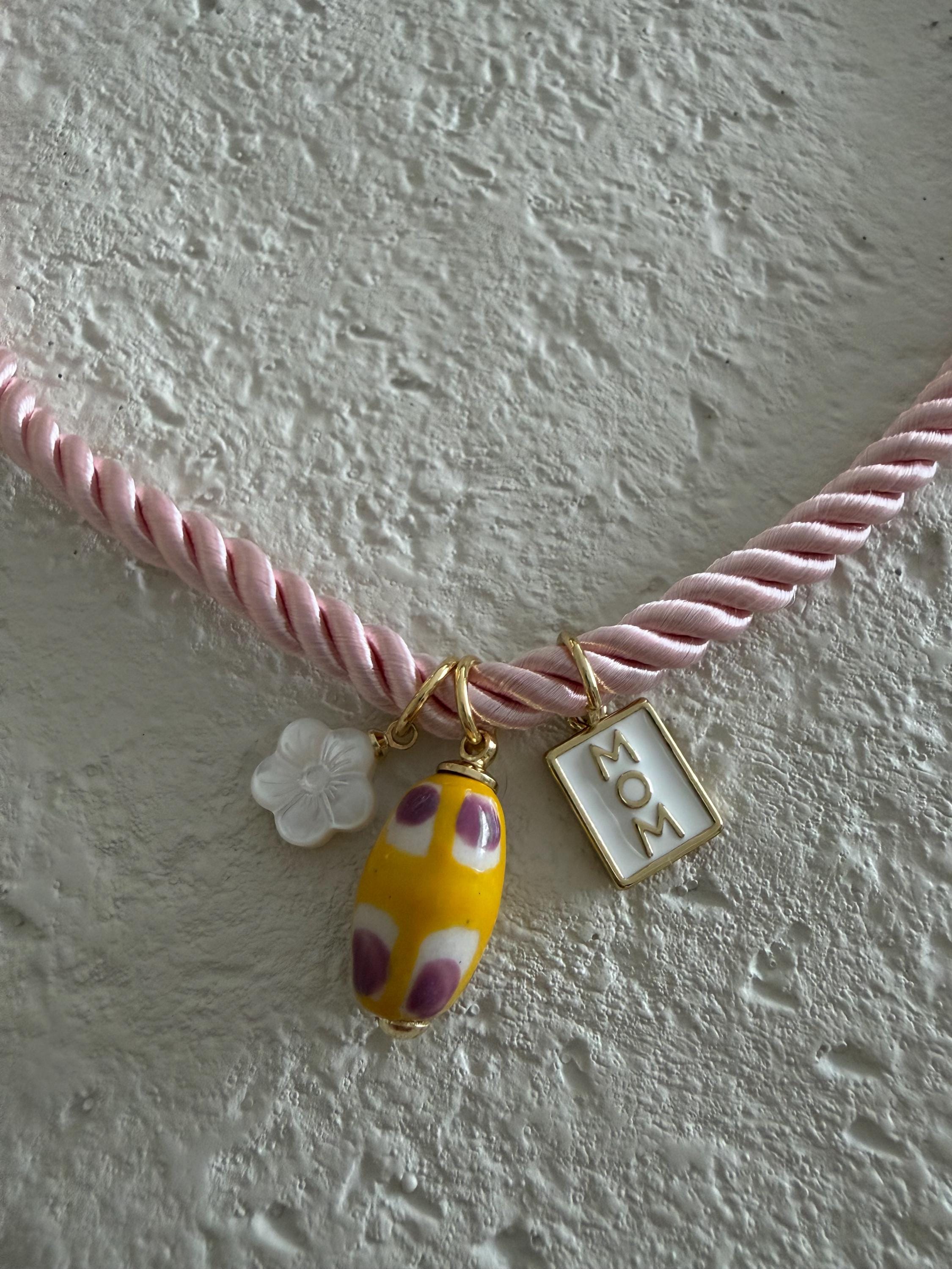• Materials: Mom charm, flower charm, yellow ceramic pendant & pink braided silk rope cord