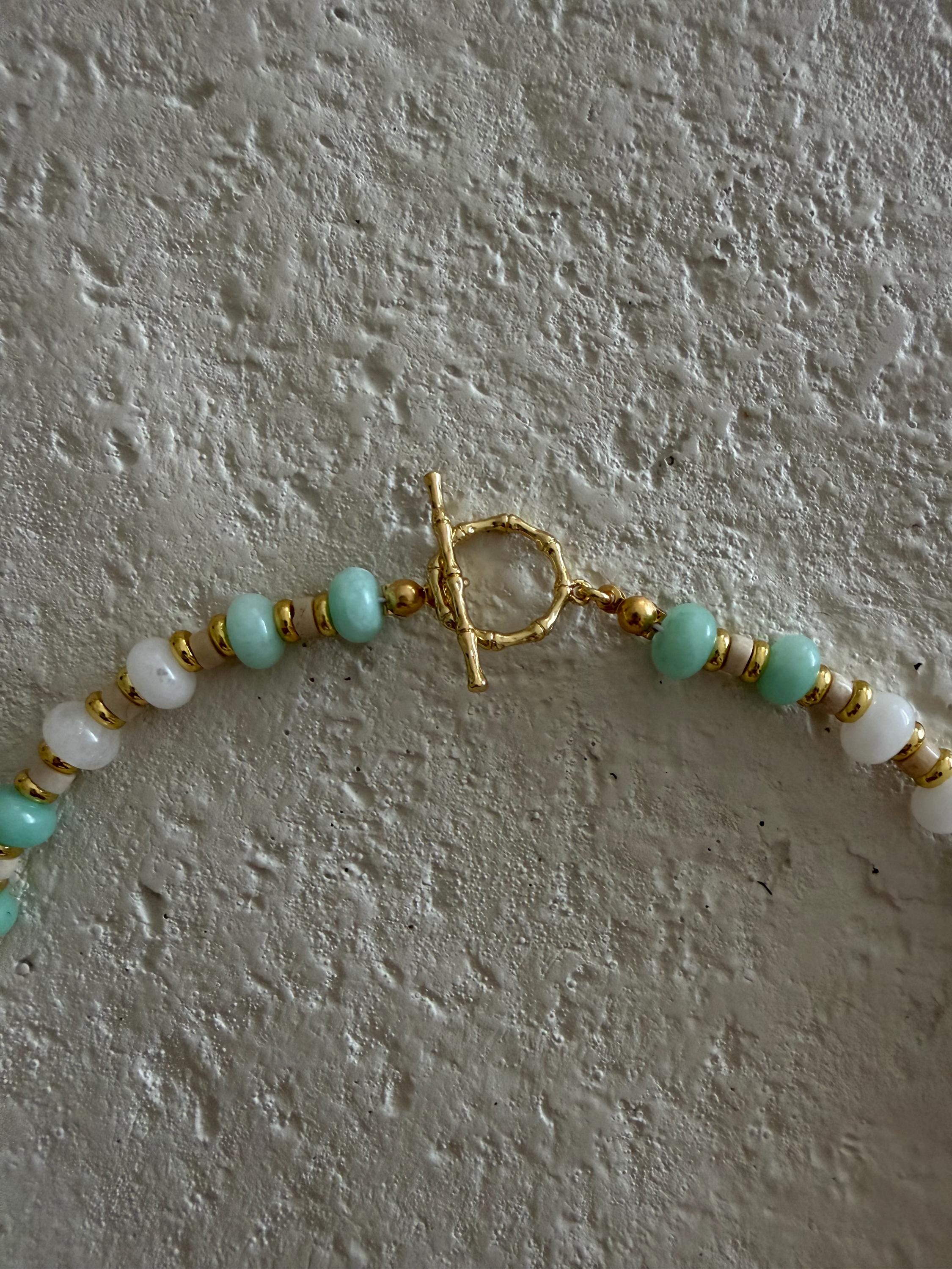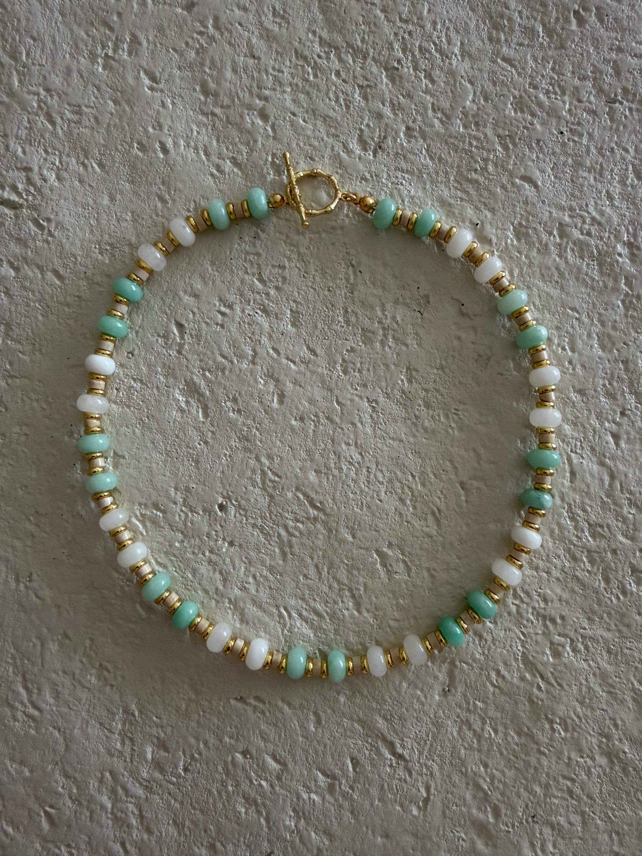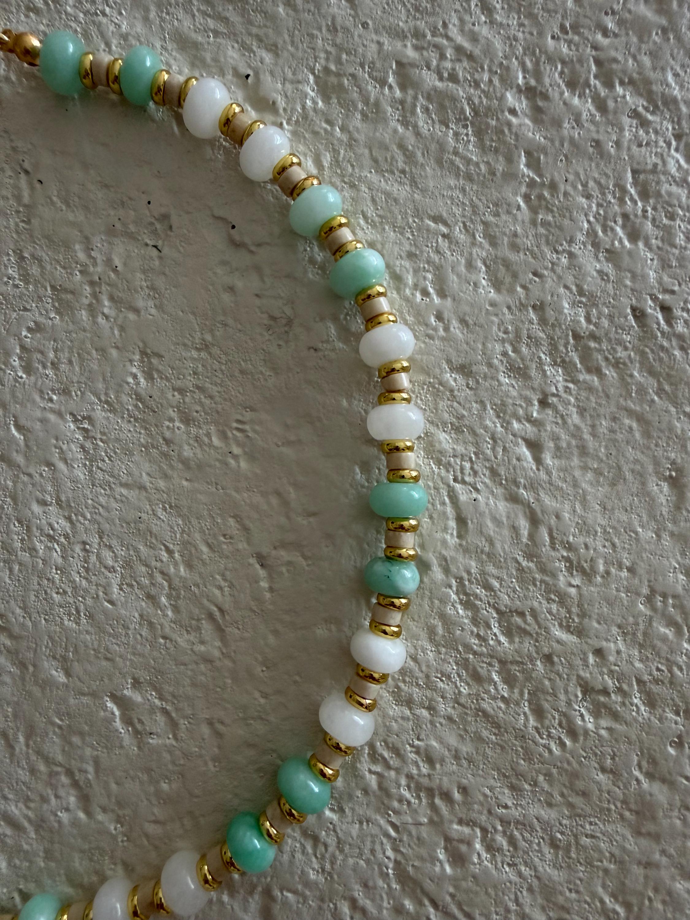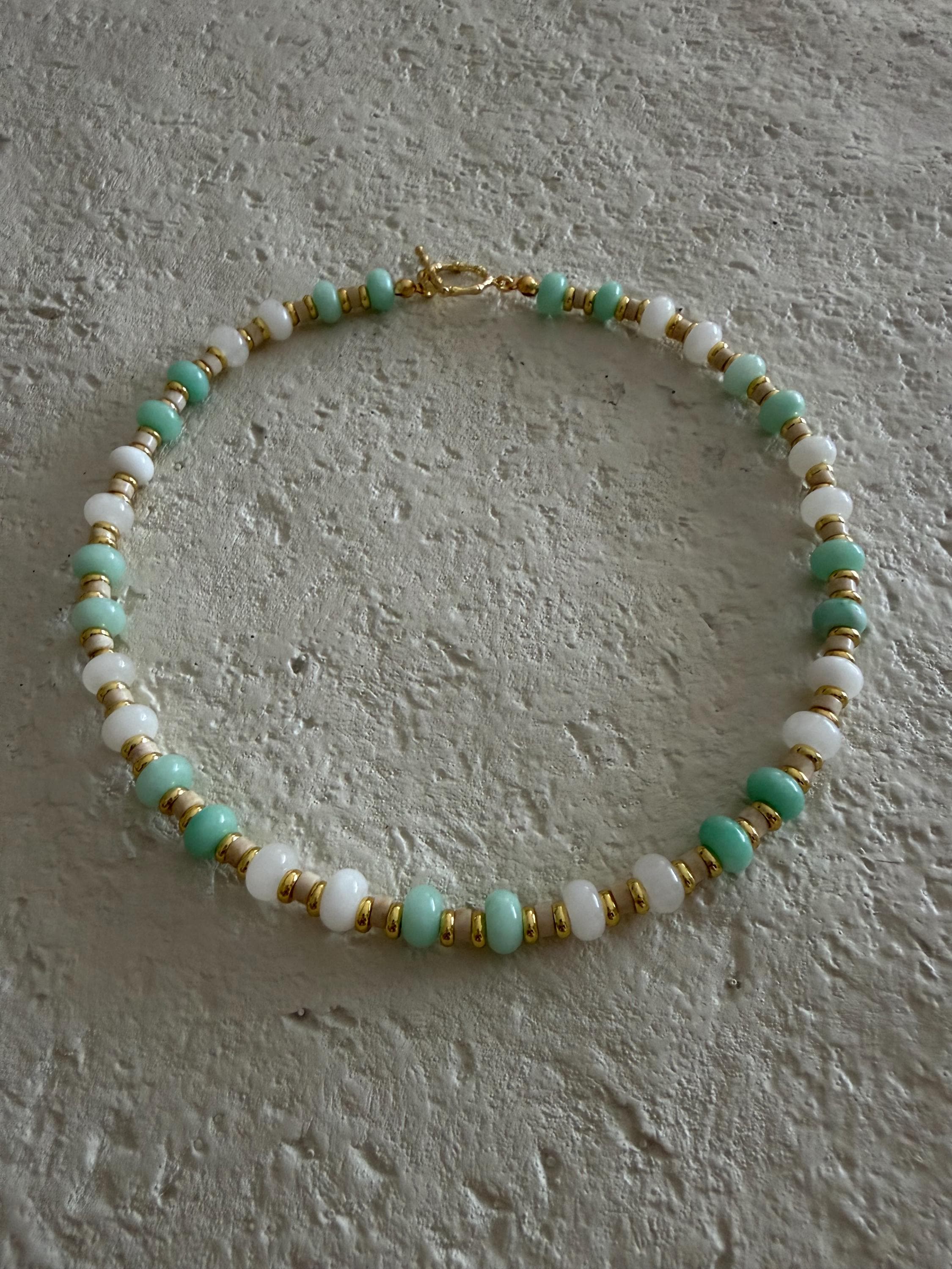 • Materials: Seafoam & white rondelle beads, gold plated beads & natural Riverstone heishi beads