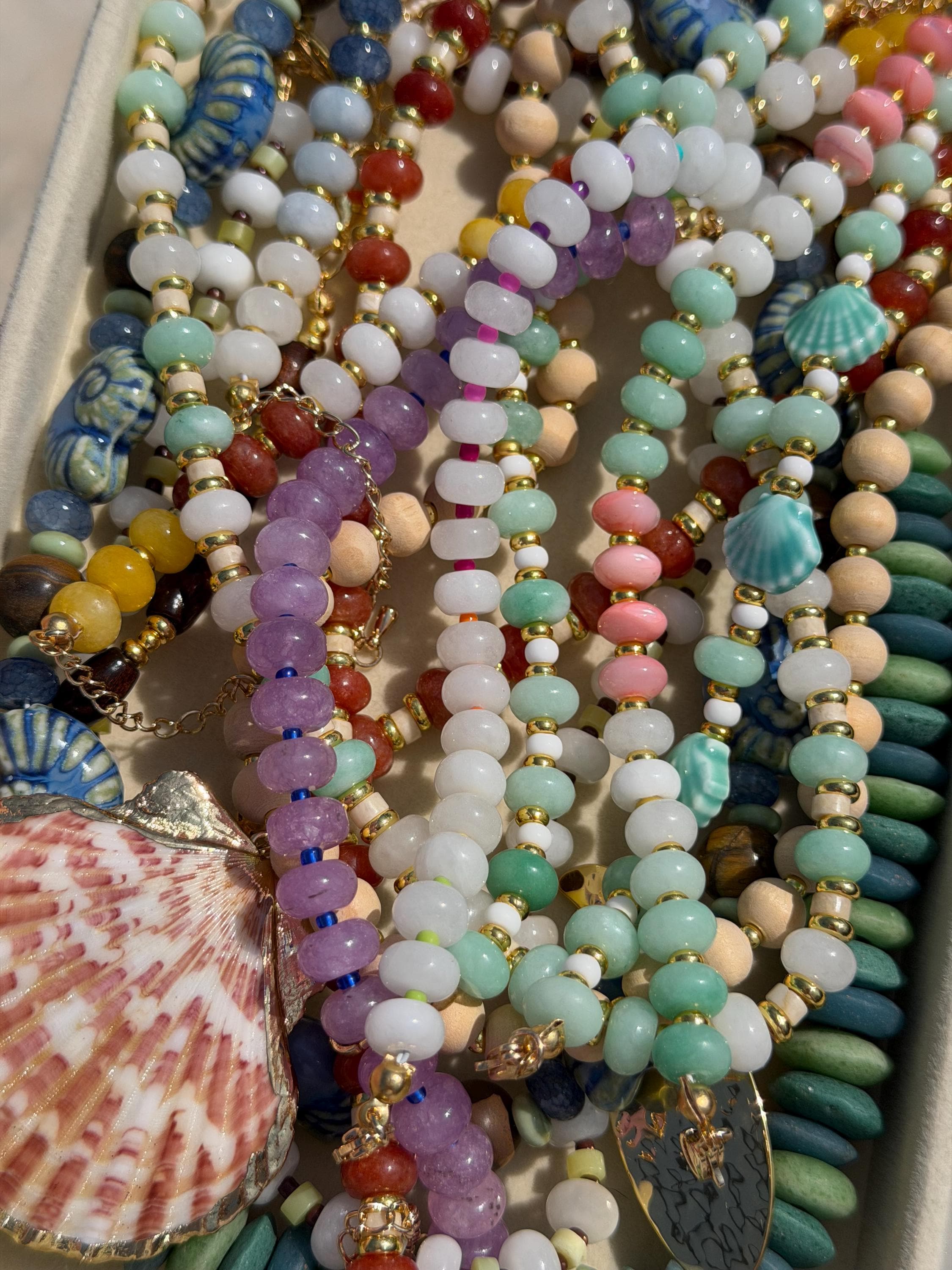 Our jewelry is handcrafted using glass beads, natural stones, wood, and 14k gold plated or stainless steel components. Every piece is made with quality and durability in mind.