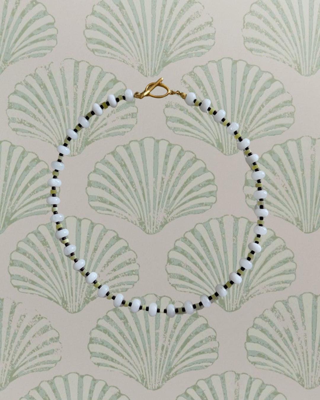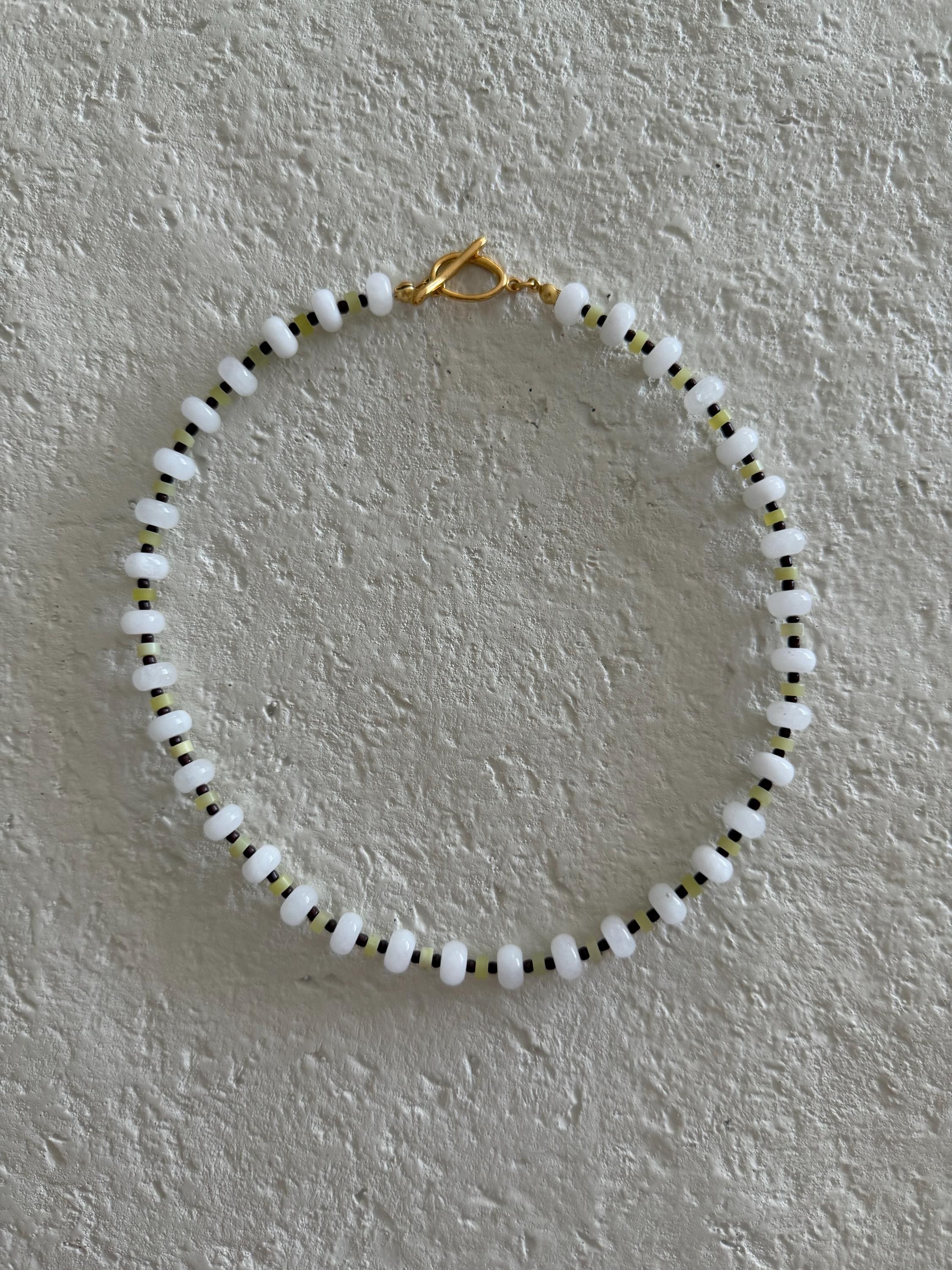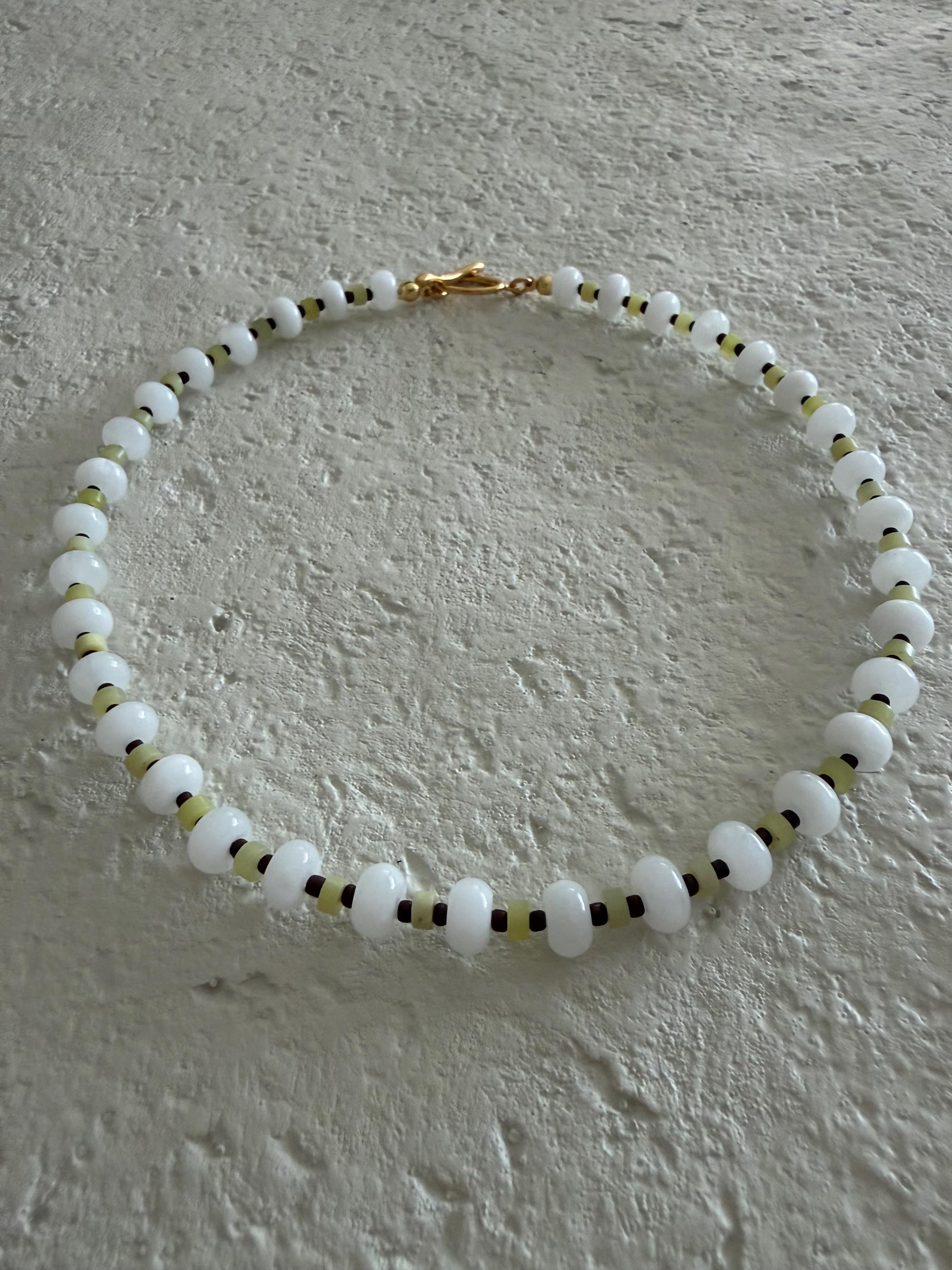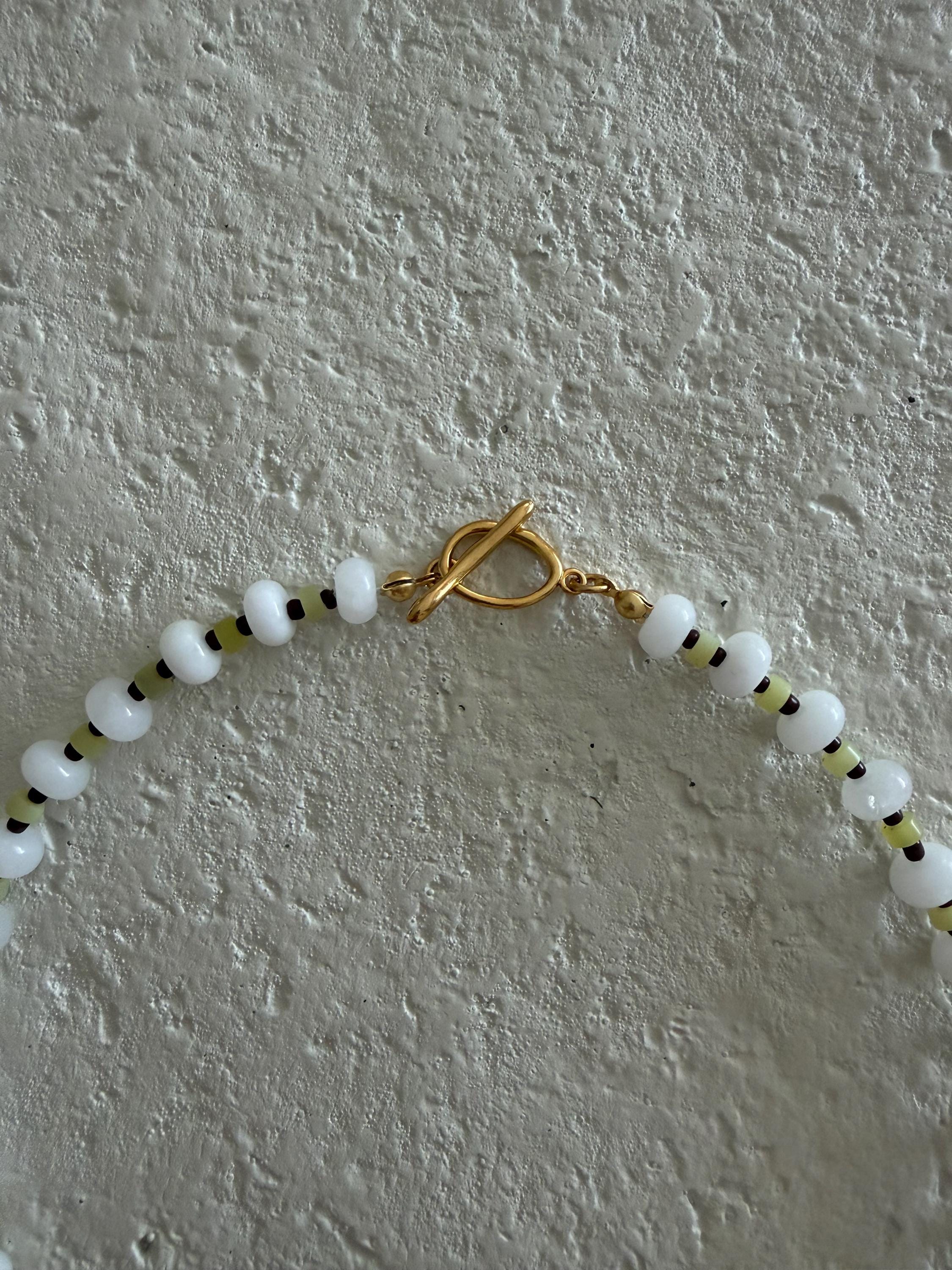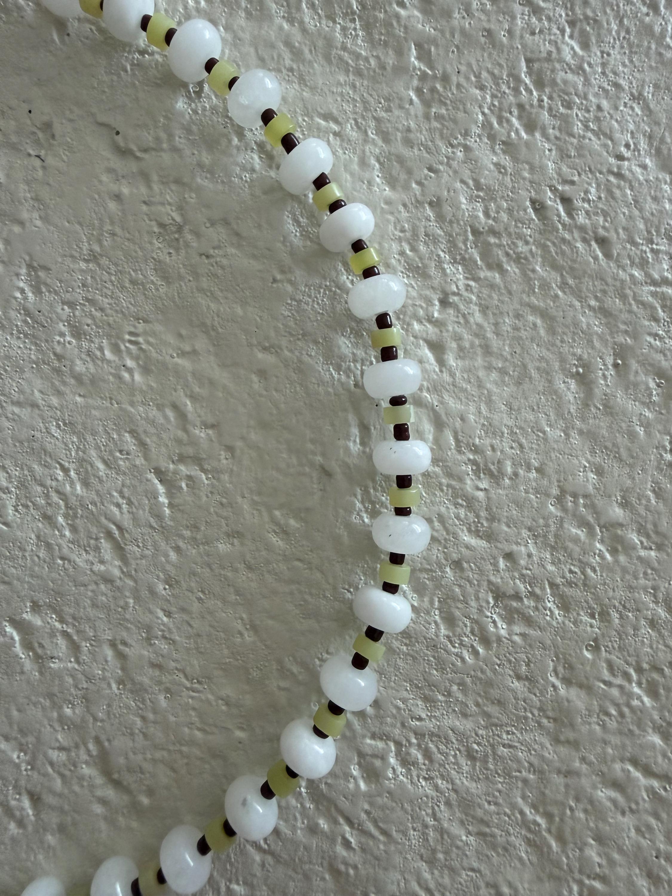 • Materials: White rondelle beads, light green heishi beads & brown seed beads