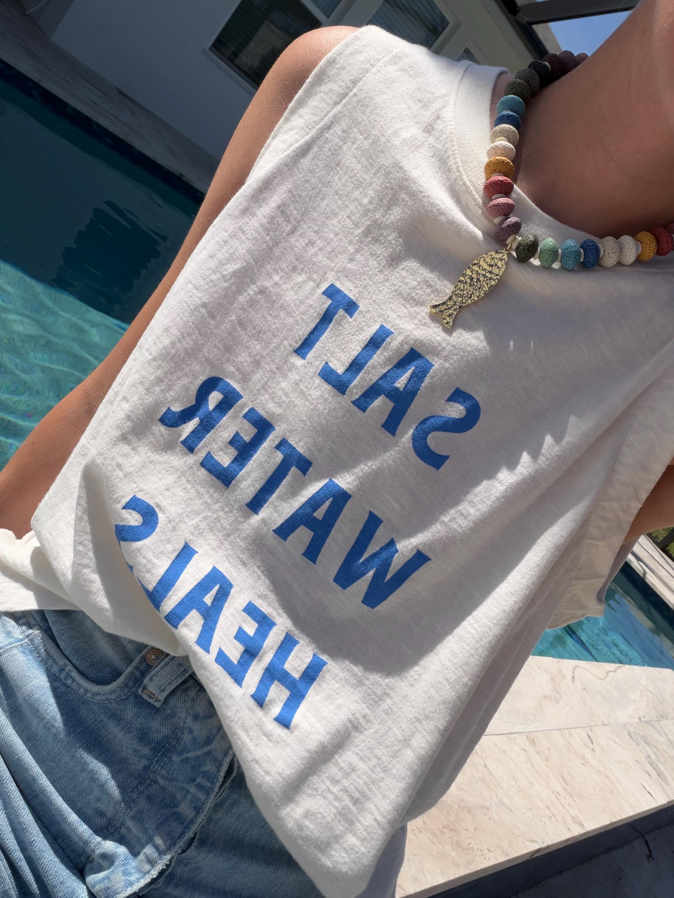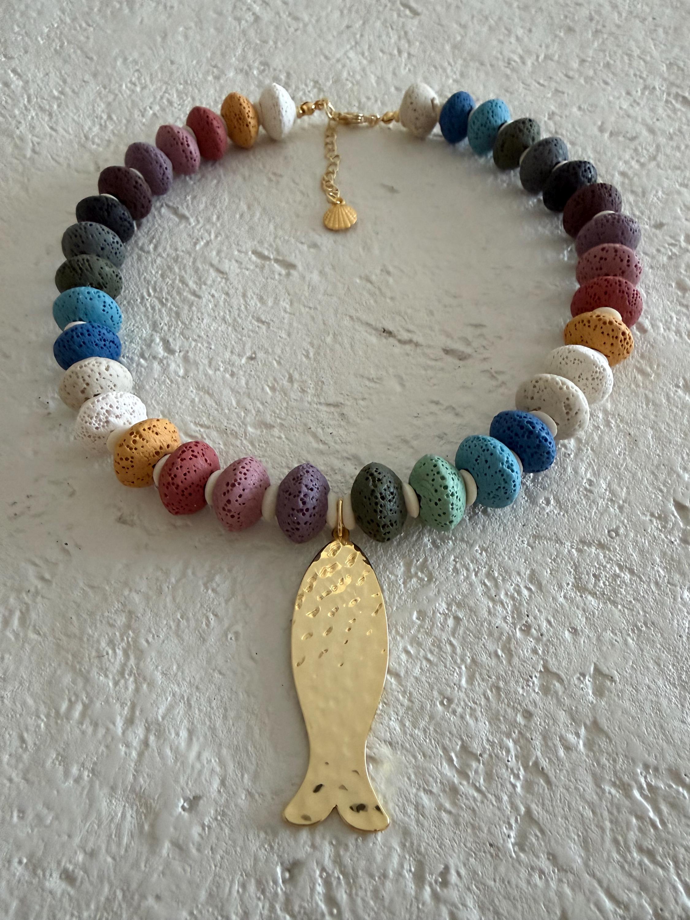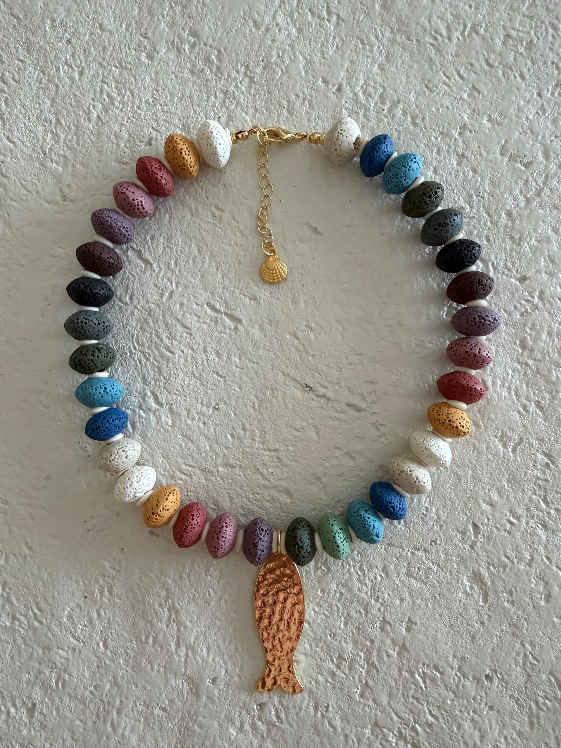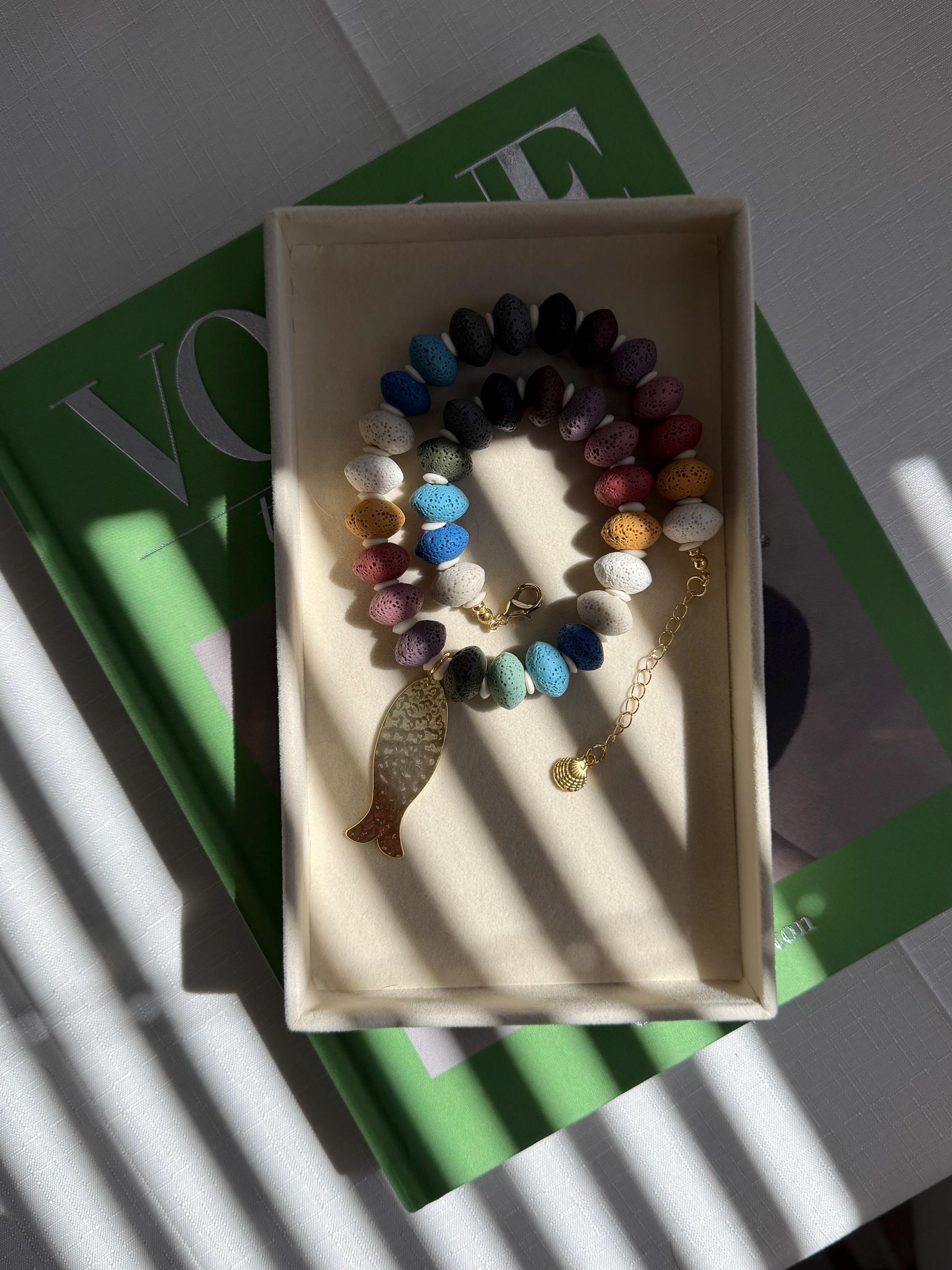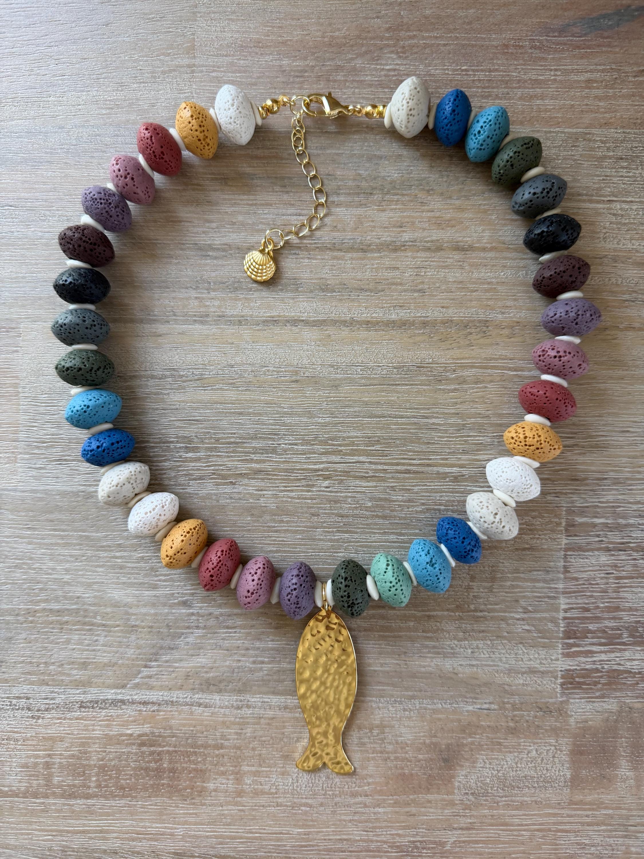 This necklace features vibrant lava stone beads, each with a naturally porous texture and lightweight feel. The mix of earthy and ocean-inspired tones creates a playful yet grounded color palette that feels perfectly at home by the sea.
