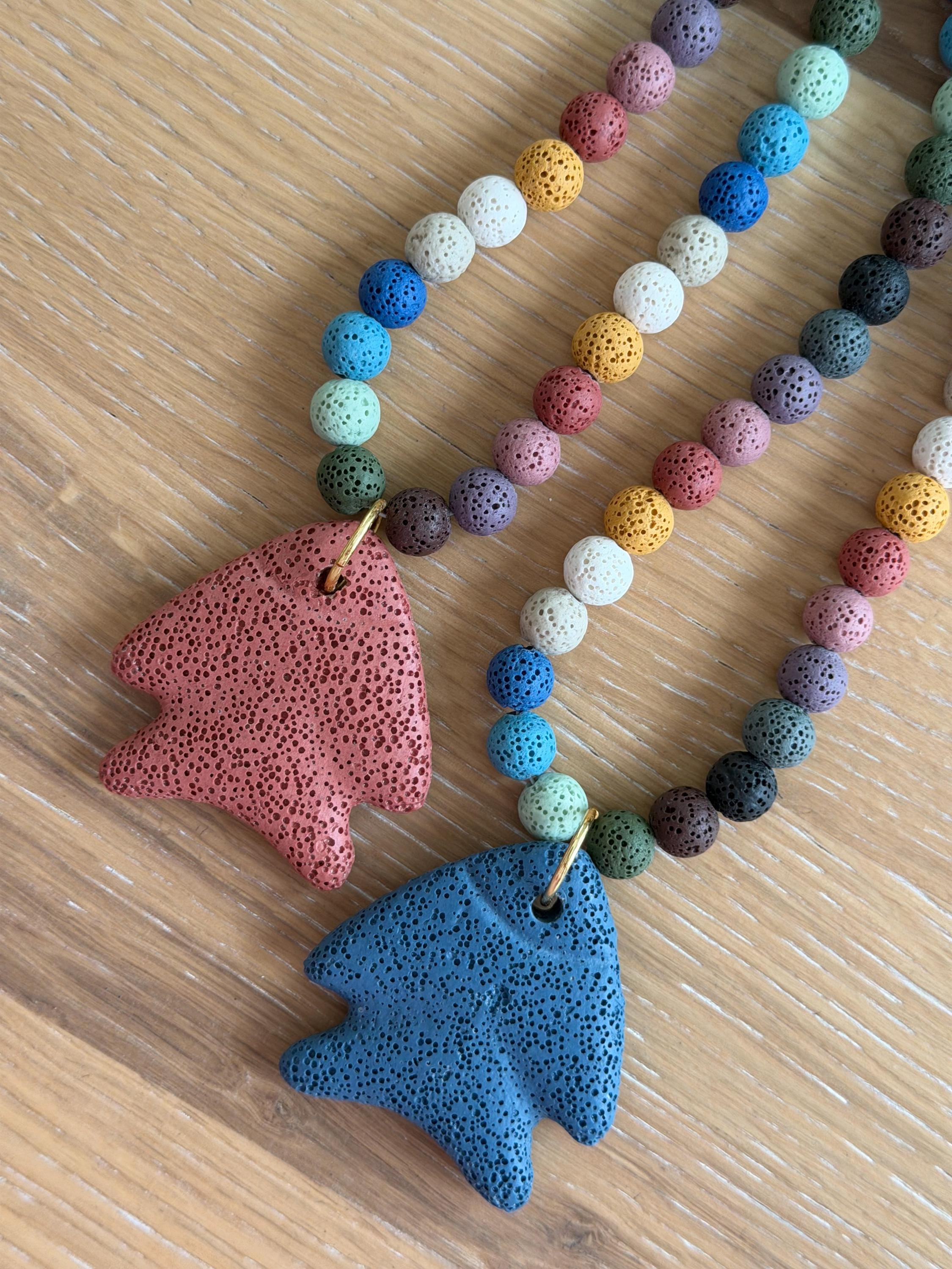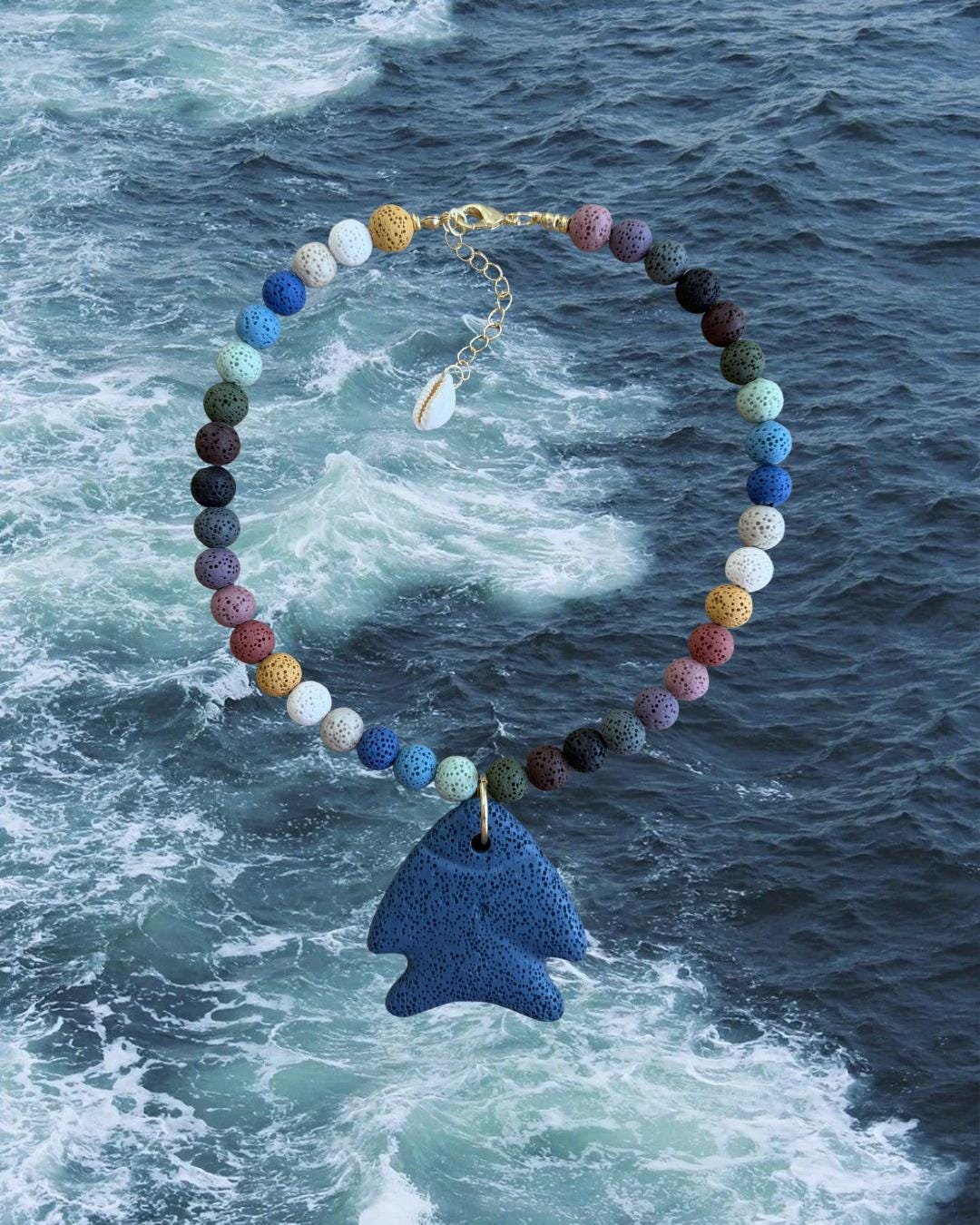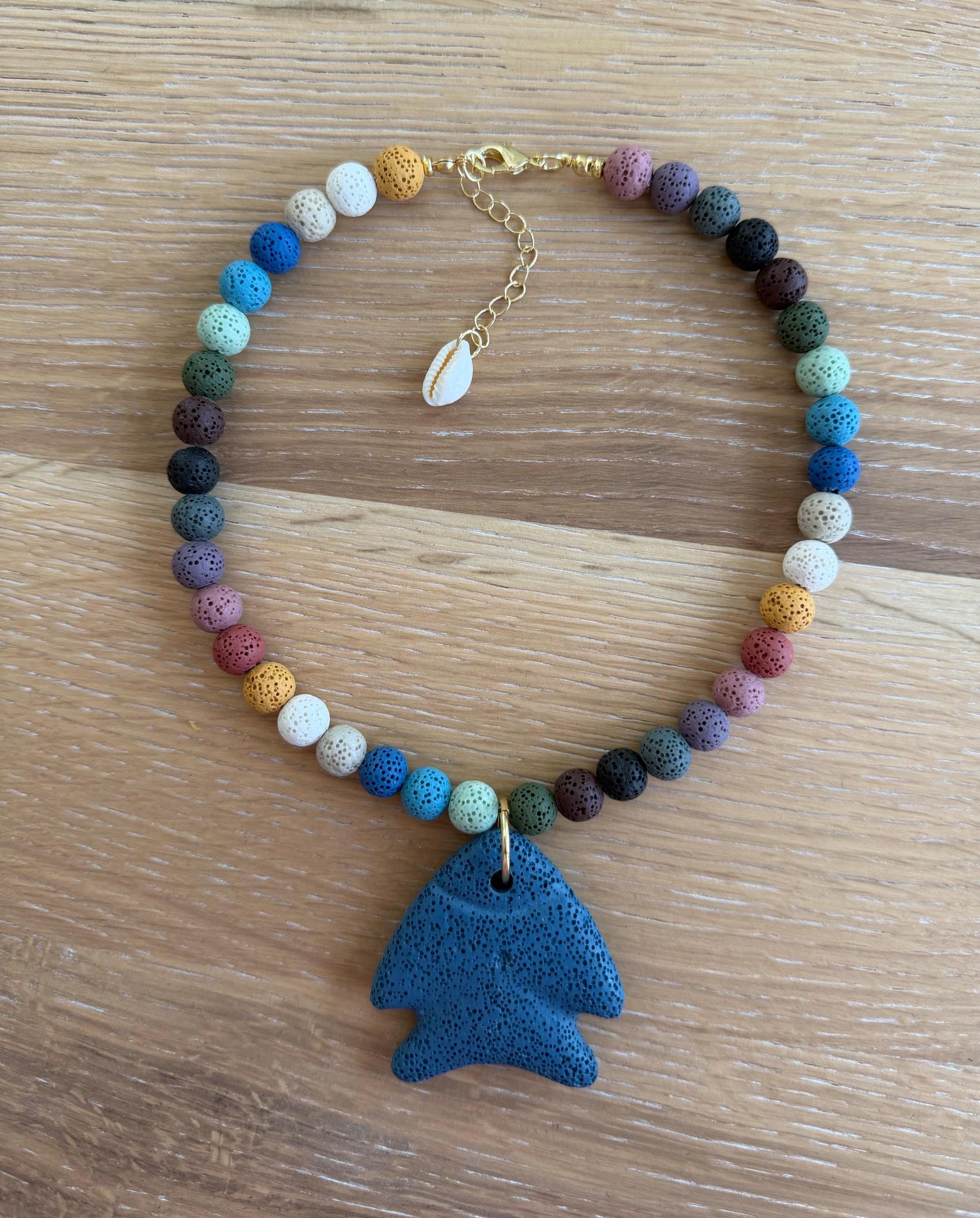This handcrafted necklace features a strand of naturally textured lava stone beads in a soft, multicolor palette—bringing warmth, depth, and an effortless beachy feel to any look. At the center, a sculptural fish pendant adds a playful, ocean-inspired focal point.