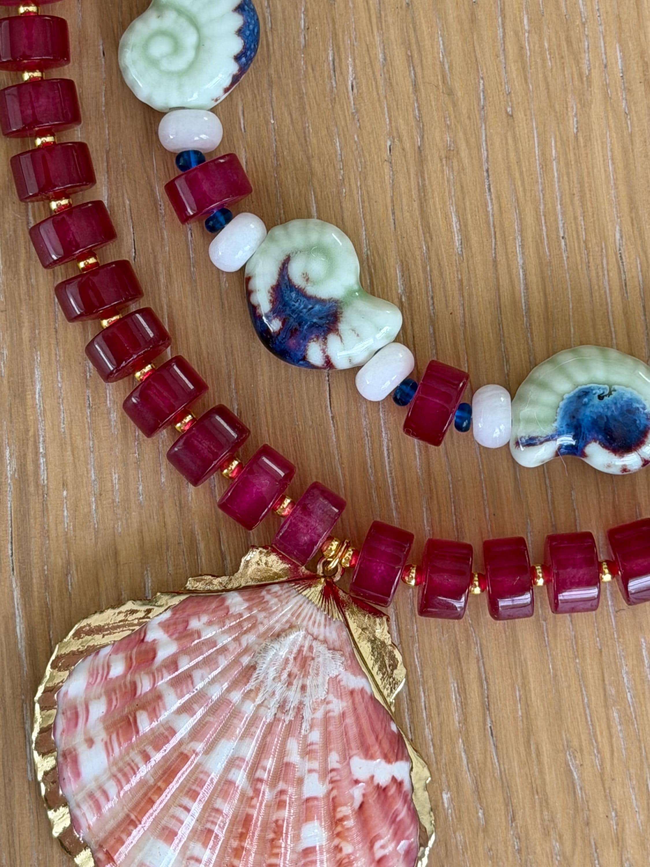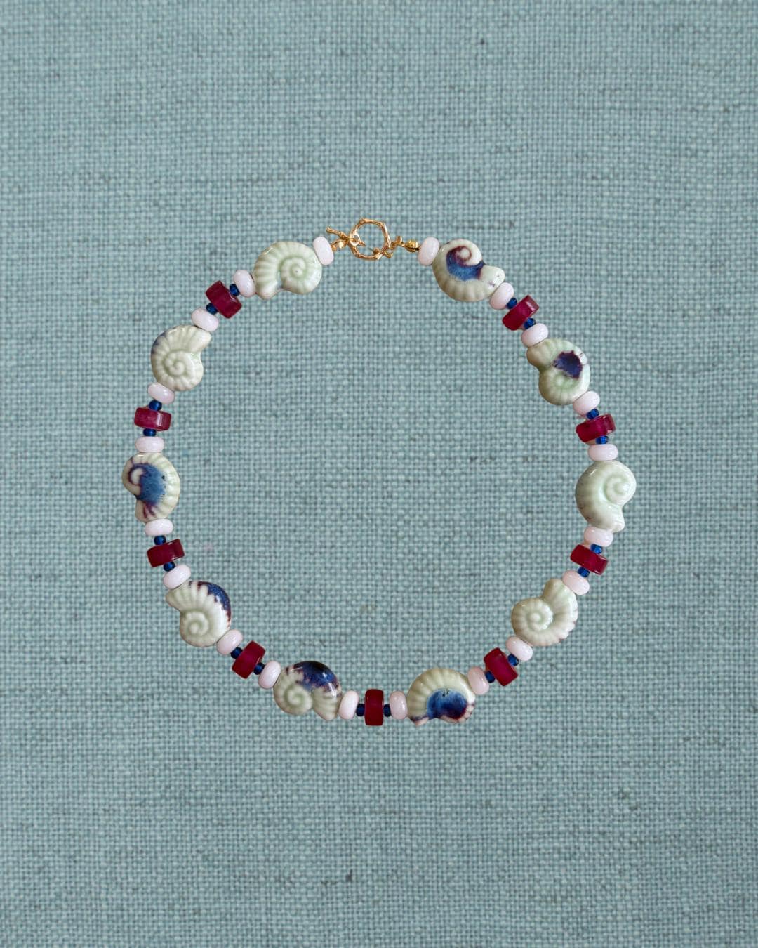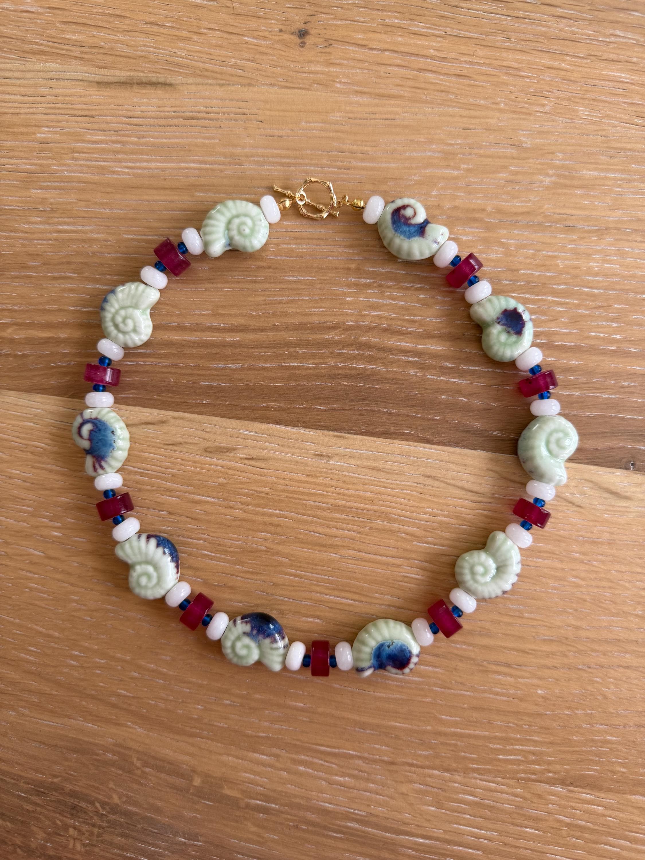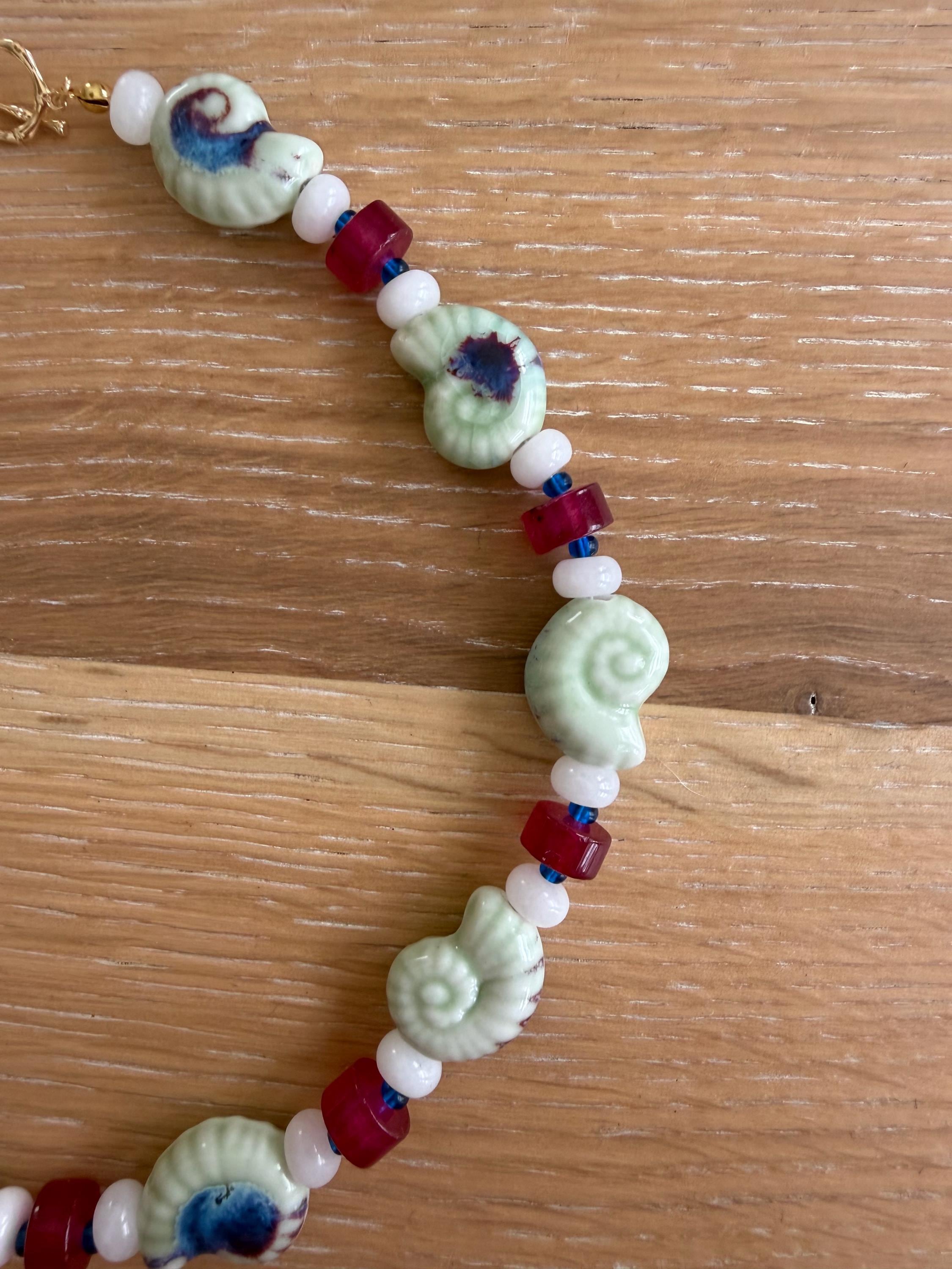 • Materials: Light green ceramic snail shell beads, white rondelle beads, magenta jade wheel beads & blue Czech beads