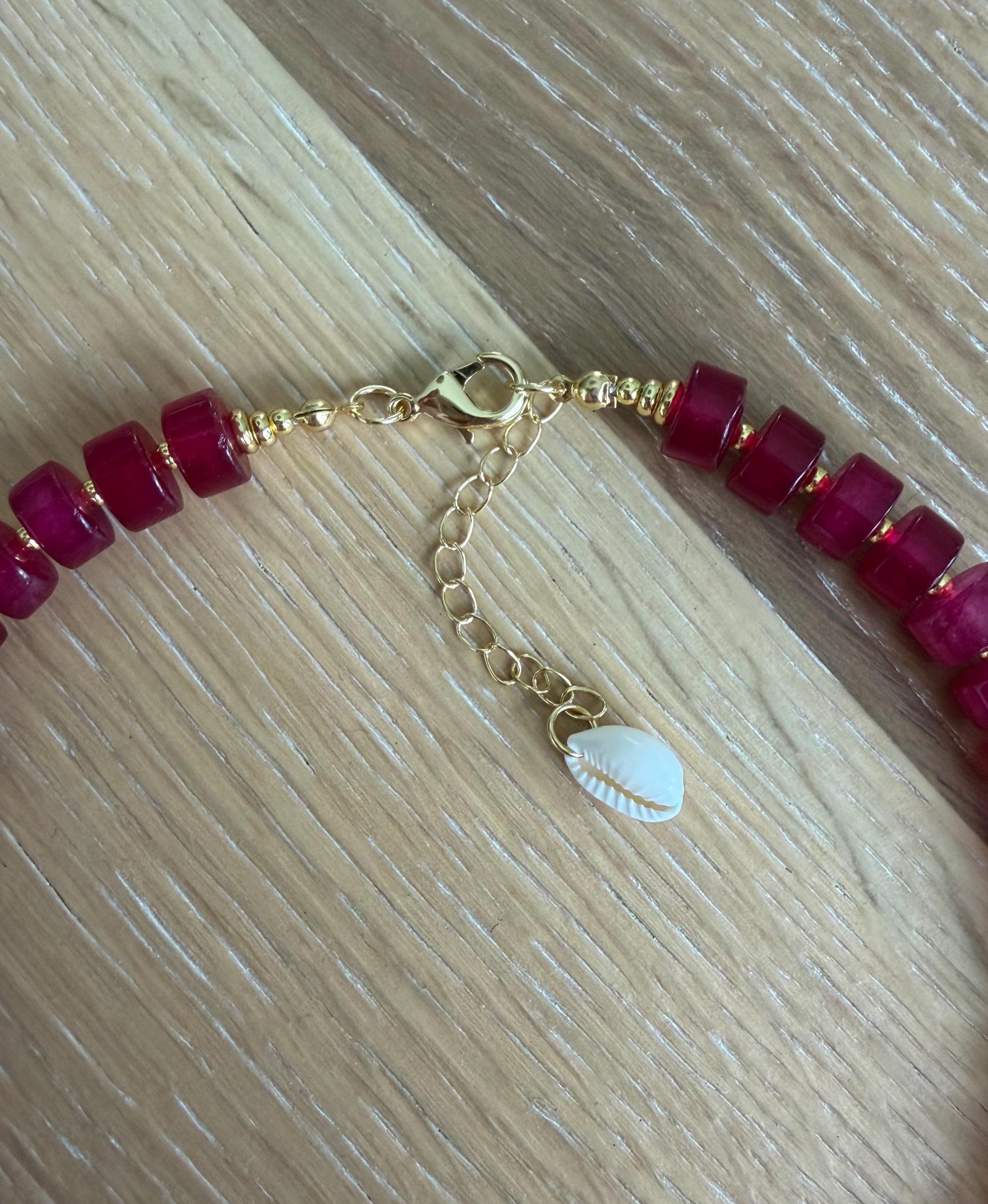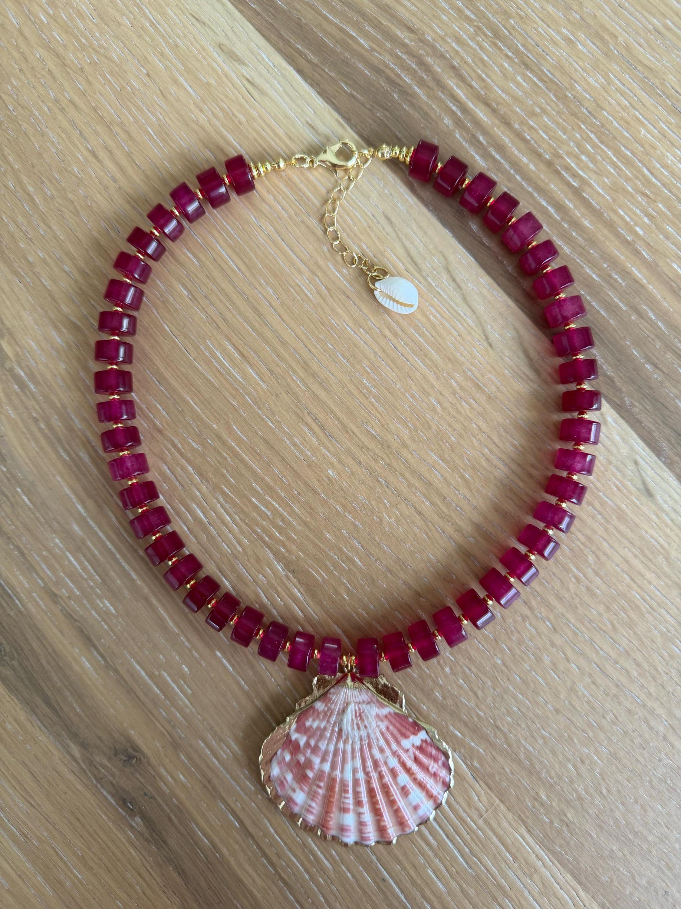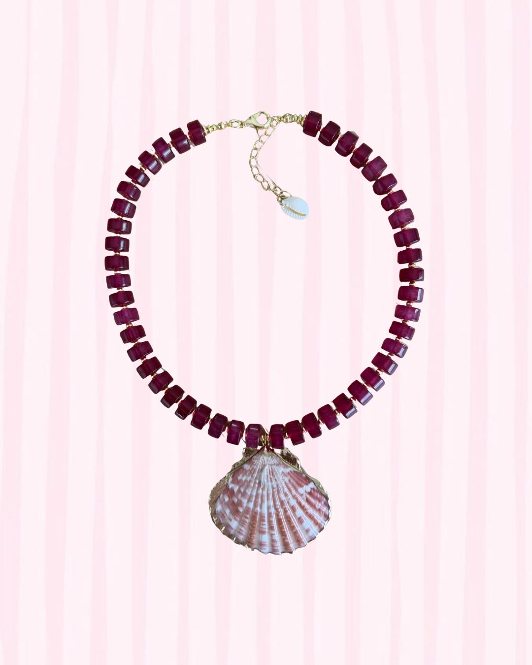 This necklace features rich jade beads paired with gold-plated accents, finished with a striking foil scallop shell pendant that catches the light beautifully. The deep berry hue adds warmth and depth, while the shell brings in that effortless, ocean-inspired feel.