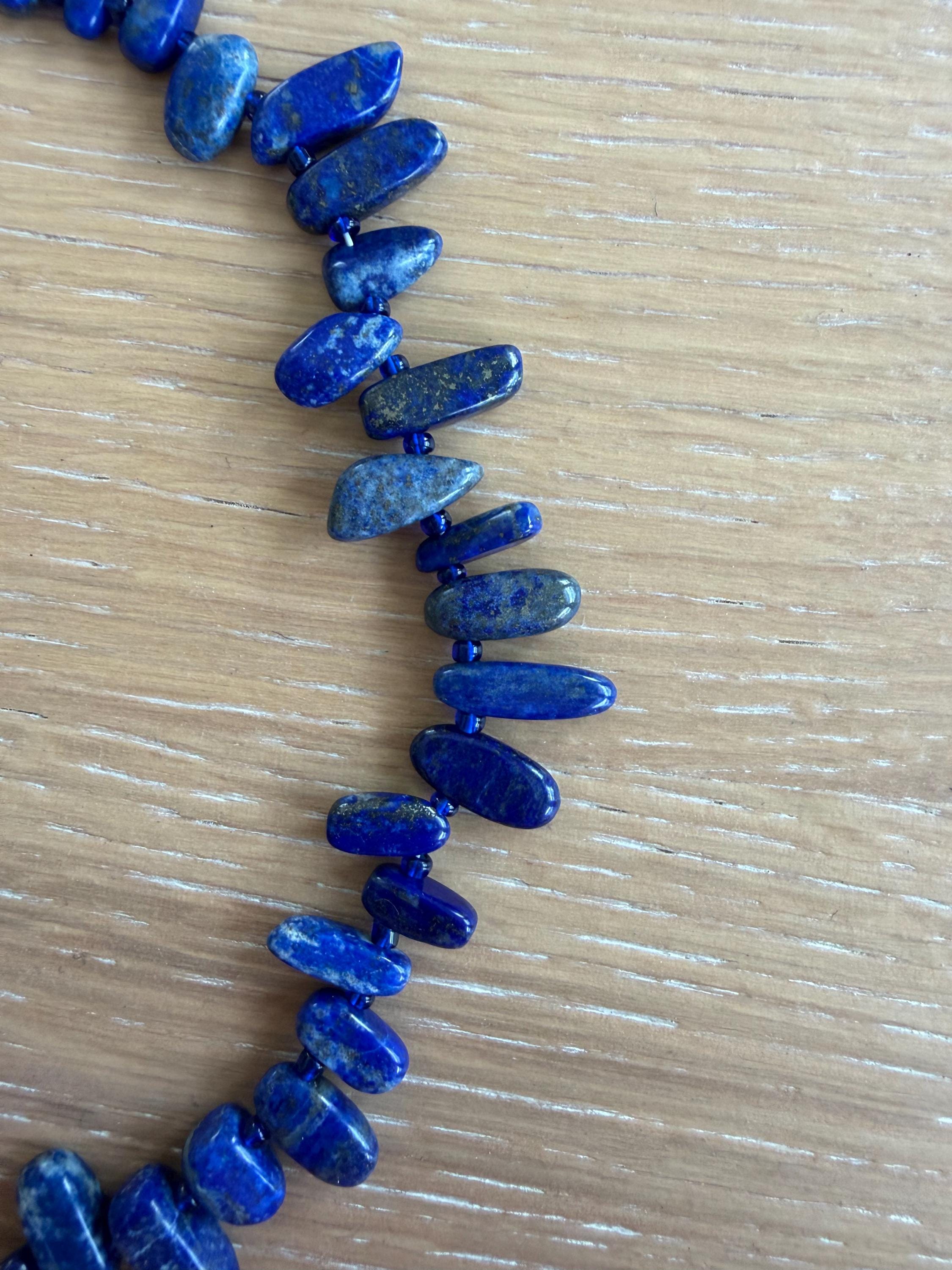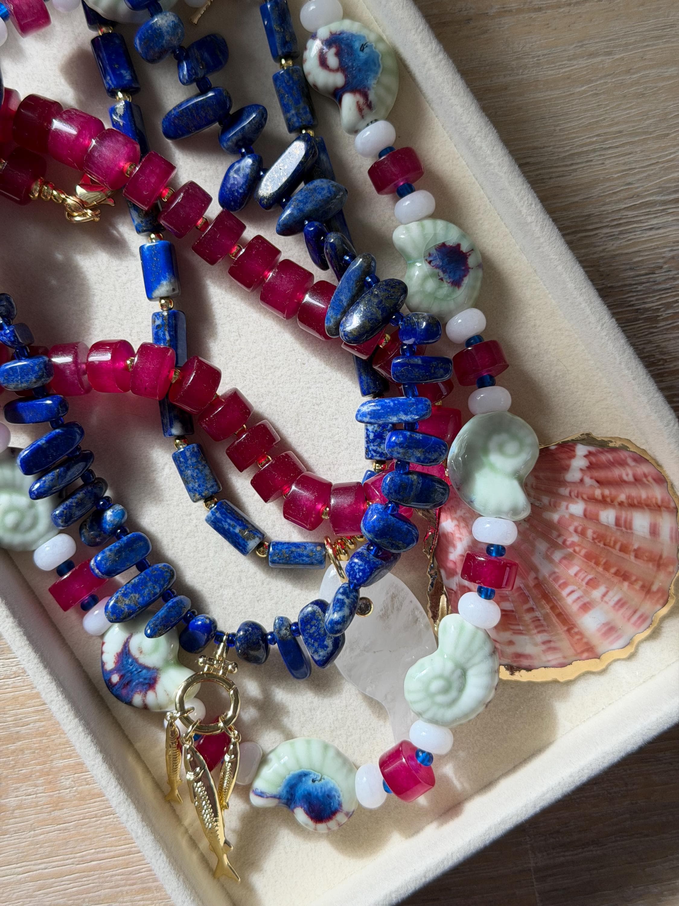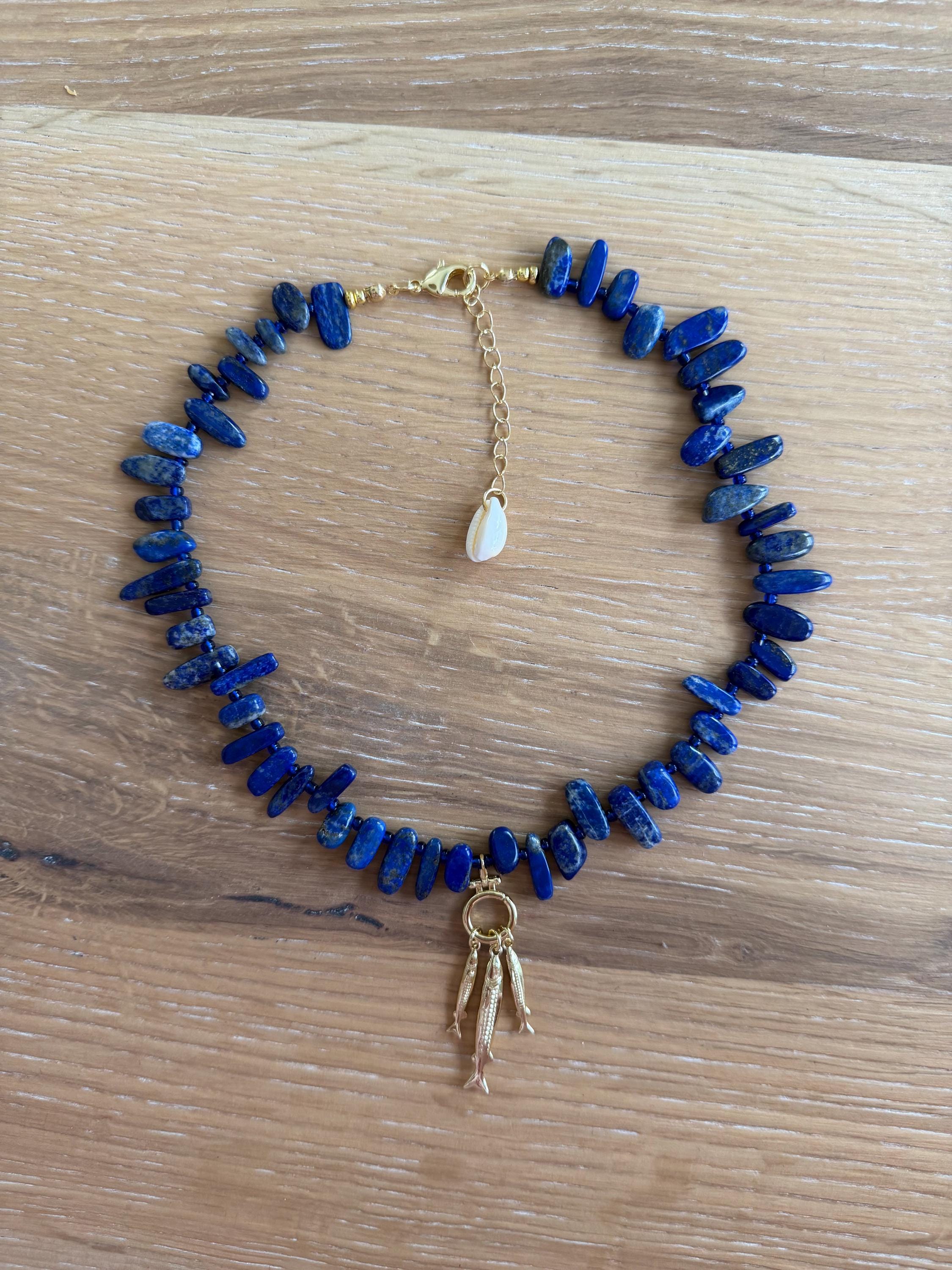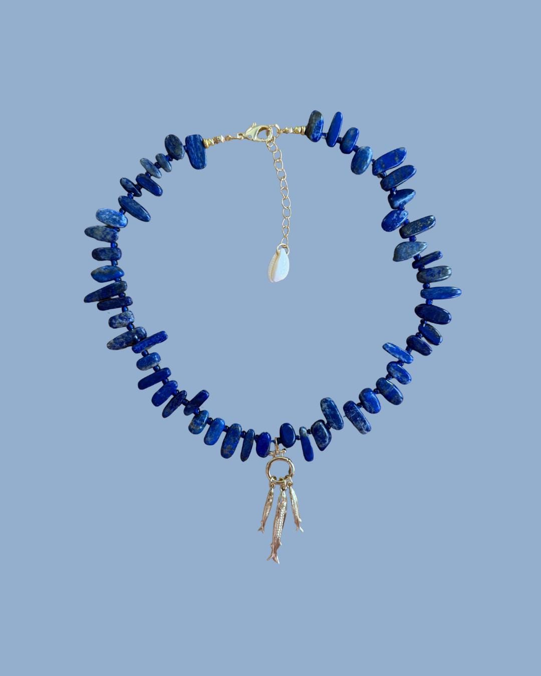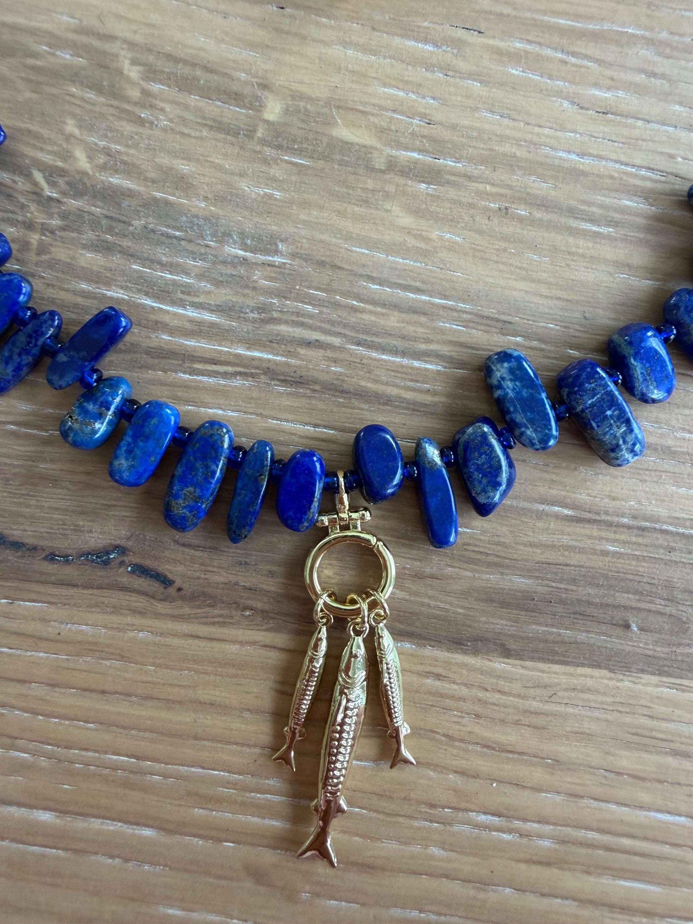 This strand is made with rich lapis chip nuggets, each one unique in shape, like stones worn smooth by saltwater and time. Three dainty fisherman fish hang delicately throughout the necklace, adding just the right amount of movement and story—like a quiet nod to early mornings on the water and lines cast out past the tide.