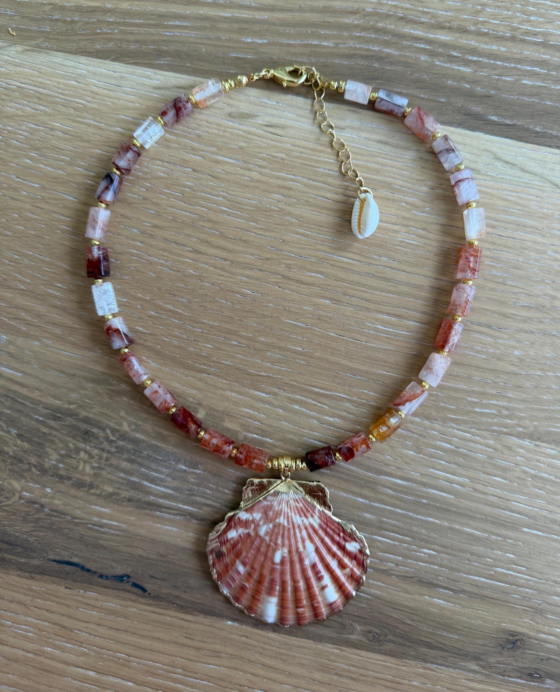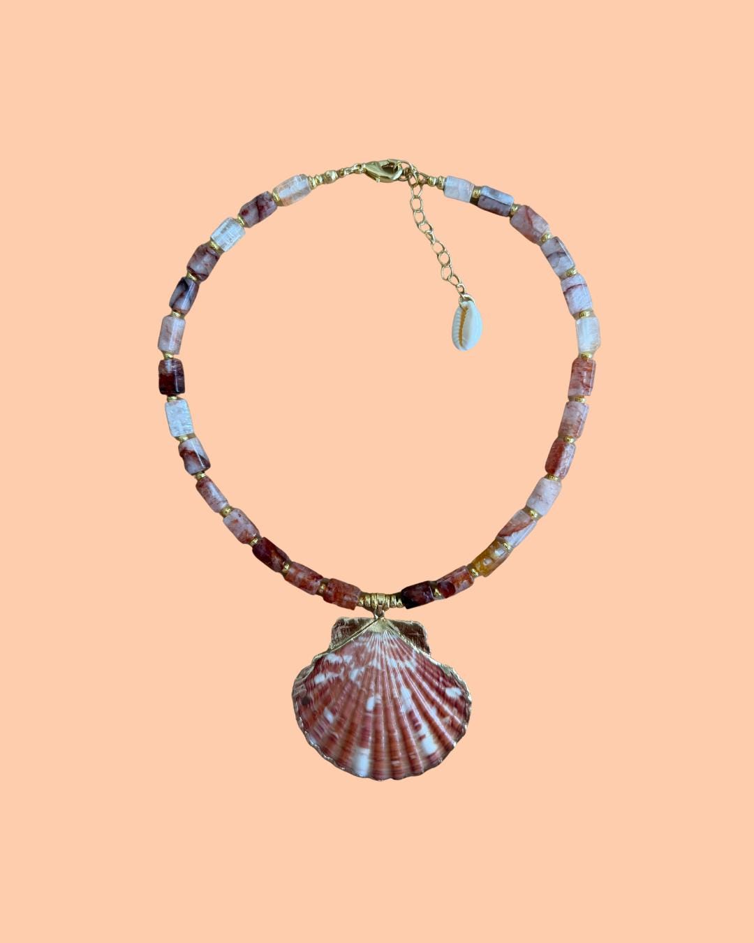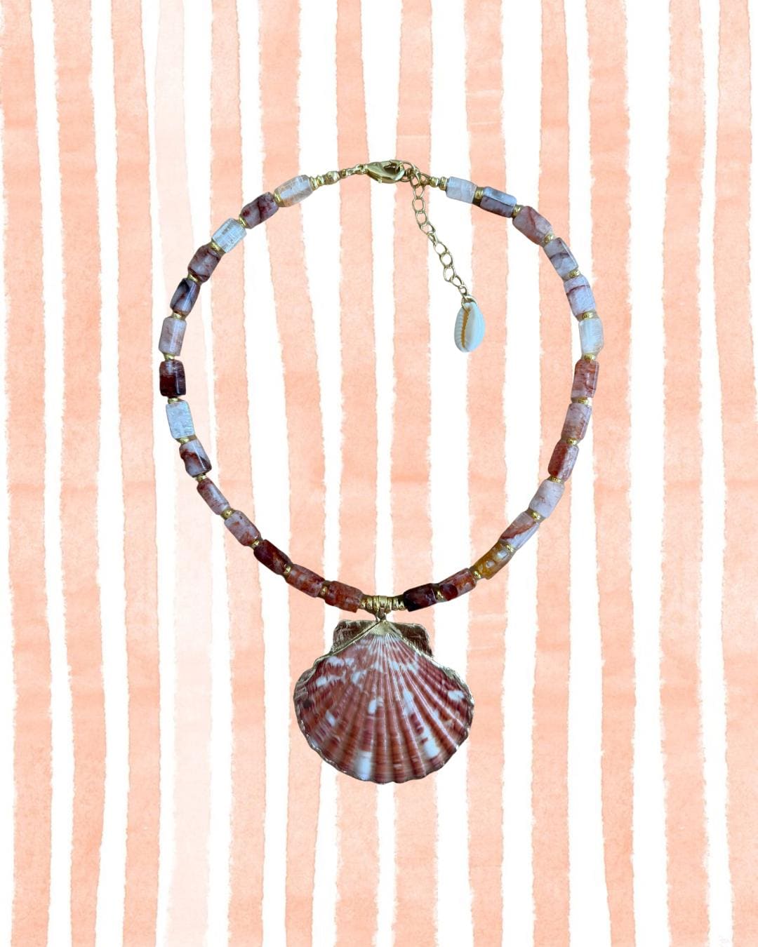 At the center hangs a delicate foil scallop shell pendant, catching the light with every movement. The soft shimmer of gold pairs beautifully with the earthy warmth of the quartz, creating a piece that feels equal parts coastal and elevated.