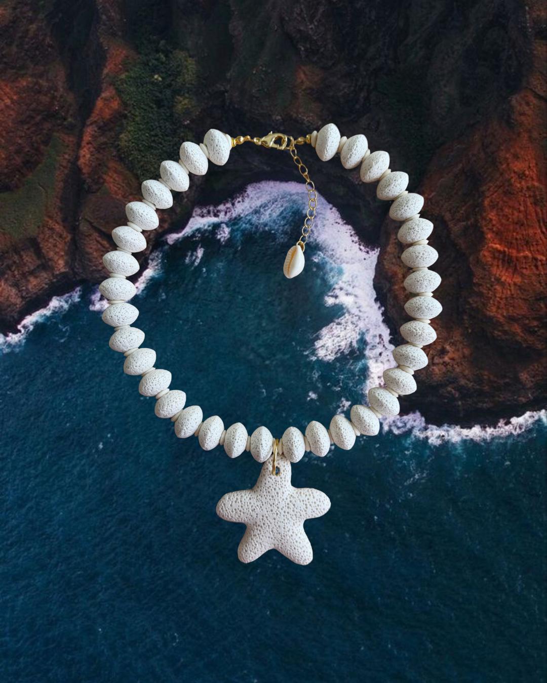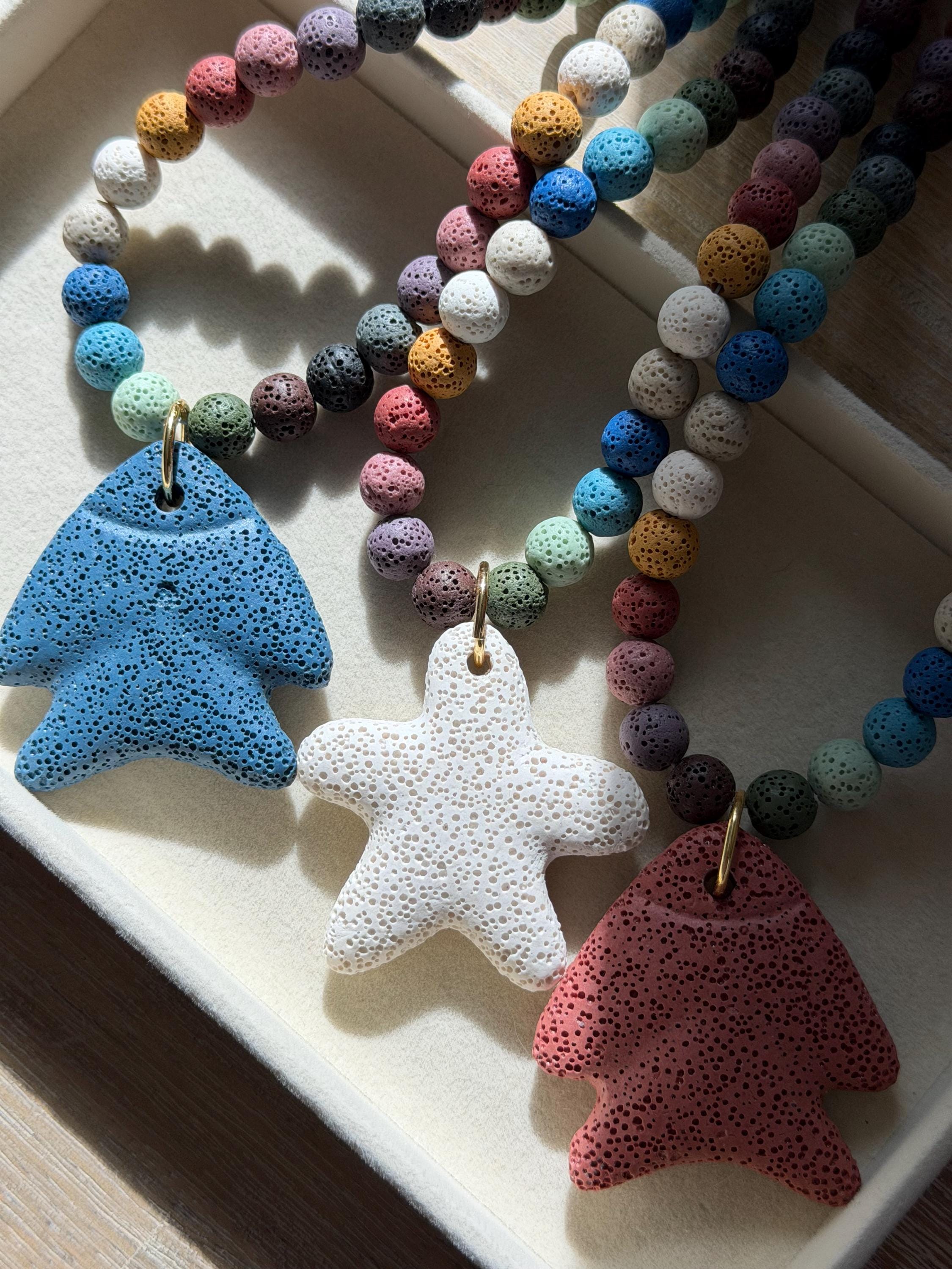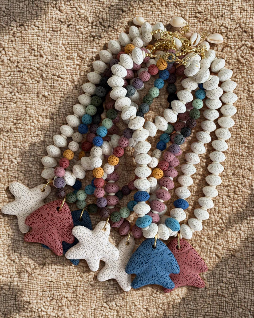 Each necklace is hand-strung from textured lava beads and finished with coastal-inspired pendants and sun-kissed accents. The collection features: