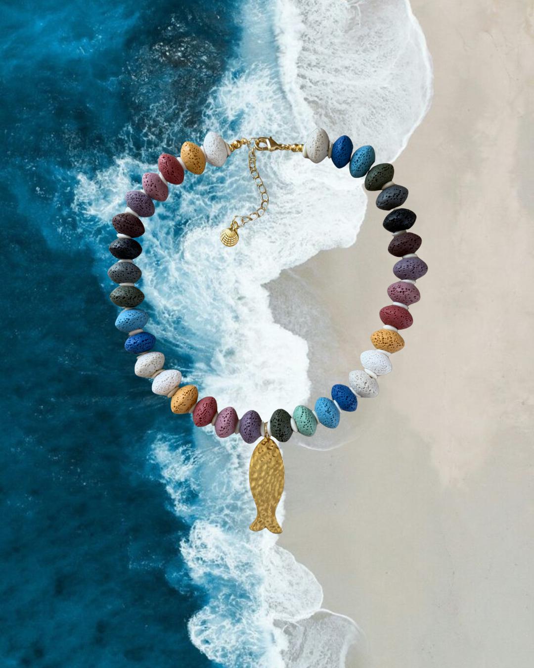 🌋 Molten Current – The hero piece, bold rainbow lava beads with a gold fish pendant. This necklace set the tone for the collection.